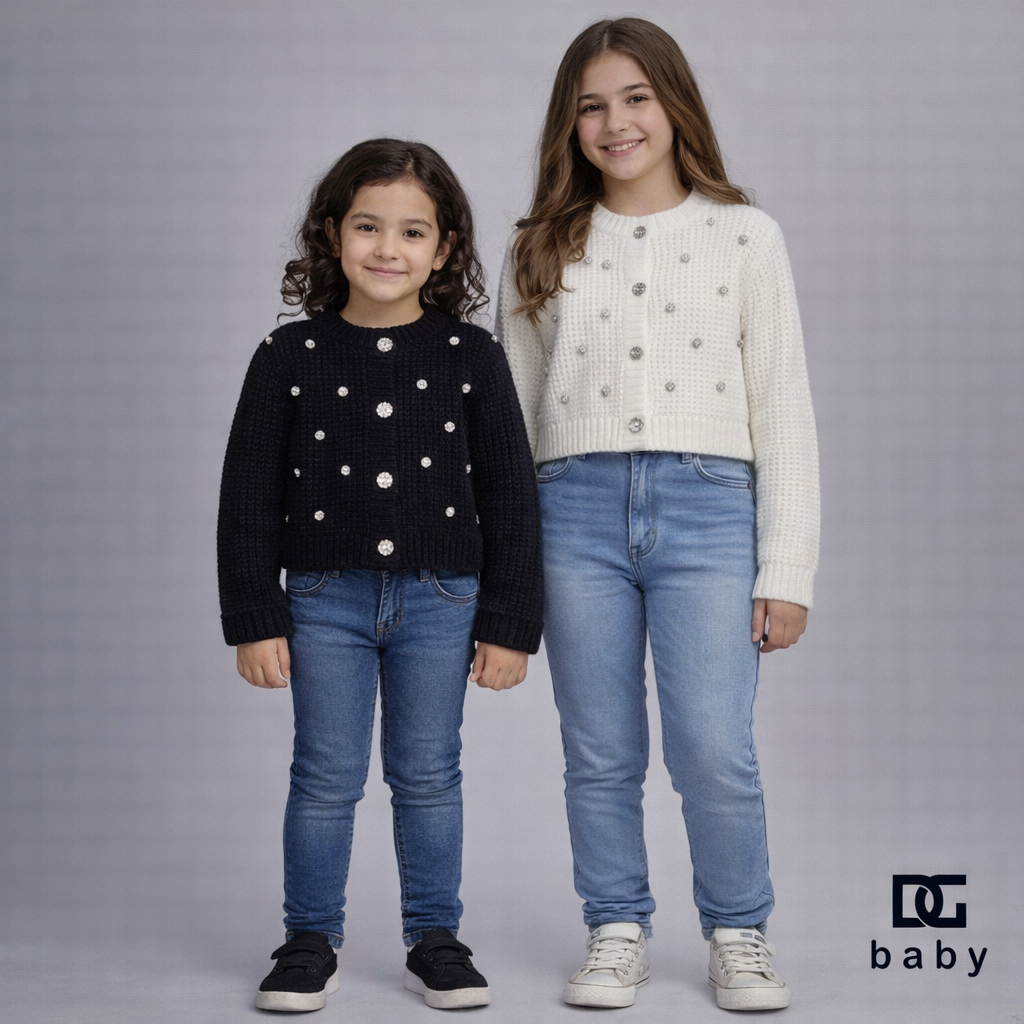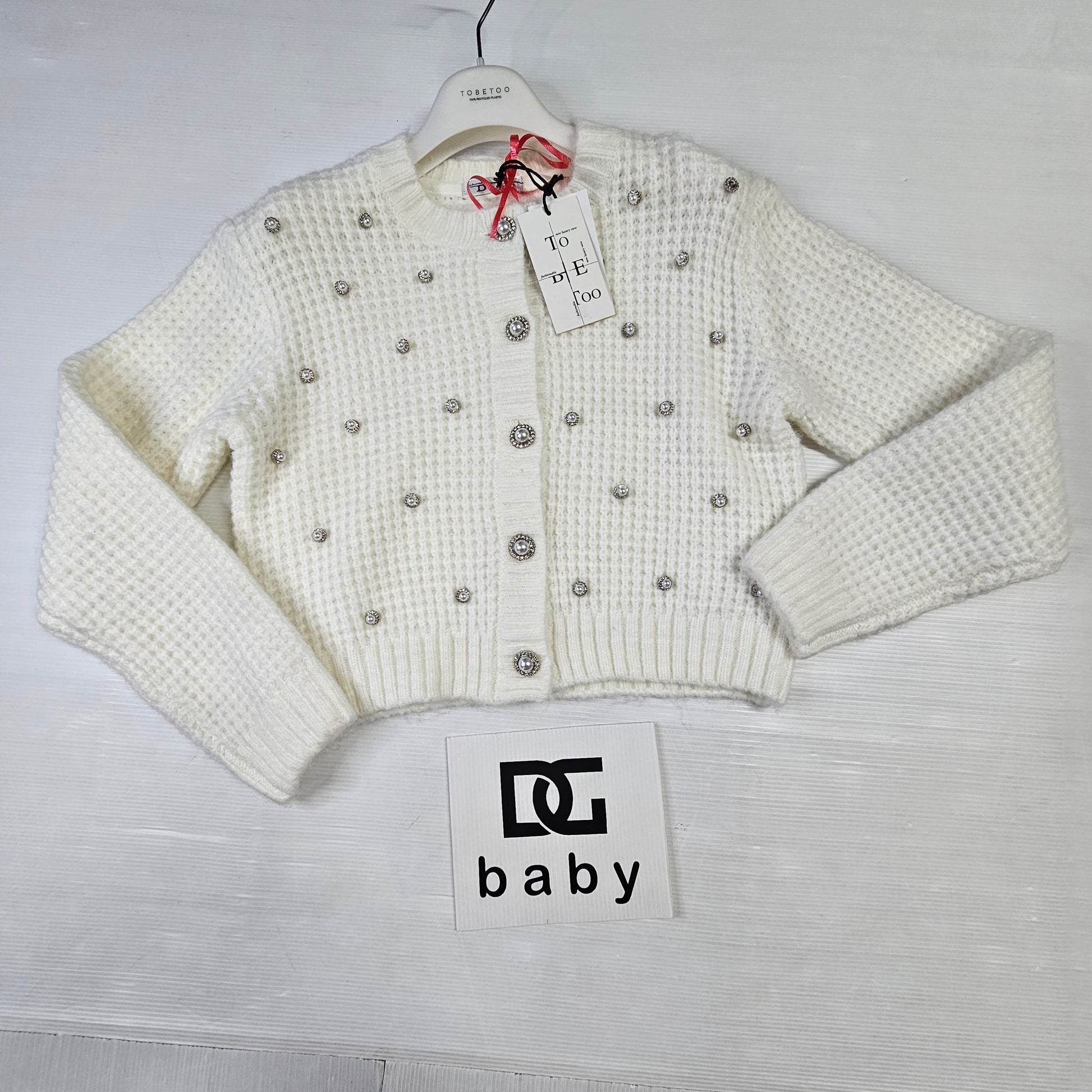 Cardigan TOBETOO in maglia lavorata, impreziosito da applicazioni effetto perla distribuite su tutto il capo e bottoni gioiello frontali. Modello corto, caldo e confortevole, ideale per completare outfit eleganti o casual chic nella stagione invernale.