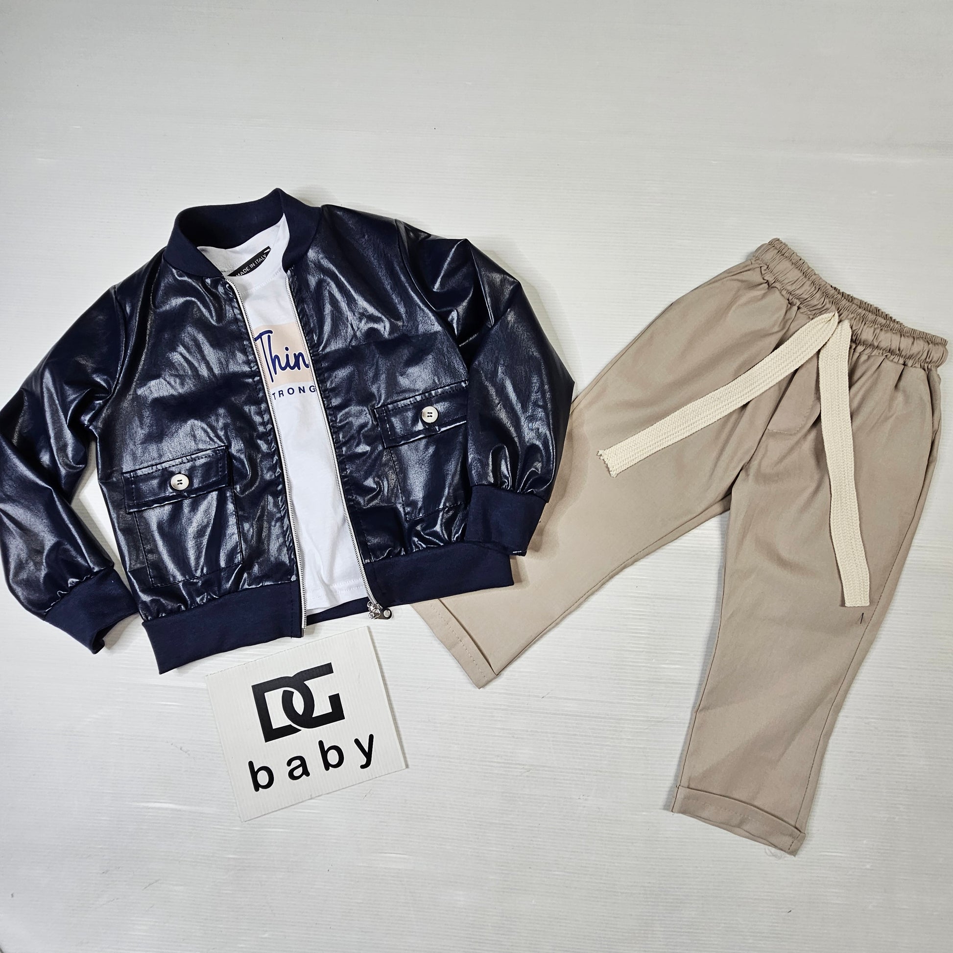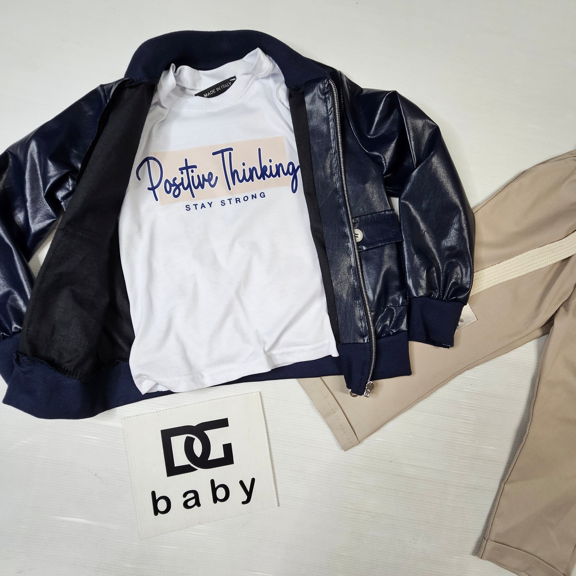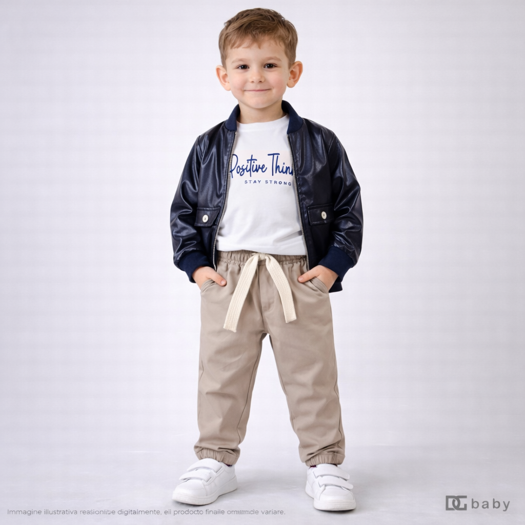 Completo bambino composto da giacca effetto pelle, t-shirt con stampa “Positive Thinking” e pantalone con elastico. Look moderno ed elegante, perfetto per occasioni speciali e outfit alla moda.