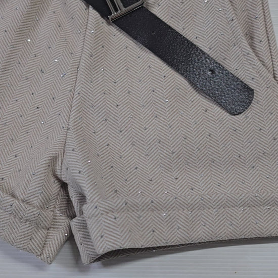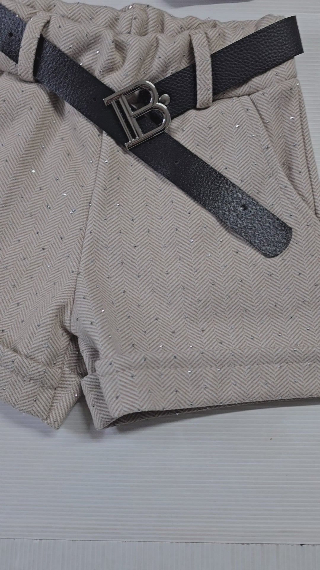 Completo bambina composto da maglia crop a maniche lunghe con stampa leopardata e shorts eleganti color beige con cintura inclusa. Tessuti morbidi e confortevoli, perfetto per look grintosi e chic