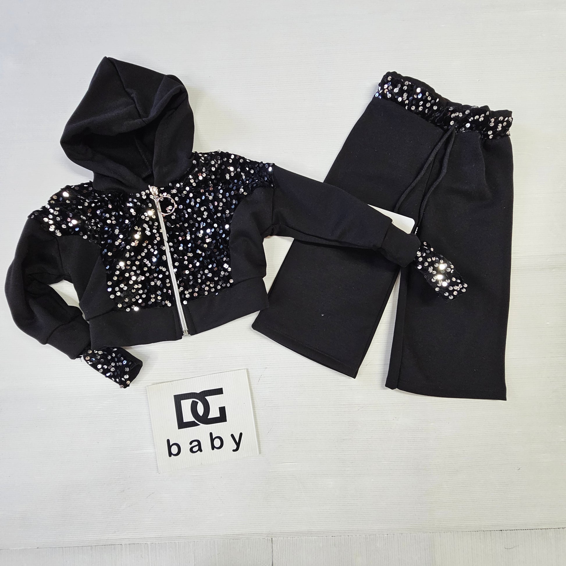 Completo neonata sport-chic con felpa cropped e cappuccio arricchita da paillettes luccicanti ✨ e pantalone coordinato con dettaglio brillante in vita. Morbido, comodo e super glam — perfetto per le piccole stelle dello stile 🌟
