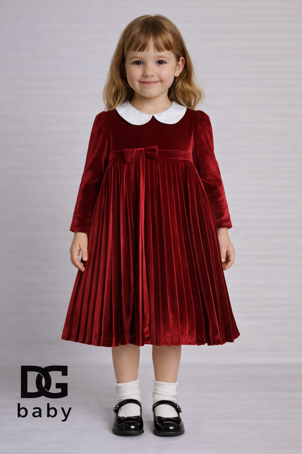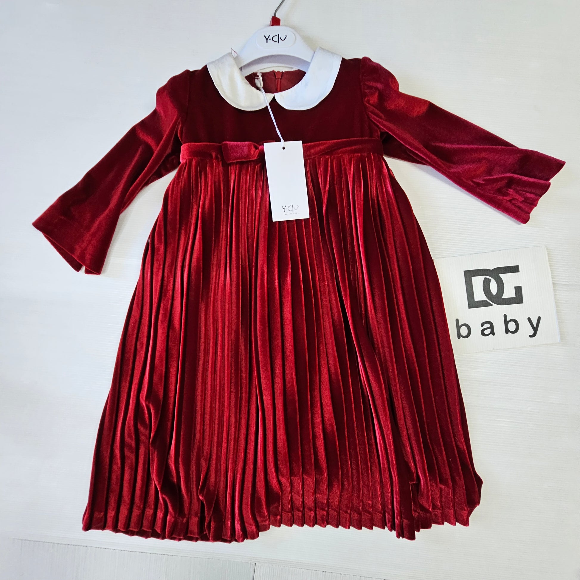 Abito bambina in morbido velluto bordeaux con elegante gonna plissé e colletto bianco a contrasto. Maniche lunghe e linea leggermente ampia sul corpo per una vestibilità comoda e raffinata, ideale per cerimonie e occasioni speciali invernali.