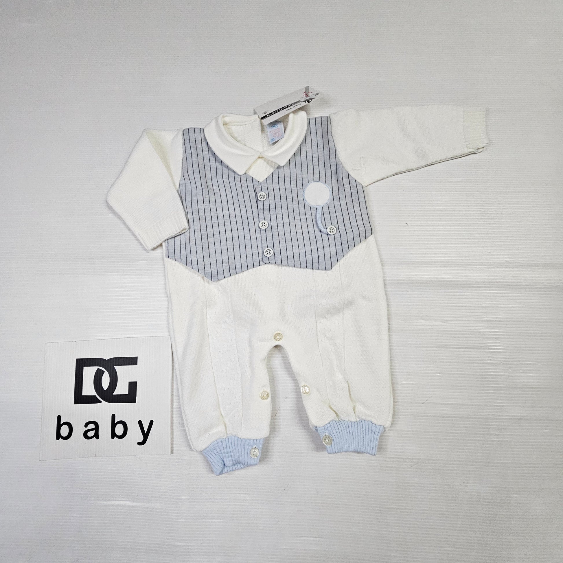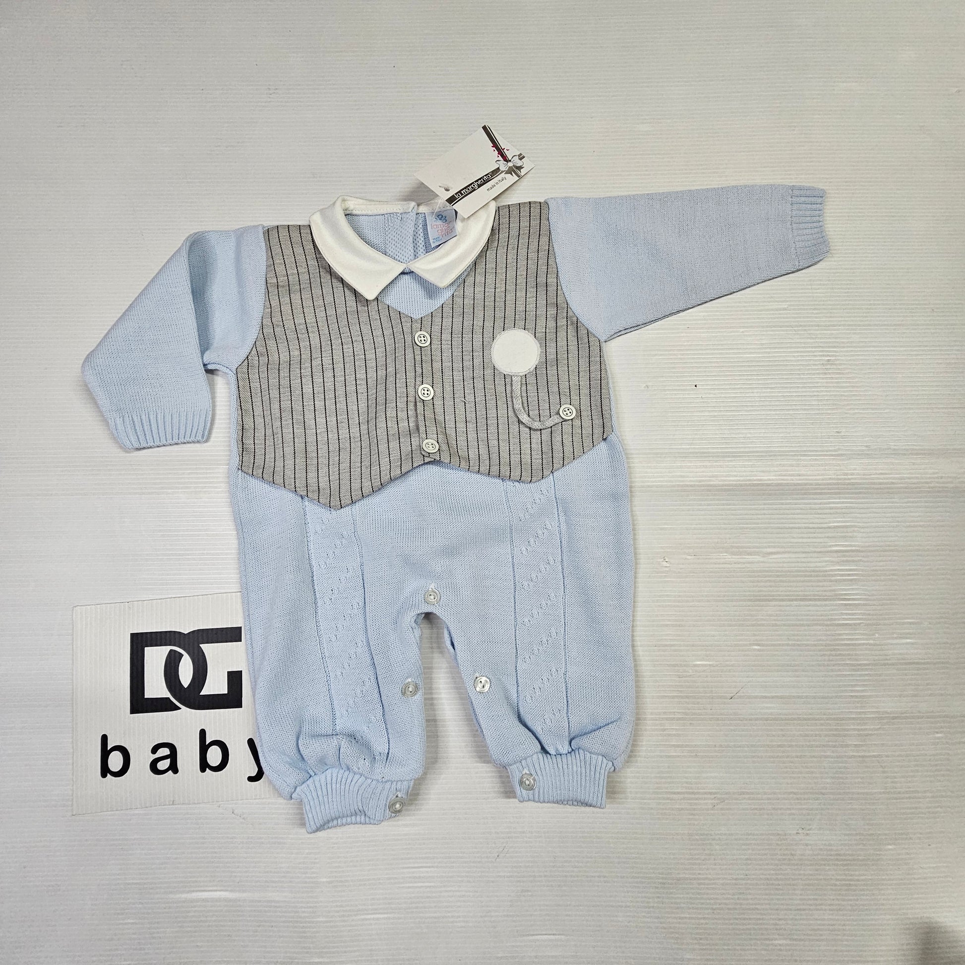 Tutina neonato in maglia dal gusto raffinato, con colletto classico, gilet effetto sartoriale e dolce dettaglio a palloncino.