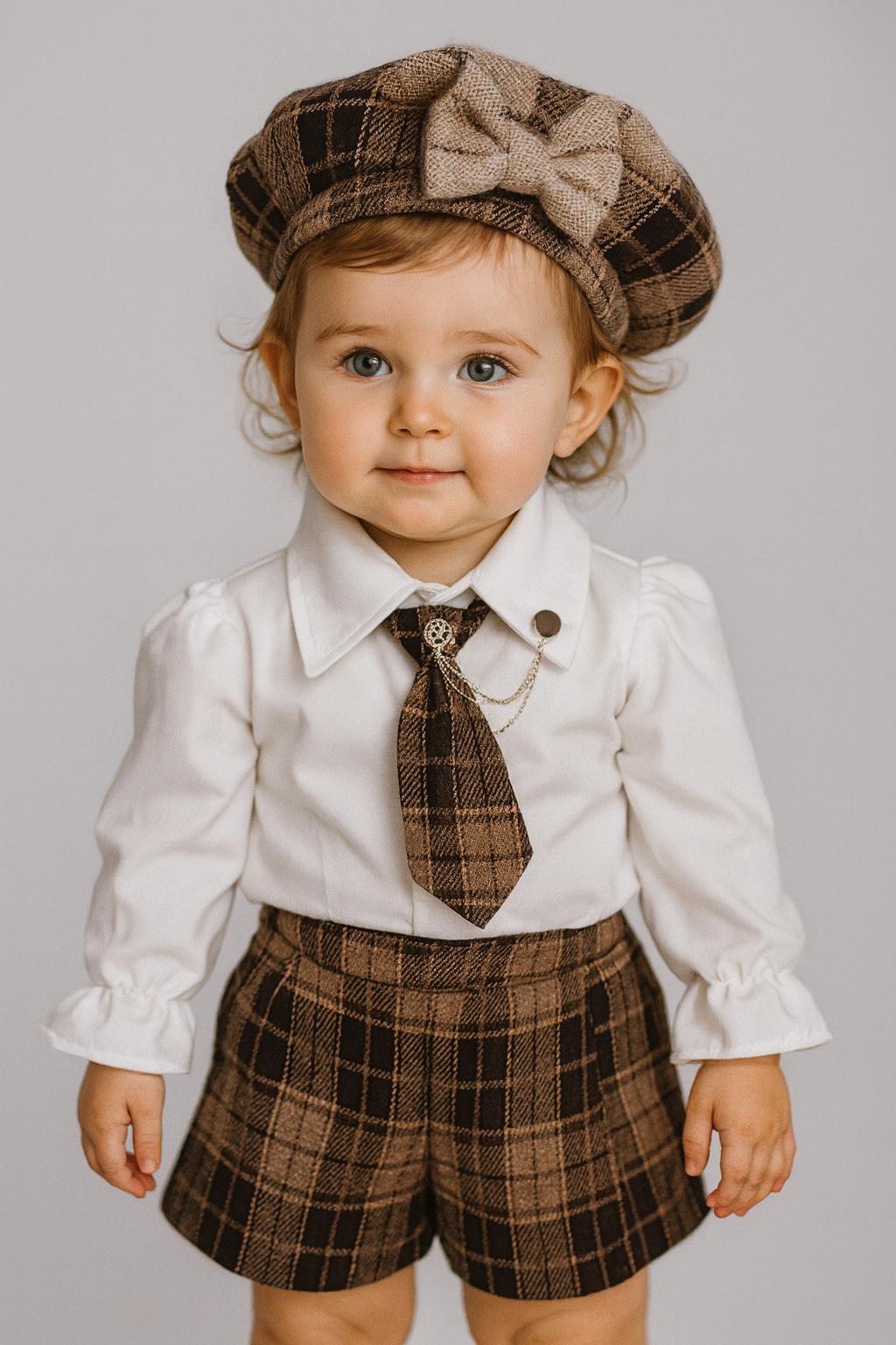 Completo neonata raffinato con camicia bianca e shorts a pieghe in tessuto scozzese, impreziosito da cravattina coordinata 🎀. Un look elegante e moderno per ogni occasione speciale!