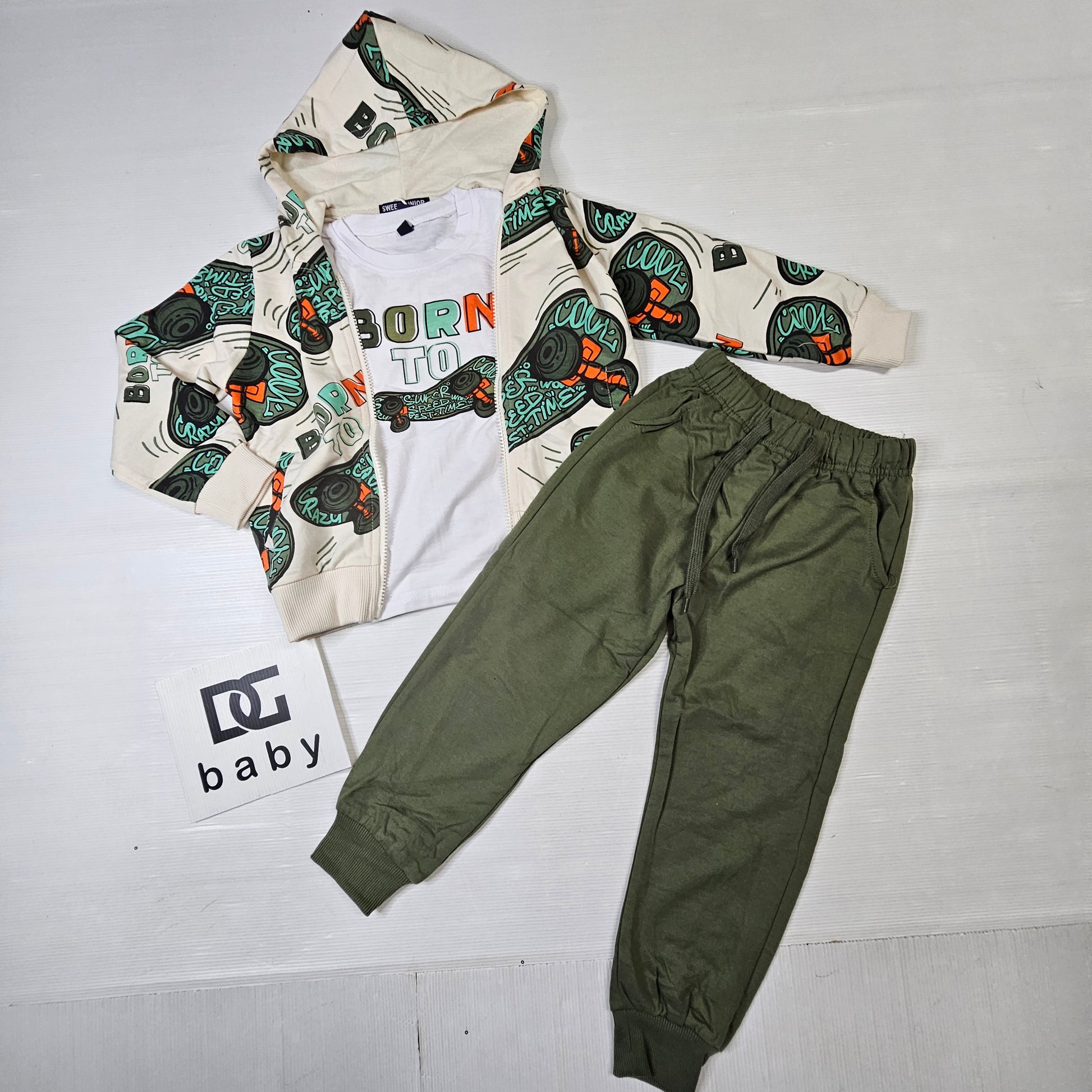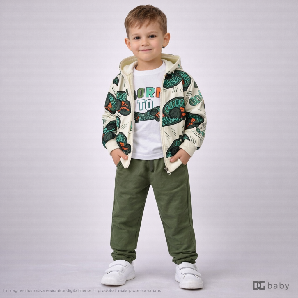 Completo bambino composto da felpa con cappuccio stampata, t-shirt “Born To” e pantalone con elastico. Look sportivo e dinamico, perfetto per tutti i giorni.