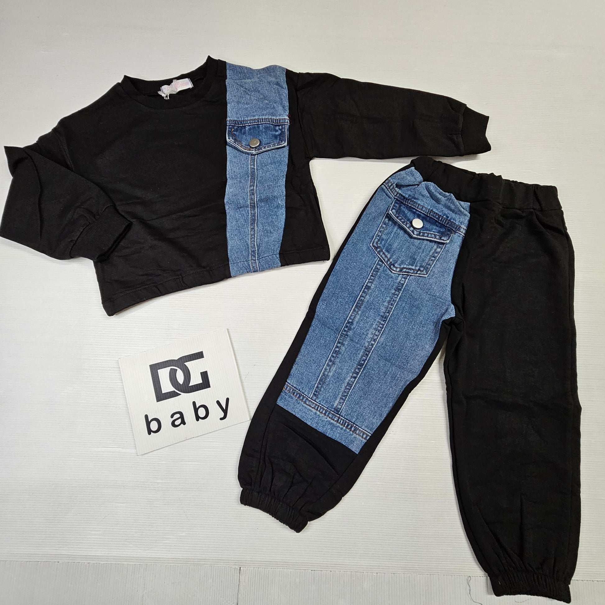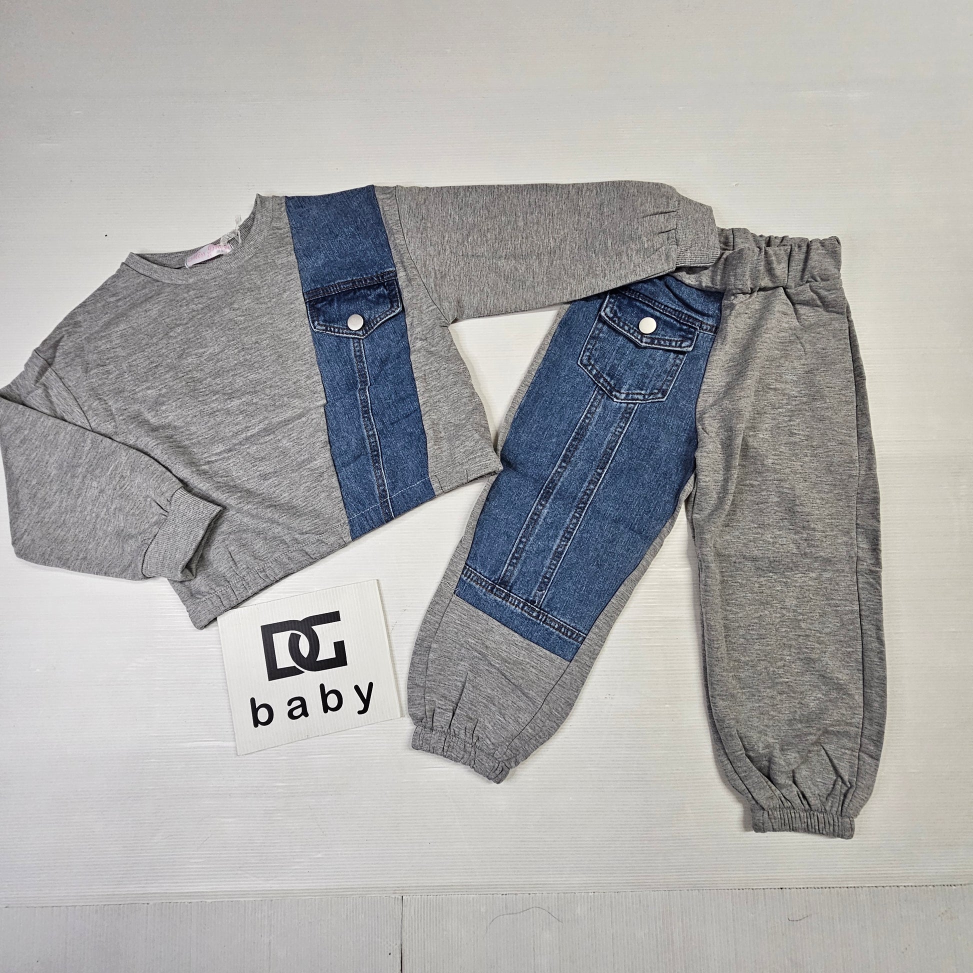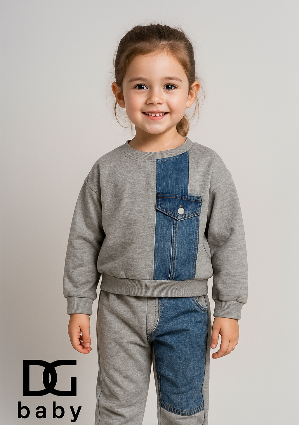 Tuta bambina ragazza sporty-fashion con inserti denim e taschina decorativa, perfetta per look comodi ma super stilosi in città!