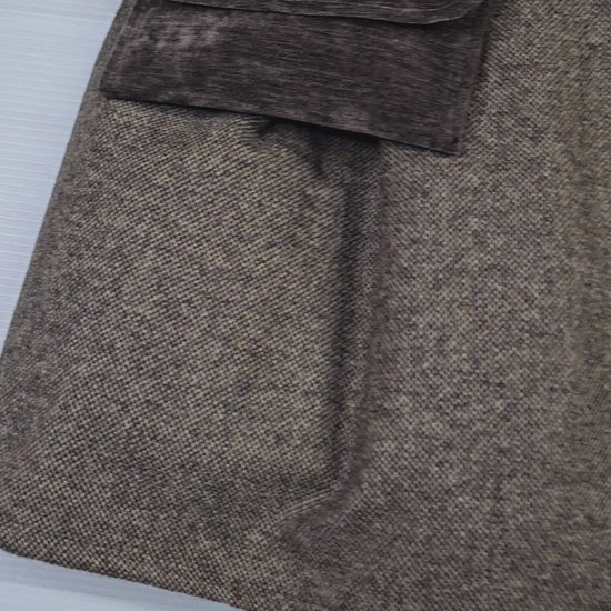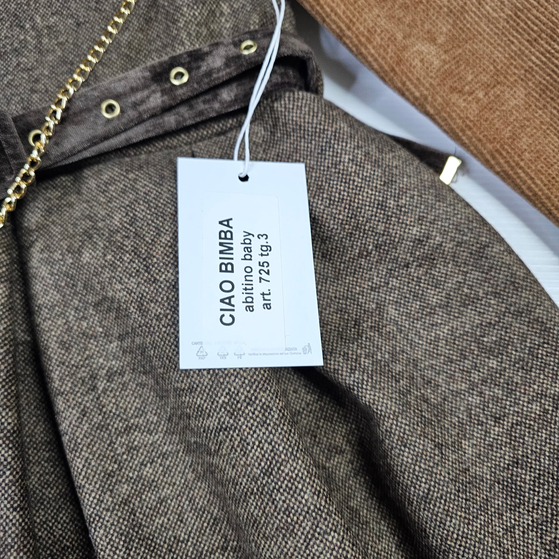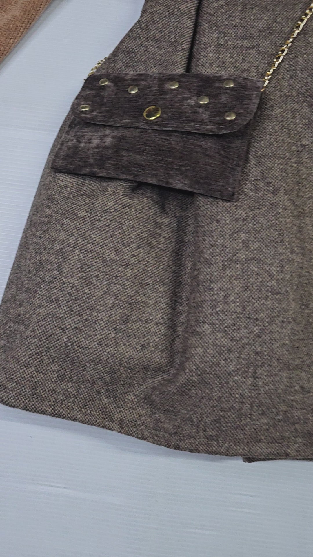 Abitino in tessuto tweed con maglia coordinata, cintura in velluto e borsetta con catena. Un look raffinato e caldo, perfetto per le occasioni speciali.