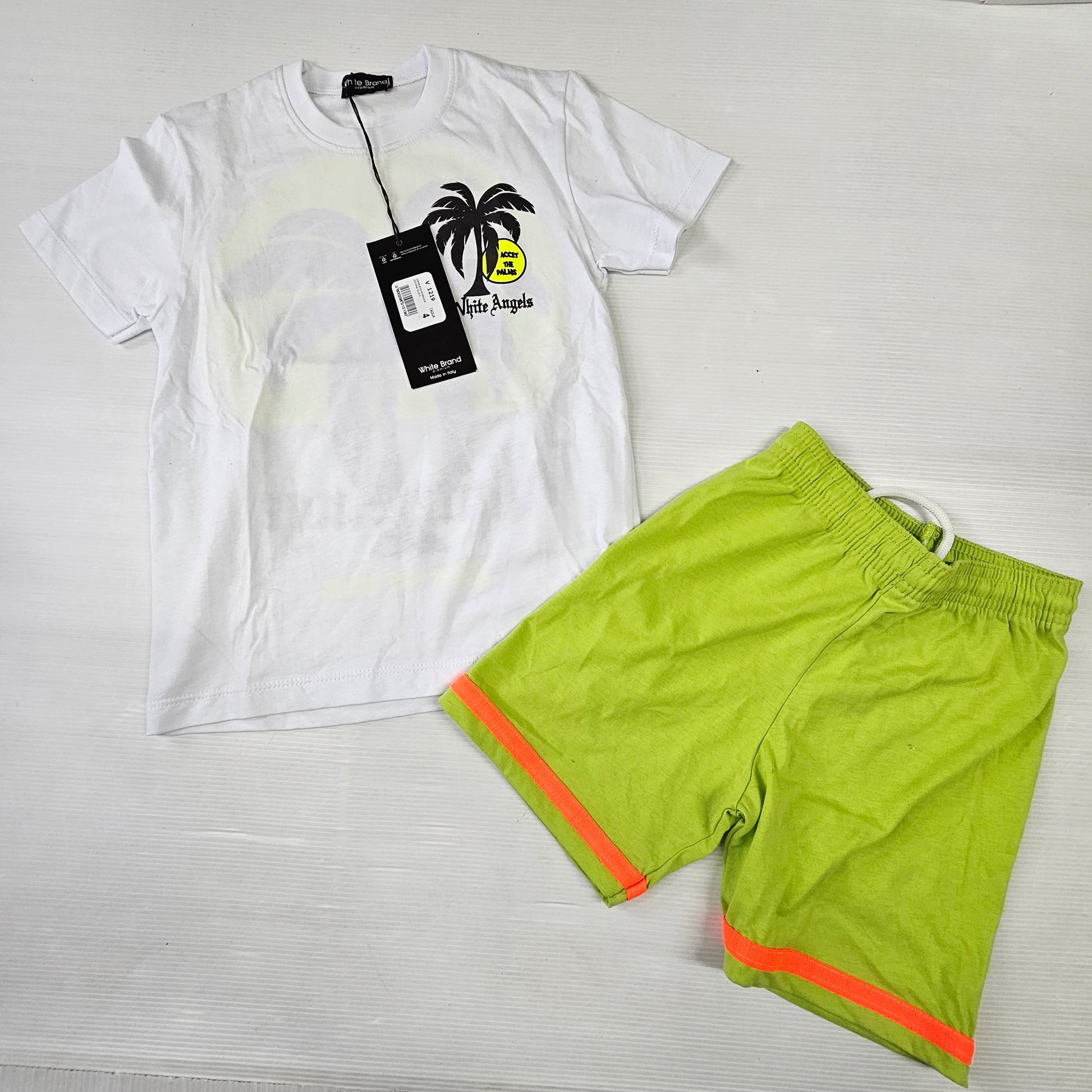 completo bambino ragazzo PALM PARADISE composto da maglietta mezza manica in cotone con stampa dietro e pantaloncino con elastico in vita