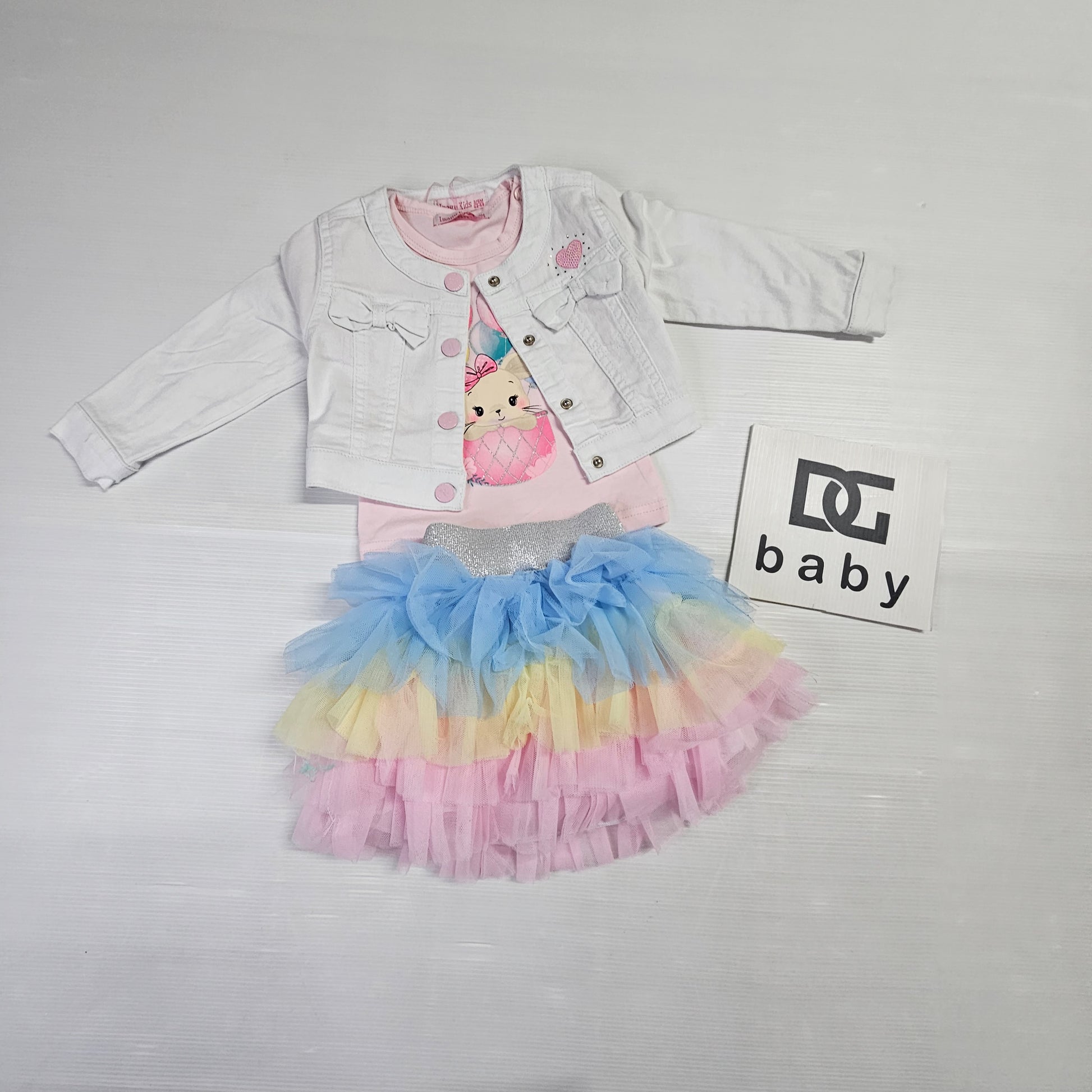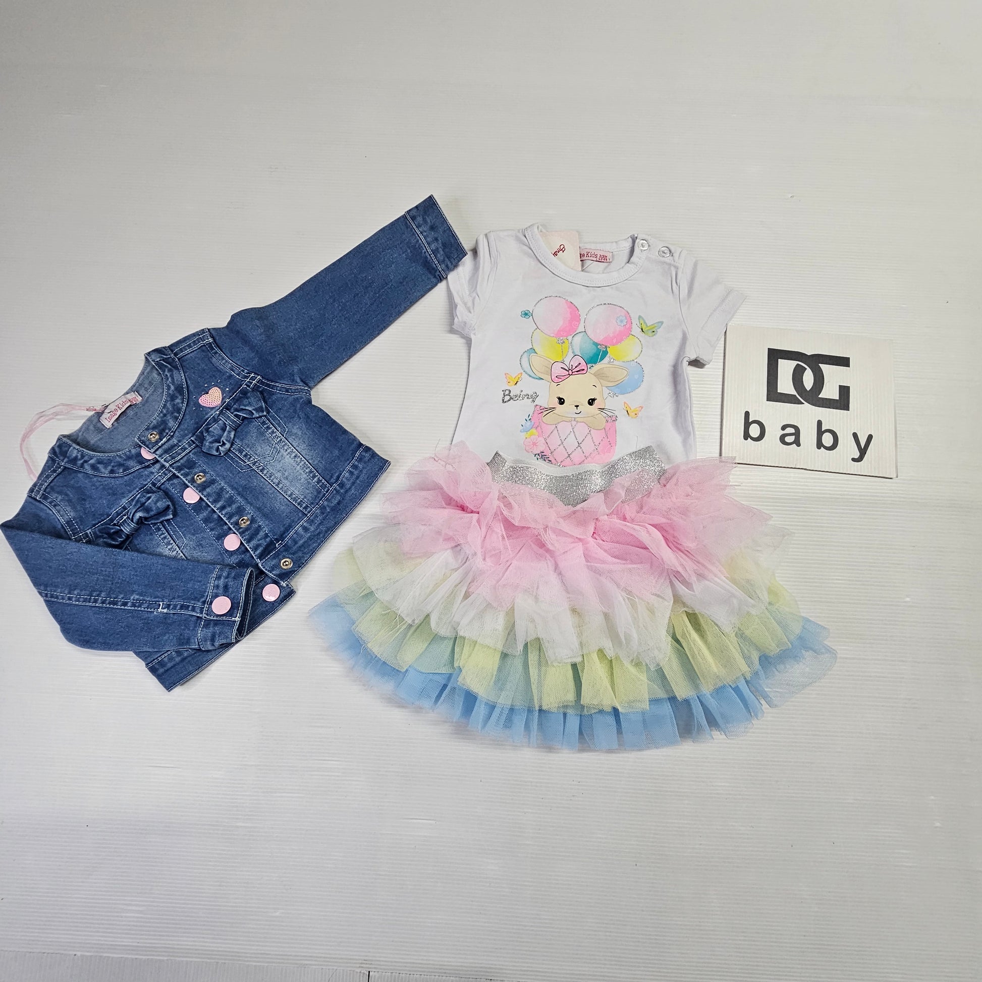 completo neonata BEING NEO composto da maglia girocollo mezza manica in cotone, gonnellina tulle colorata e giubbino jeans