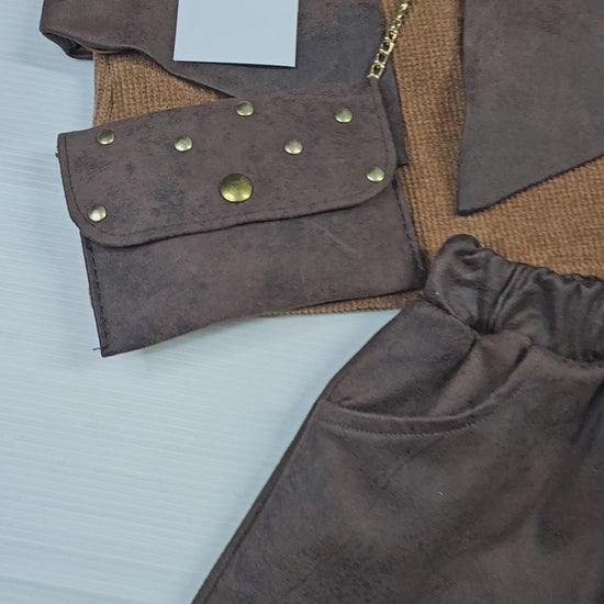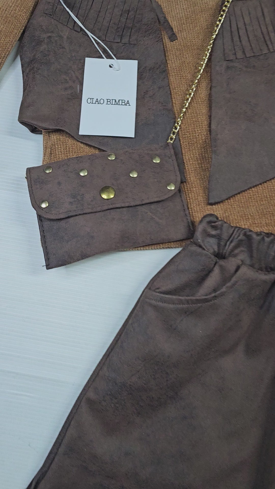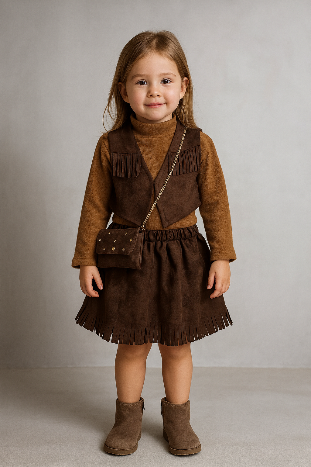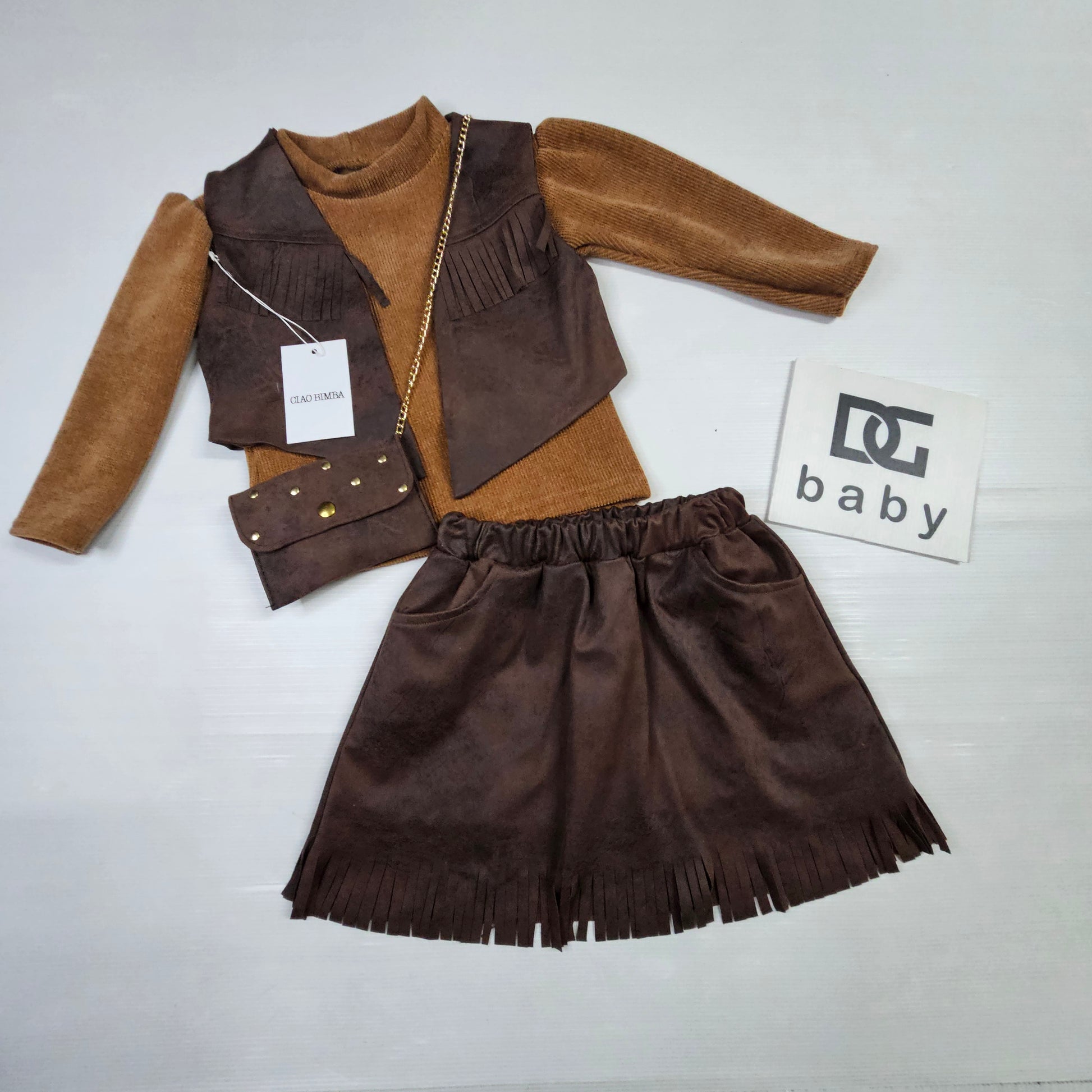 Completo in stile elegante composto da maglia in caldo cotone, gilet con frange, gonna morbida effetto scamosciato e borsetta coordinata. Ideale per look raffinati e alla moda.