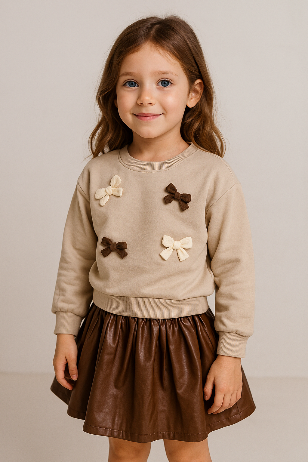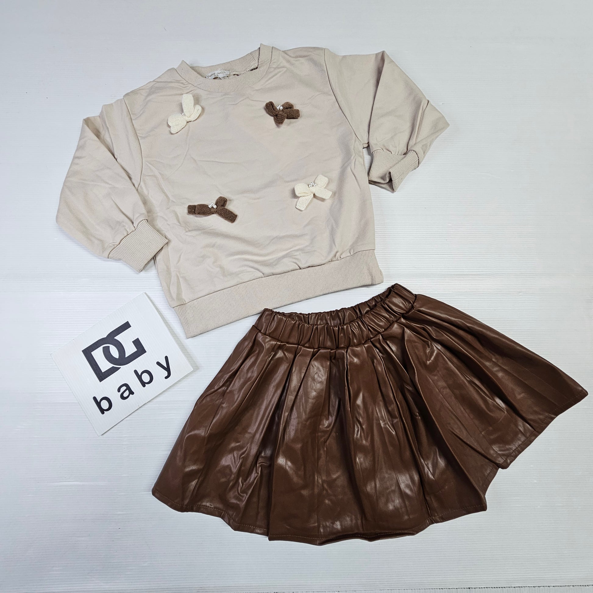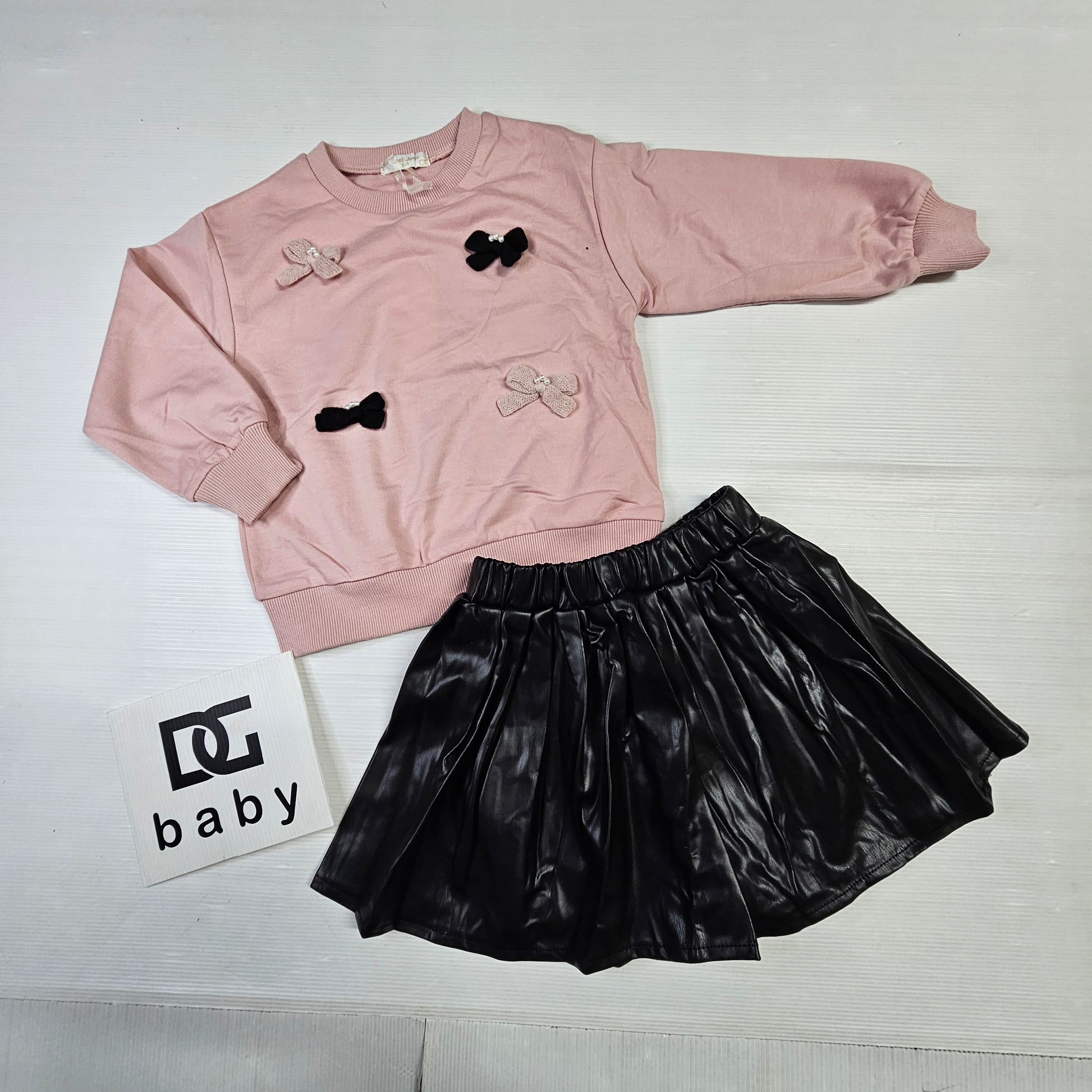 completo bambina ragazza FIOCCHI PELLE con maglietta manica lunga caldo cotone e  gonnellina in PELLE