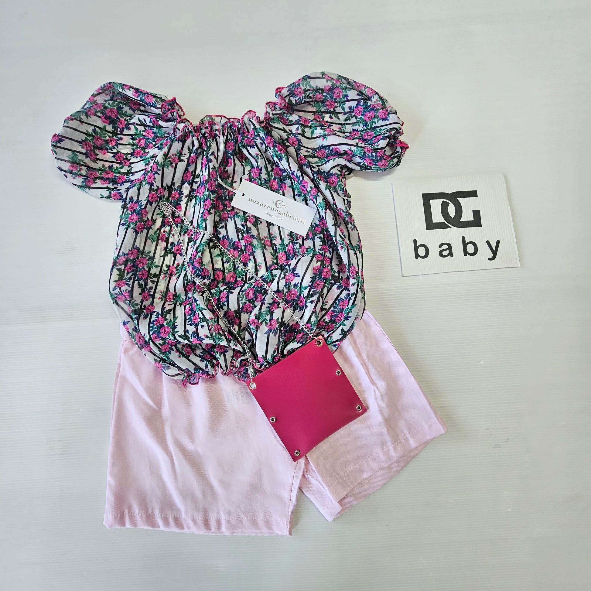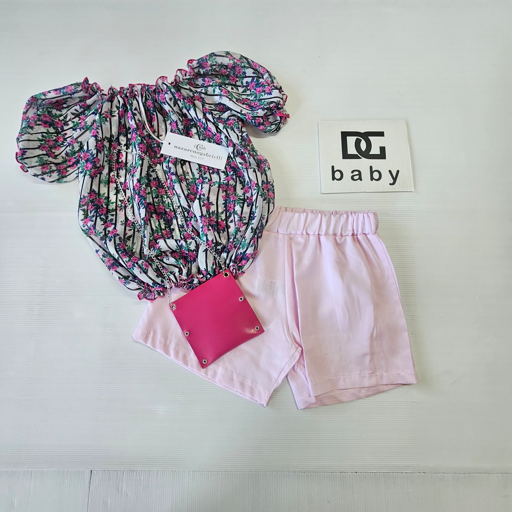 completo ragazza FIORI NAZARENO GABRIELLI composto da camicetta con maniche corte a sbuffo e pantaloncino inclusa anche borsetta