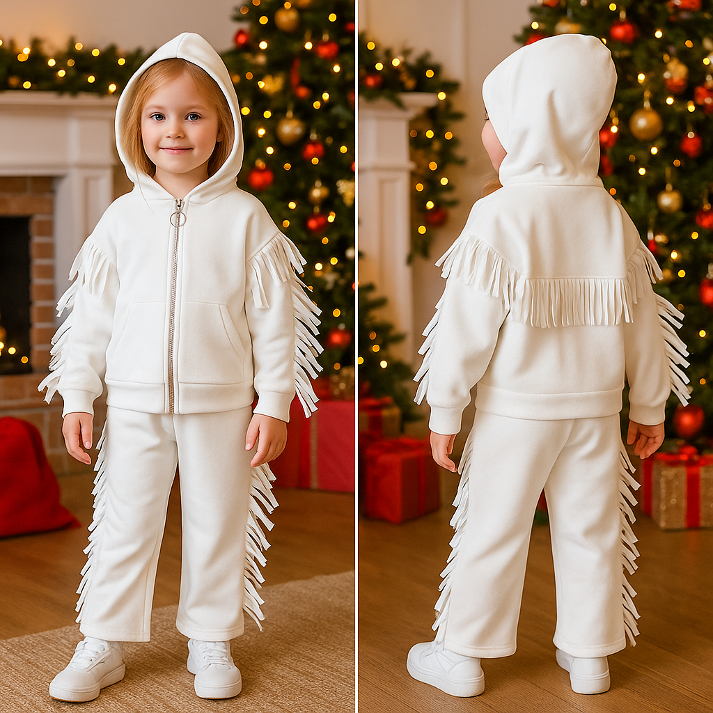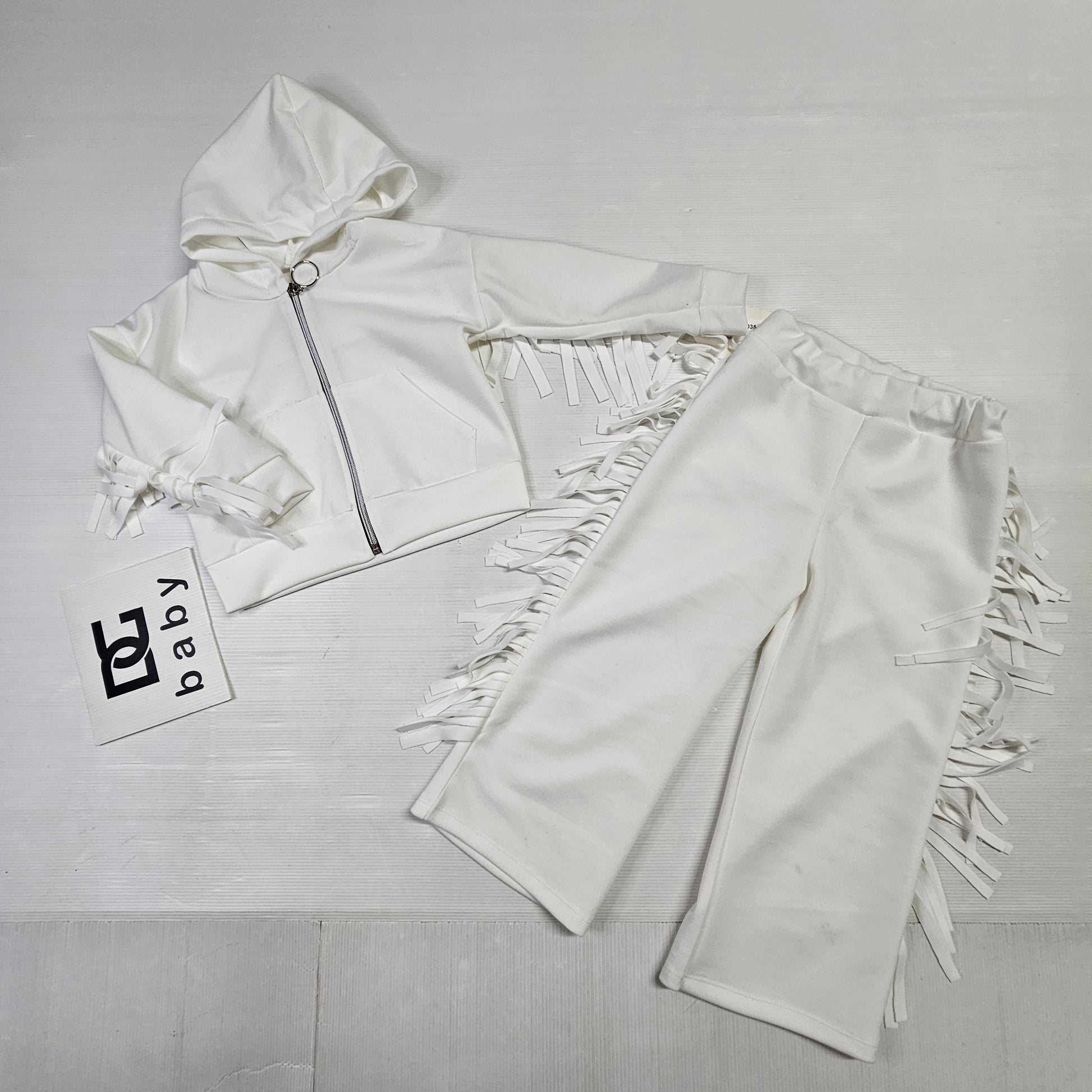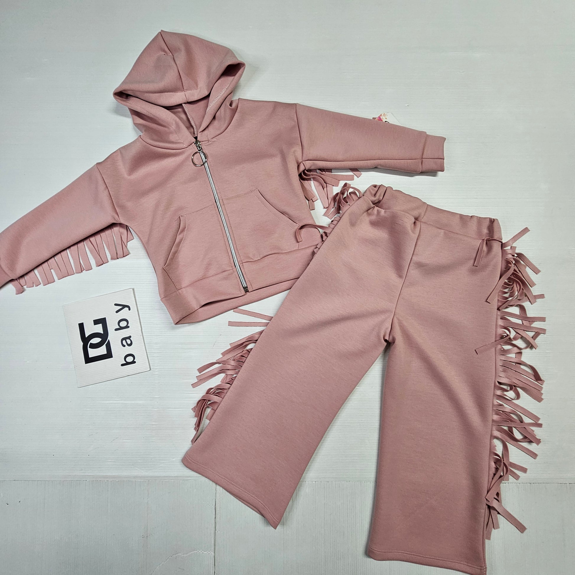 Completo due pezzi composto da felpa con cappuccio e zip frontale e pantalone coordinato. Le frange decorative lungo le maniche, dietro le spalle e sui lati dei pantaloni donano un tocco originale e di tendenza. Realizzato in tessuto morbido e confortevole, ideale per un look moderno e ricercato.