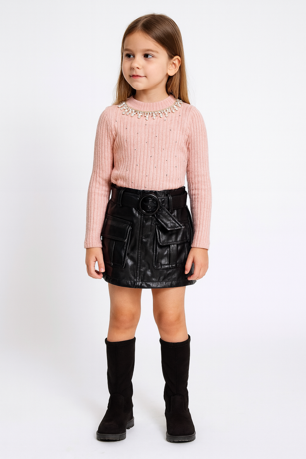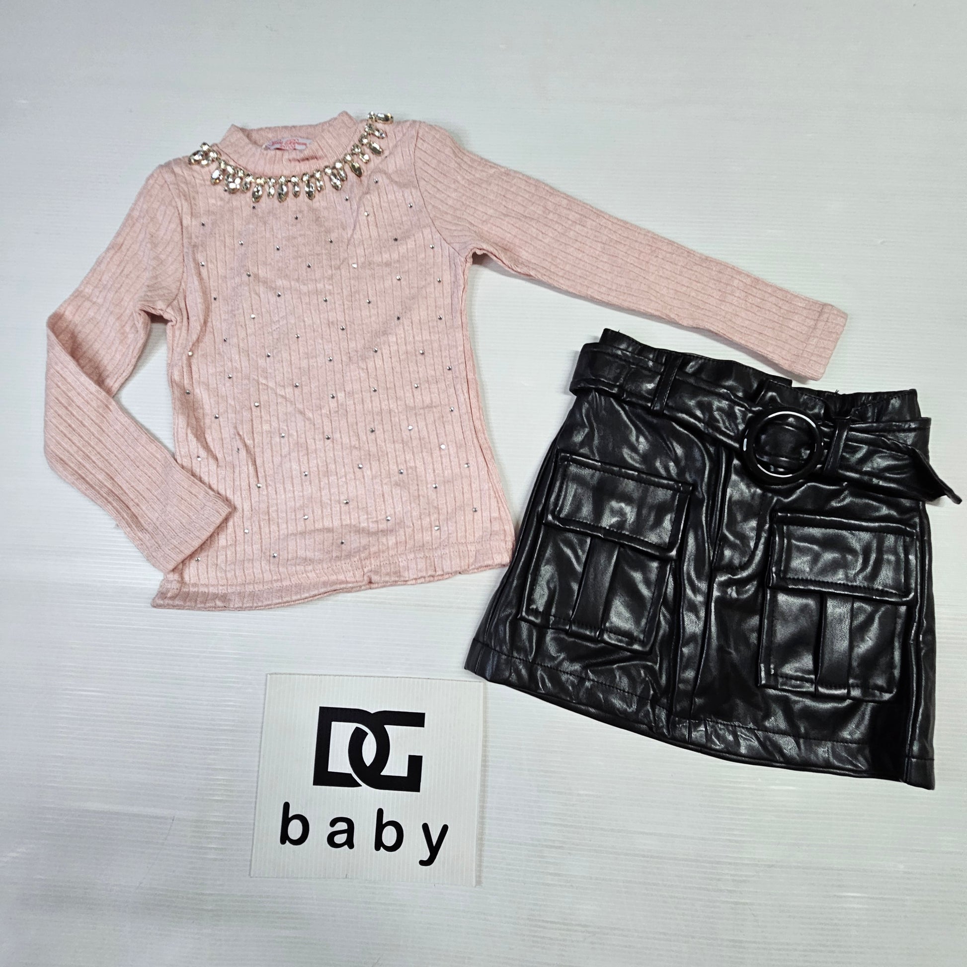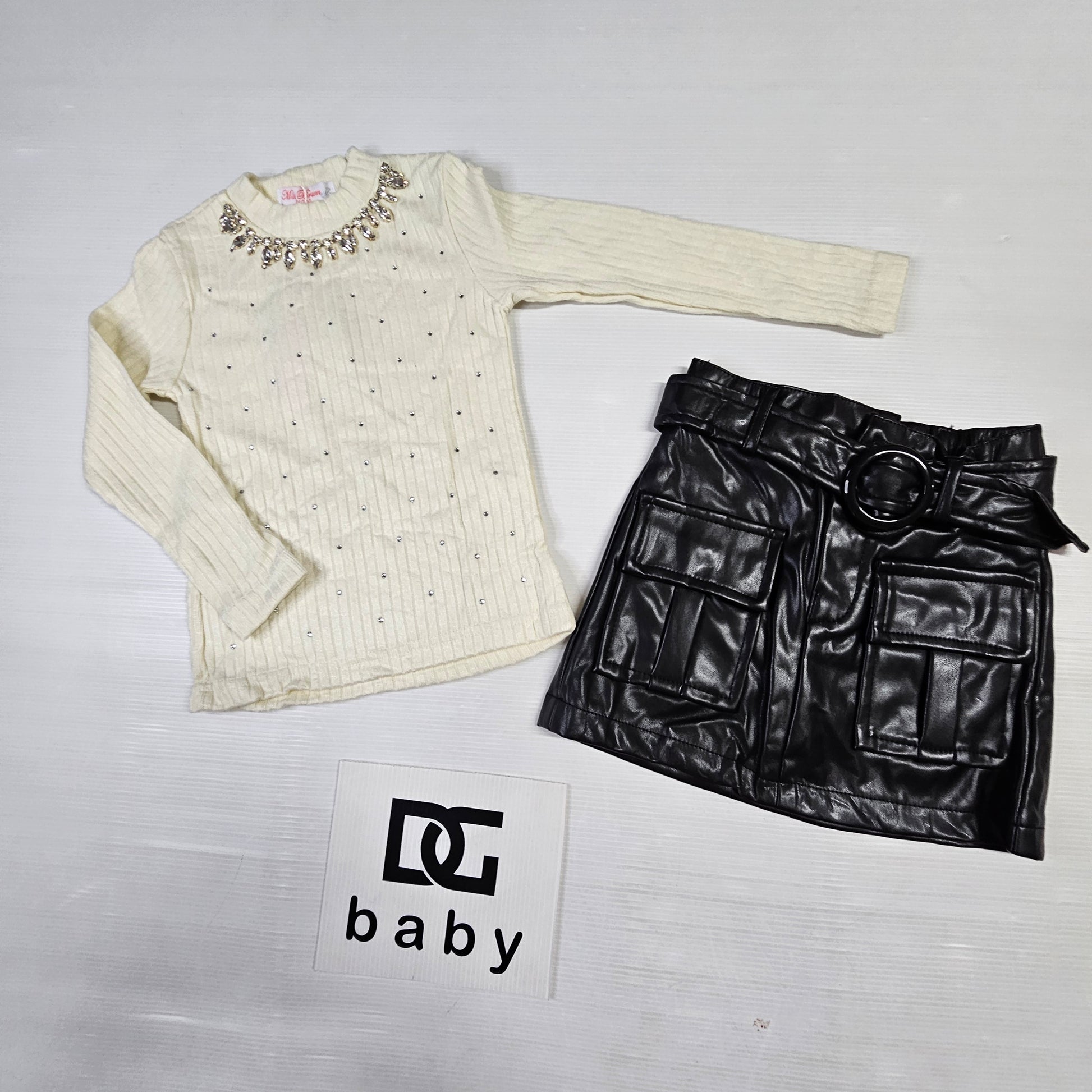 completo bambina ragazza KATIA  composto da maglia in lana con strass e gonna cargo in pelle