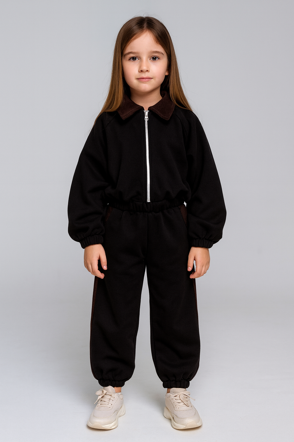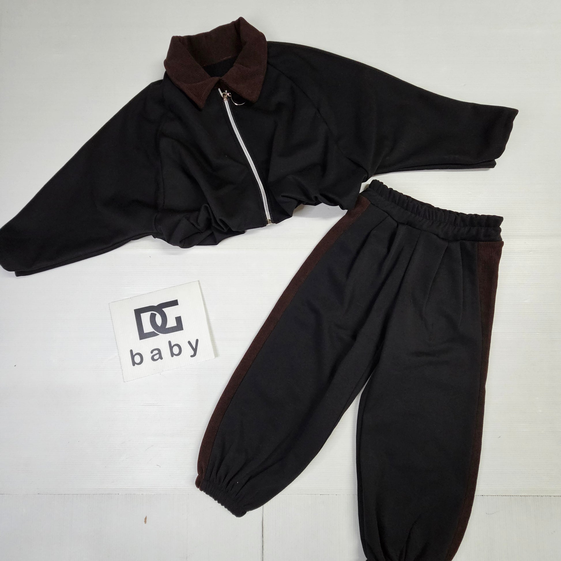 Completo bimba con giacca corta zip e dettagli in velluto color cioccolato su colletto e bande laterali del pantalone. Morbido, moderno e super stiloso per look casual chic.