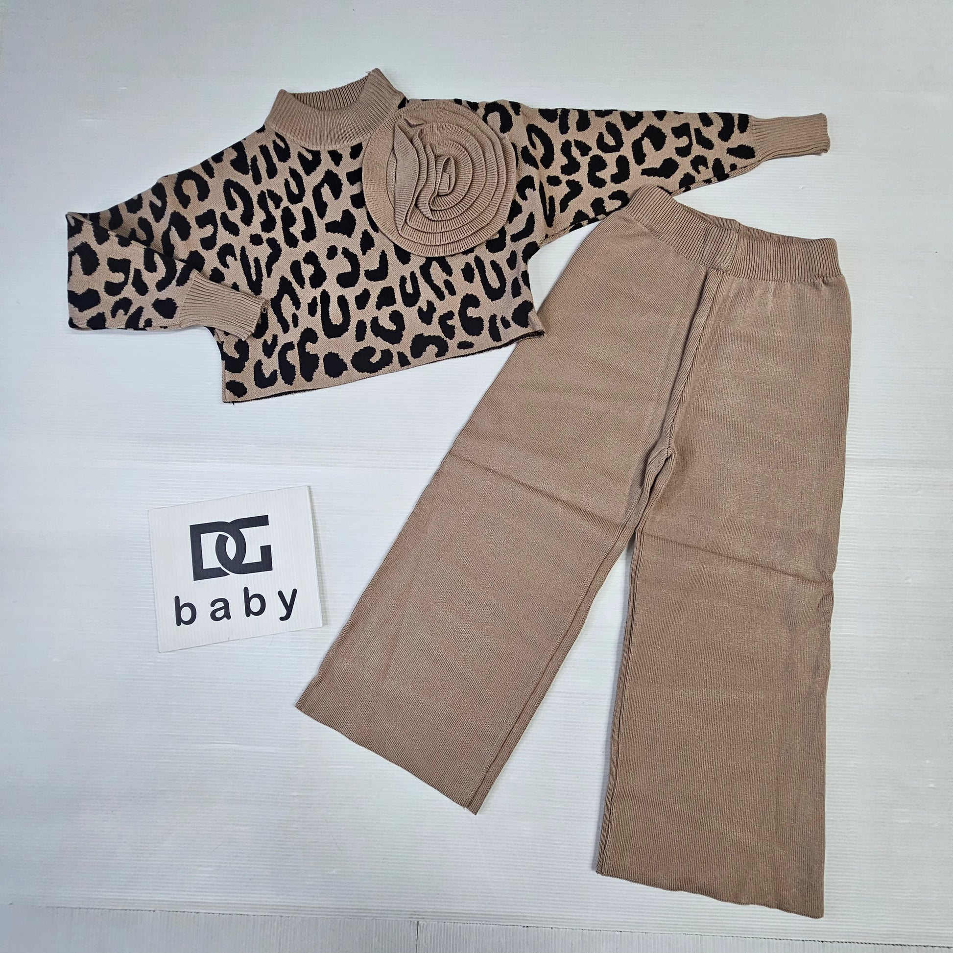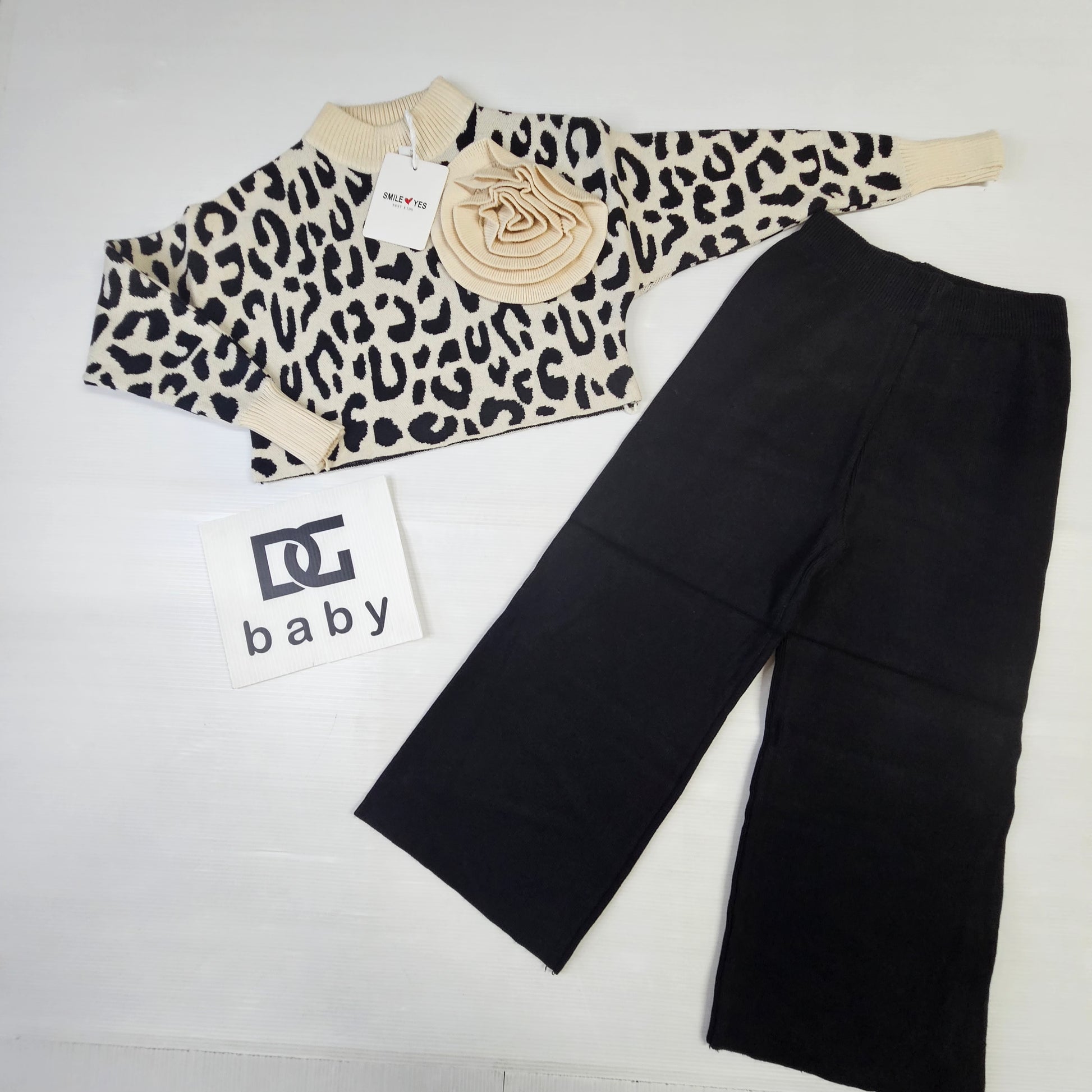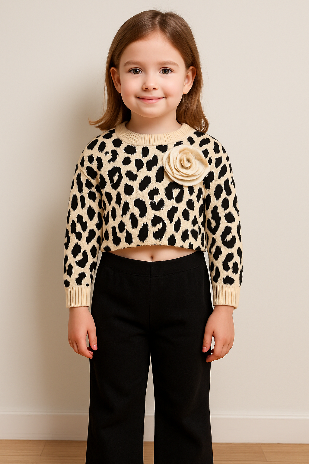 completo bambina ragazza con maglia crop a fantasia con applicazione e pantapalazzo