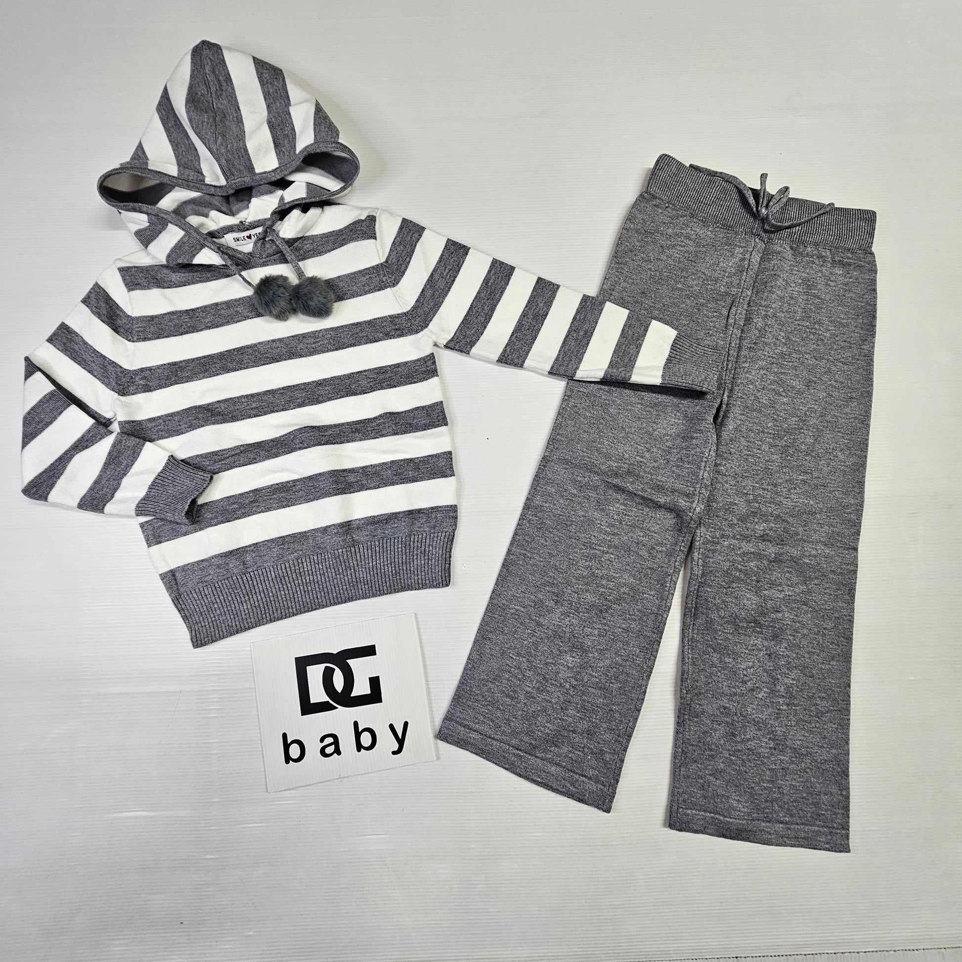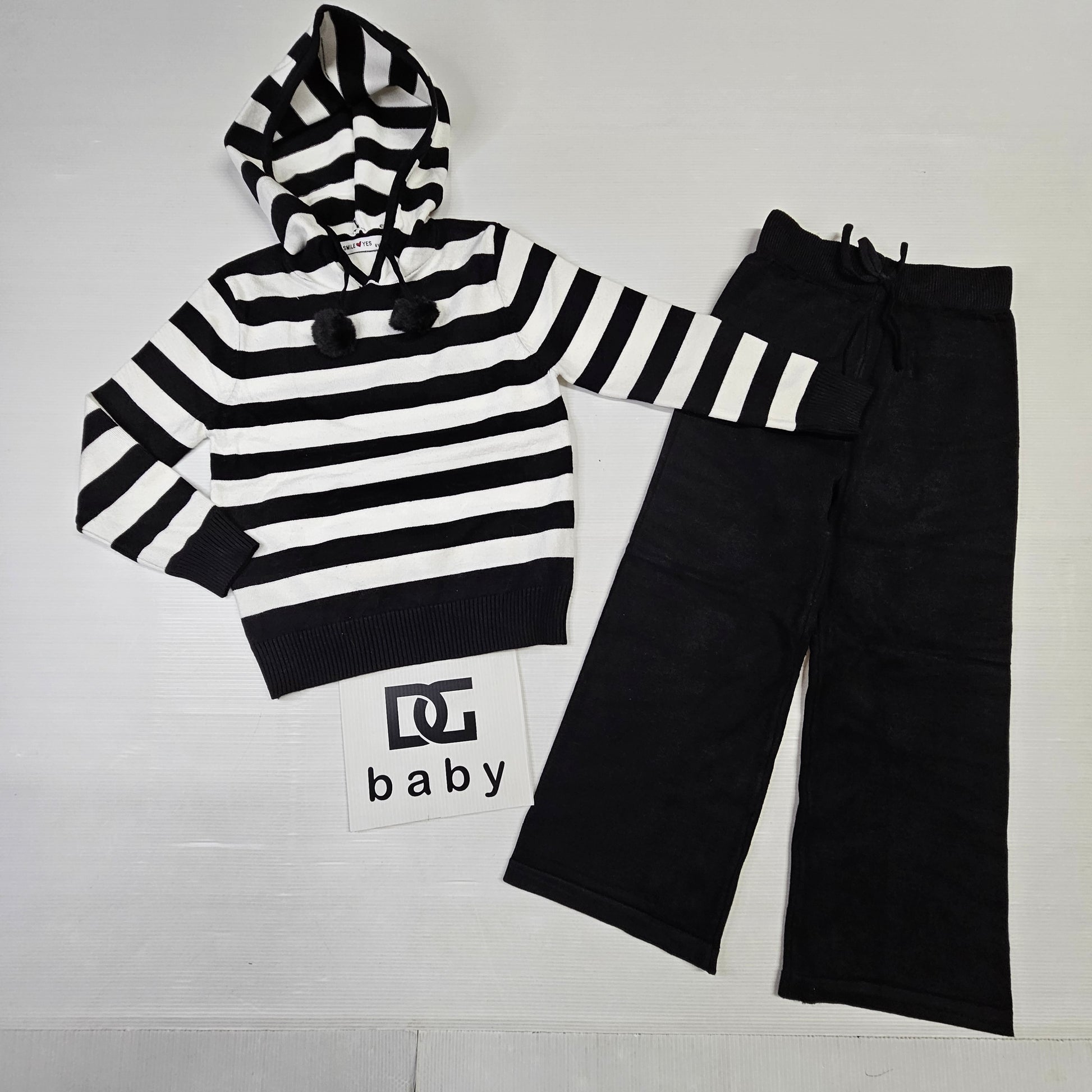 completo bambina ragazza RIGHE PONPON con maglia crop a righe con cappuccio e pantapalazzo tutto in lana rasata