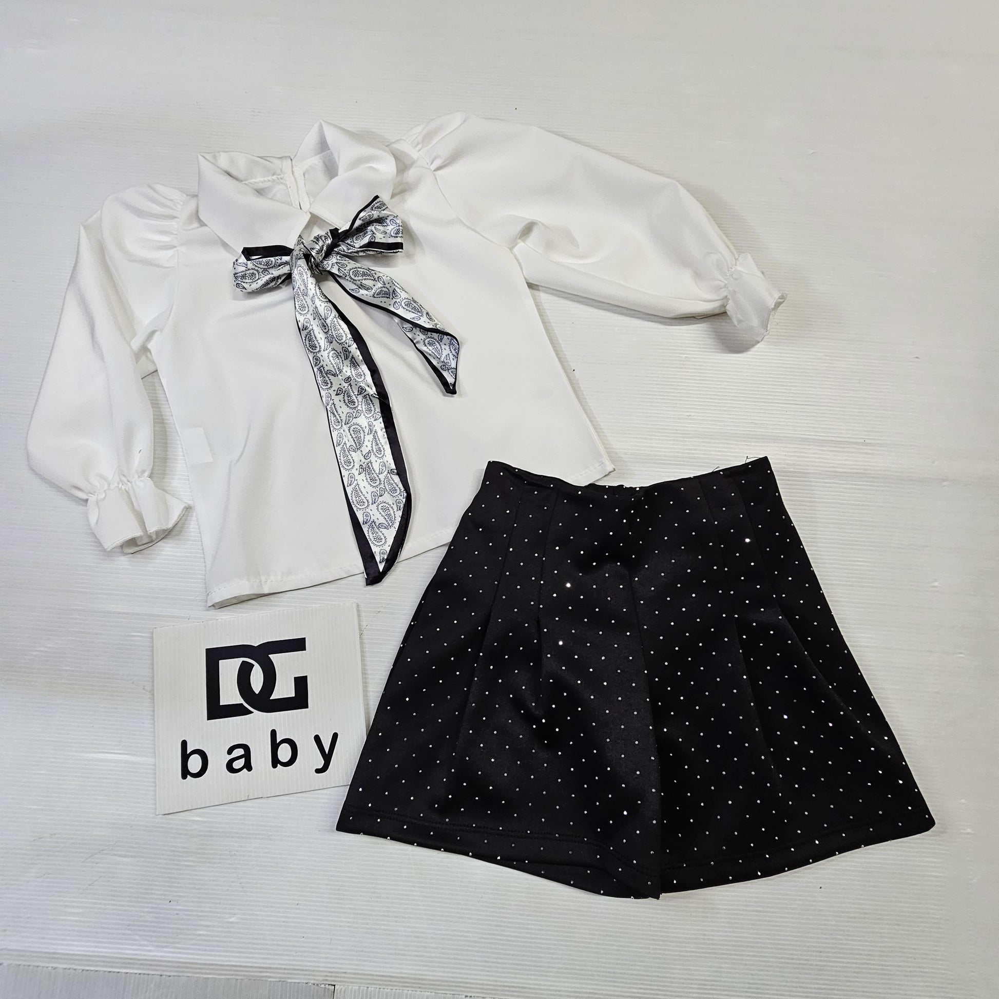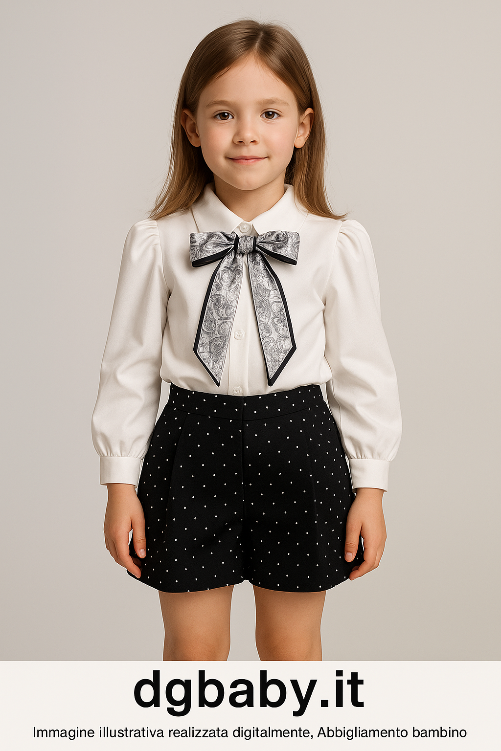 Completo bambina (4-14 anni) dallo stile raffinato, composto da blusa bianca con fiocco in raso fantasia oro e shorts color tortora con micro strass luminosi. Perfetto per cerimonie o occasioni speciali, unisce eleganza e comfort.