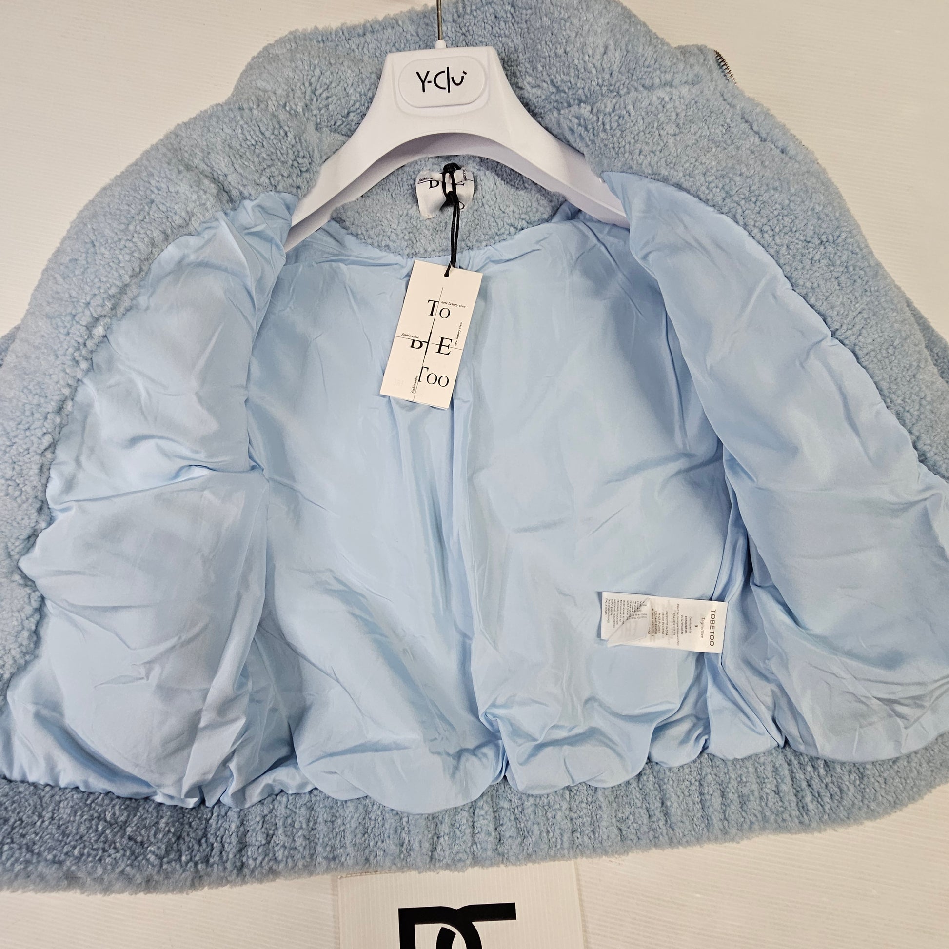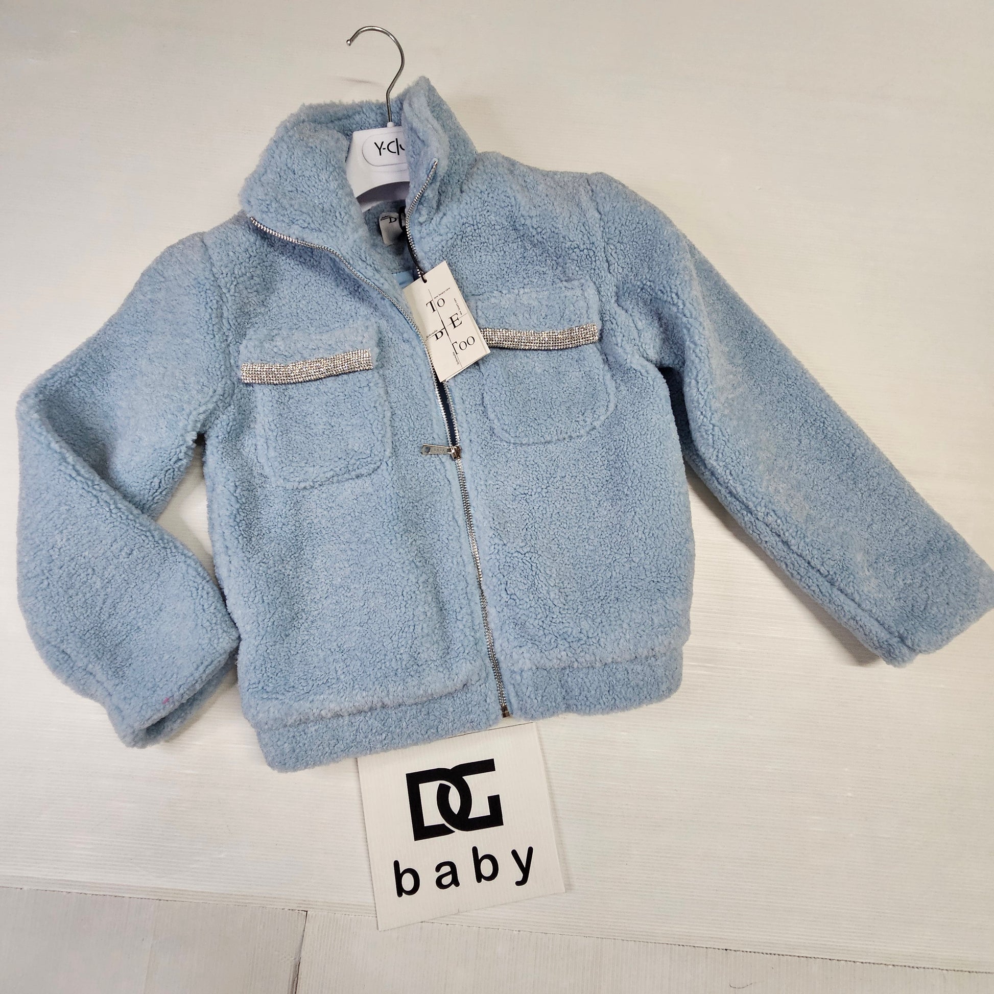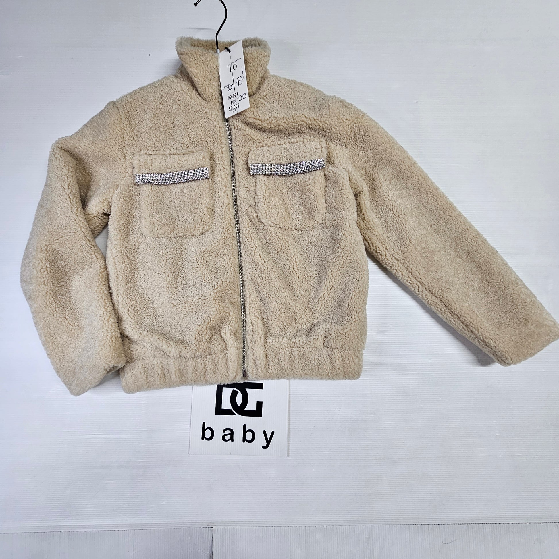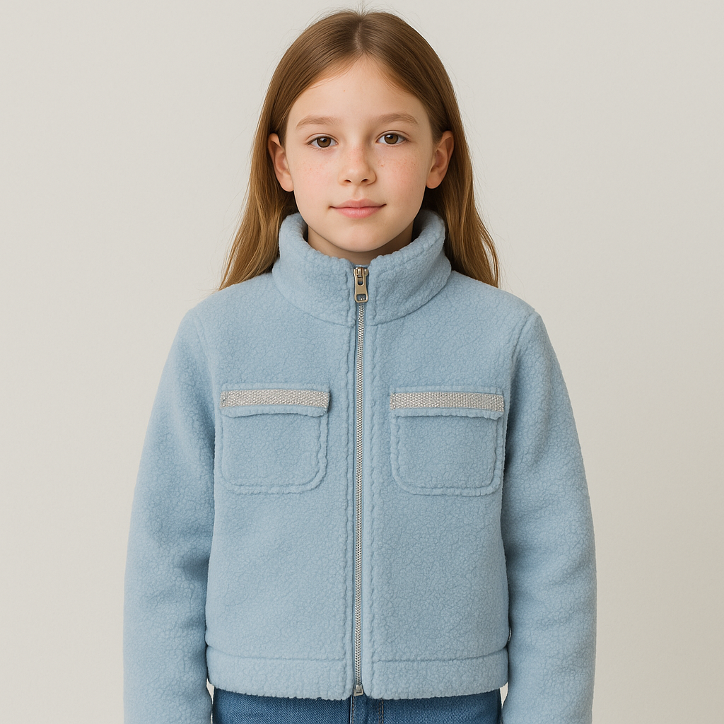Giacca in morbido tessuto effetto peluche, disponibile nei colori beige e celeste. Calda e confortevole, presenta tasche frontali decorate con strass e chiusura con zip. Perfetta per aggiungere un tocco chic ai look invernali.