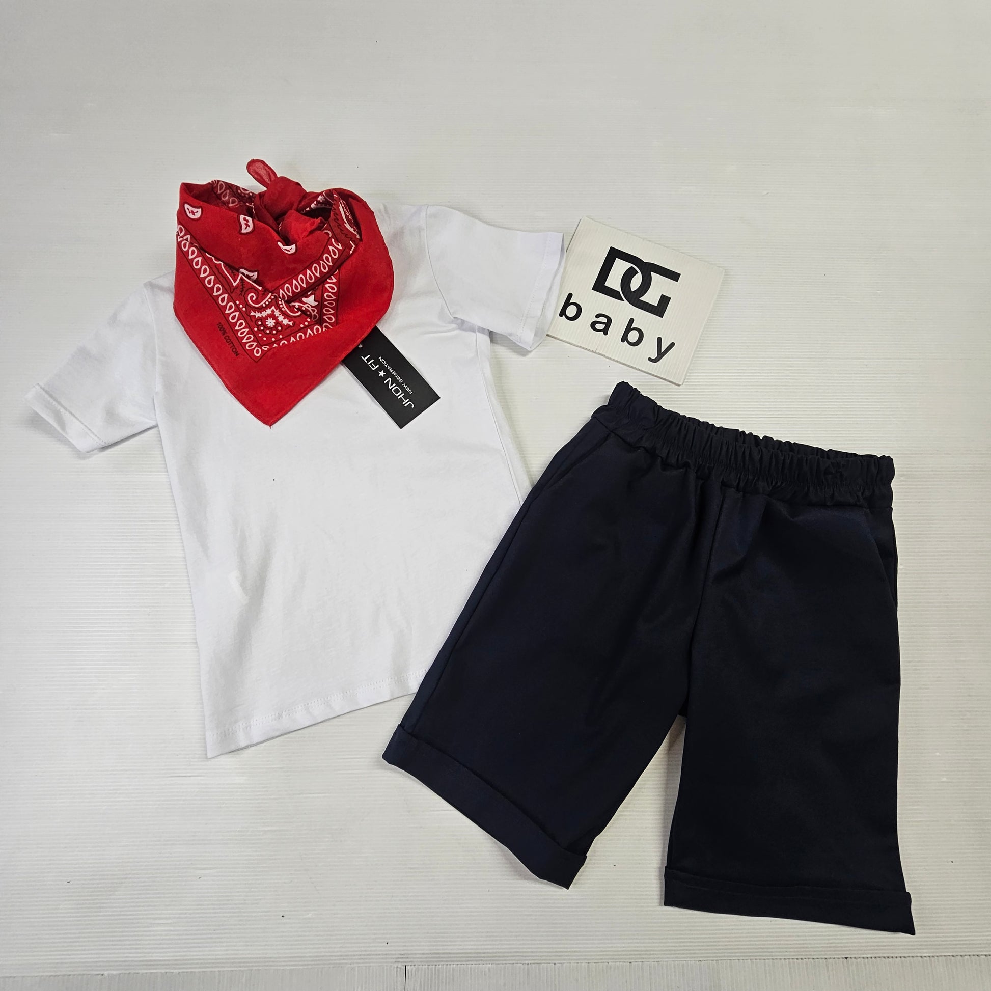 completo bambino ragazzo JHONNY RED composto da maglietta mezza manica in cotone e pantaloncino con elastico in vita e bandana