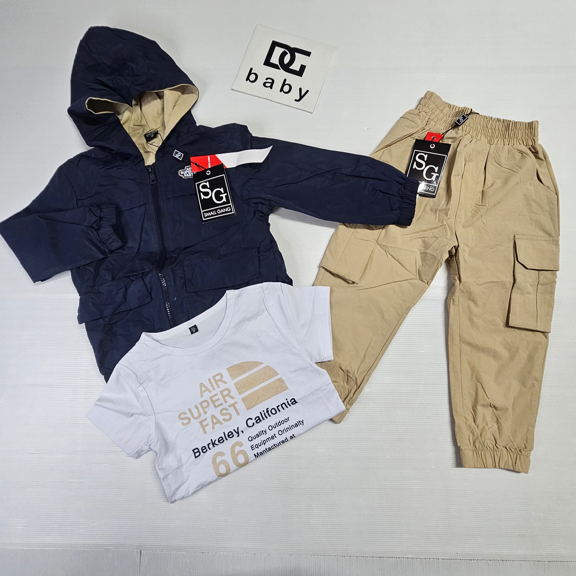 completo bambino SUPER FAST SMALL GANG giubbino, maglietta manica corta in cotone e pantalone cargo