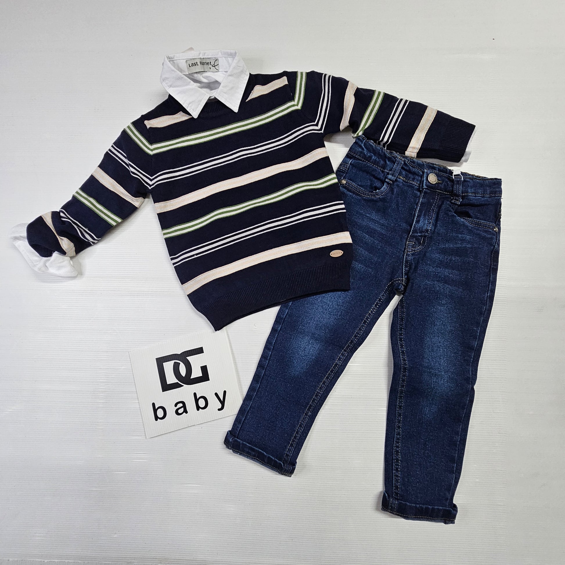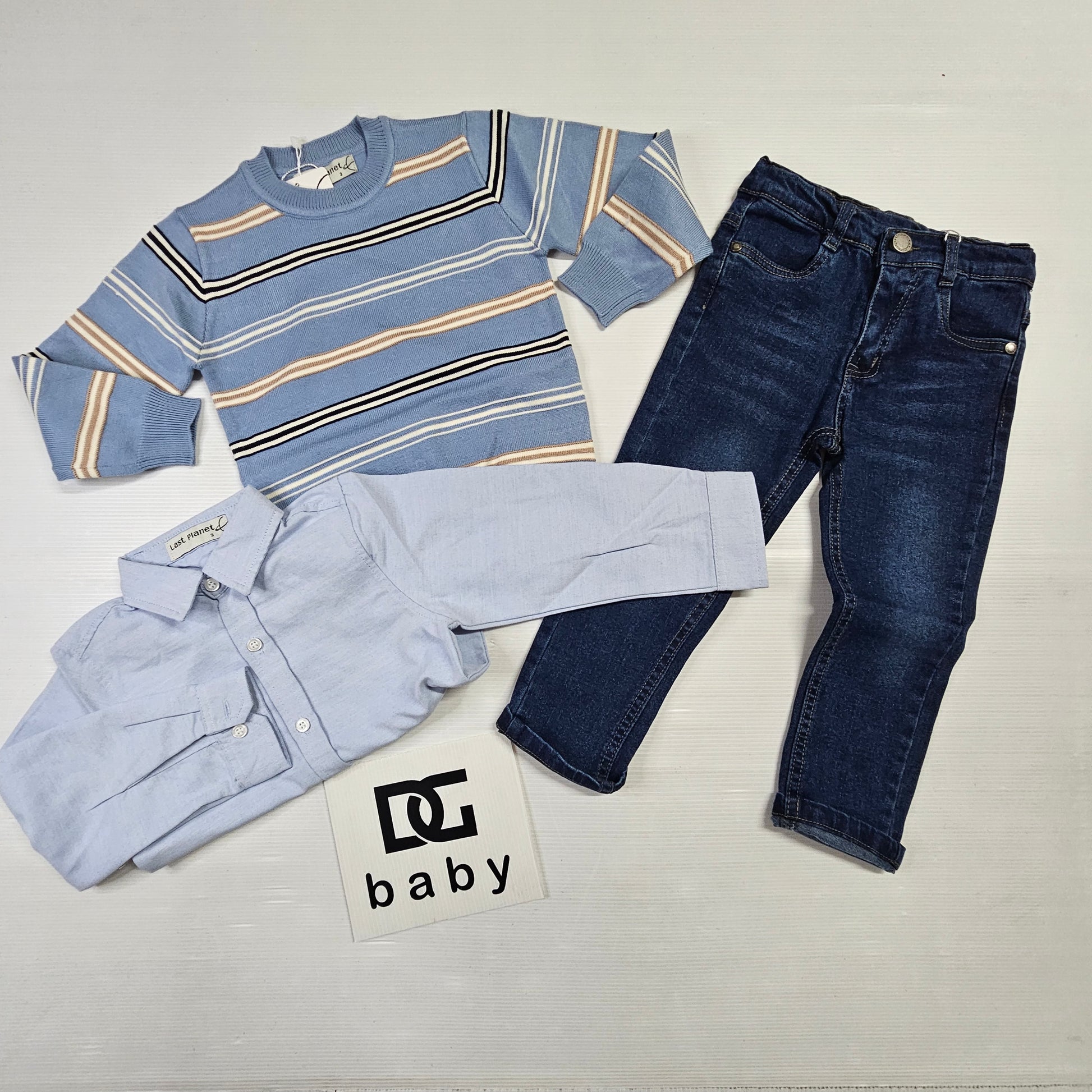 completo bambino PLANET con maglioncino girocollo in lana rasata a fantasia rigata, camicia manica lunga e pantalone jeans con elastico regolabile tutto caldo
