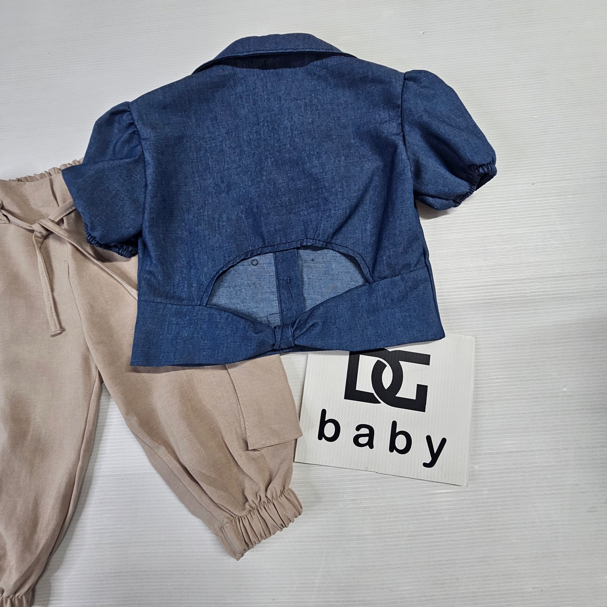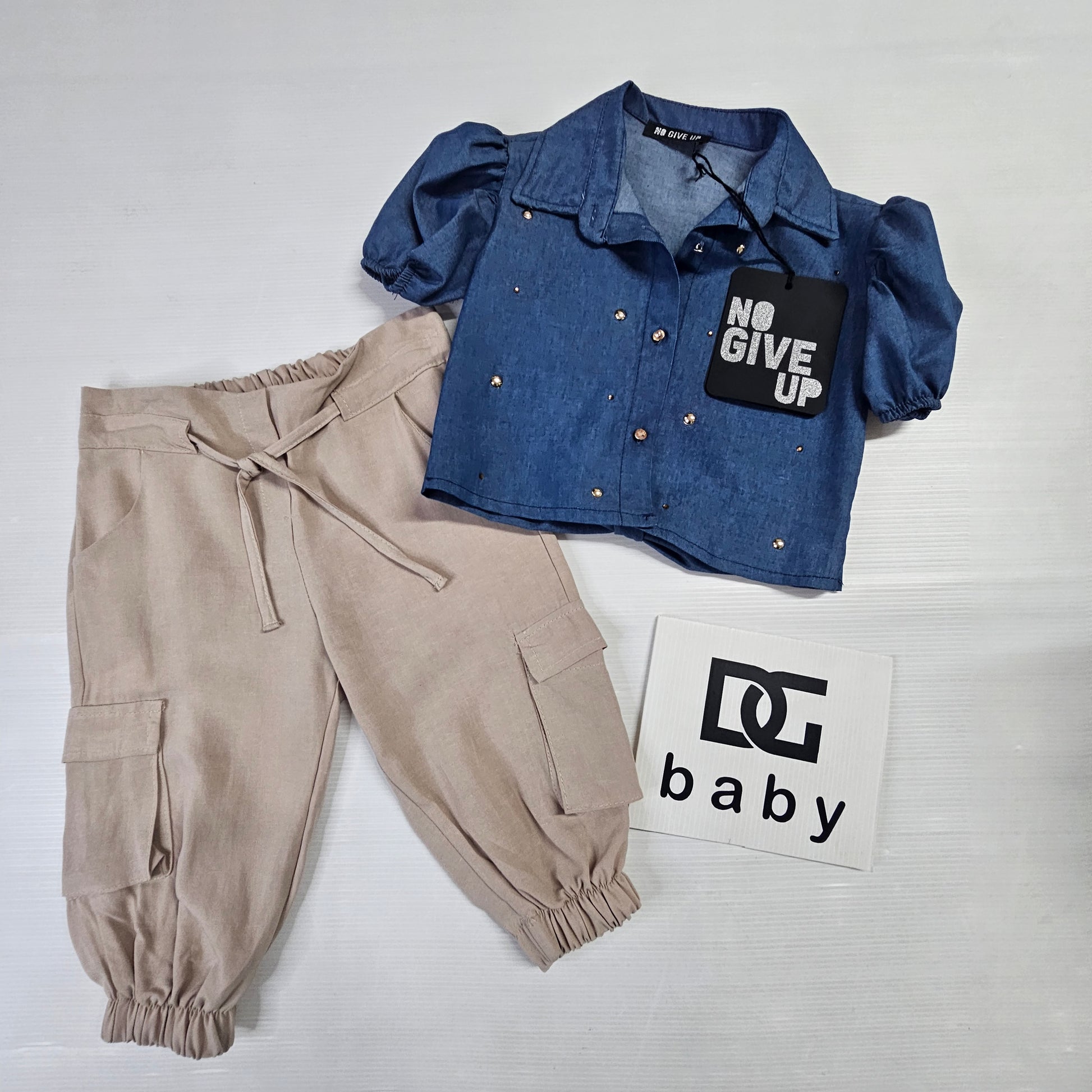 completo bambina PUNTI LUCE  NO GIVE UP composto da camicia jeans mezza manica e pantalaccio cargo con elastico alle caviglie