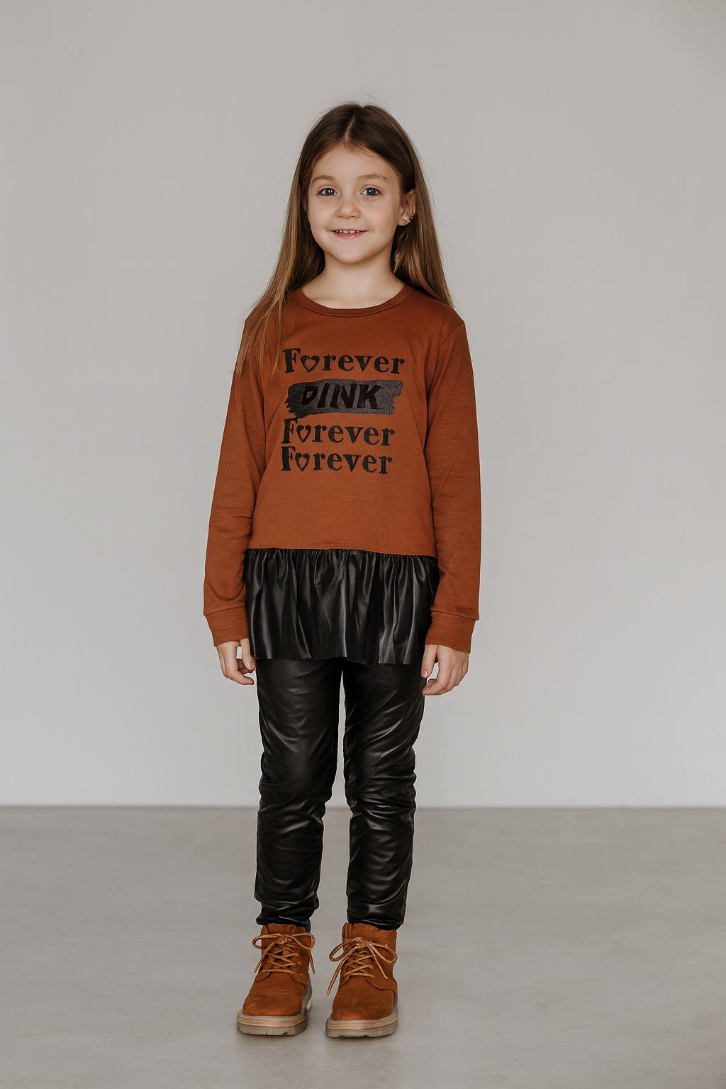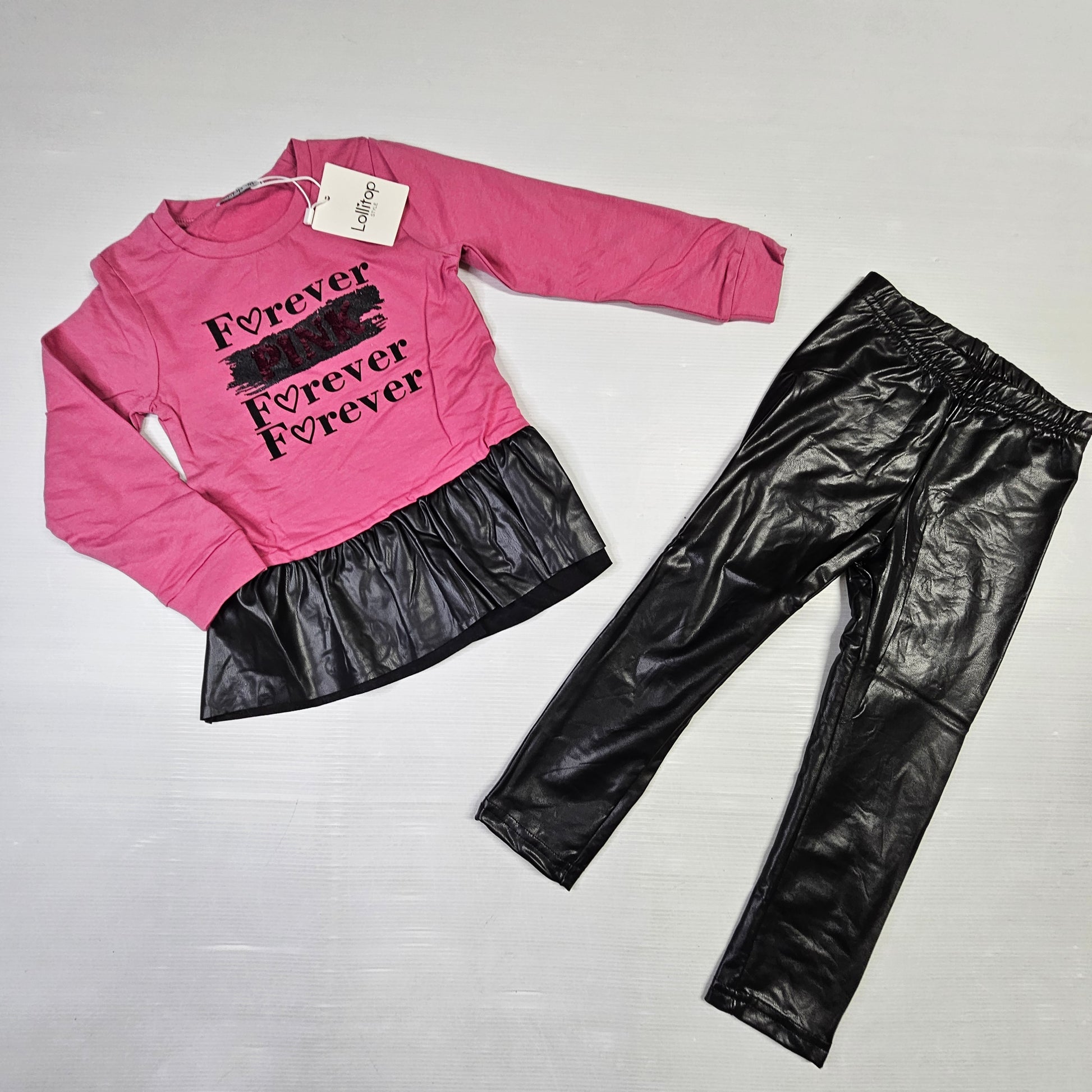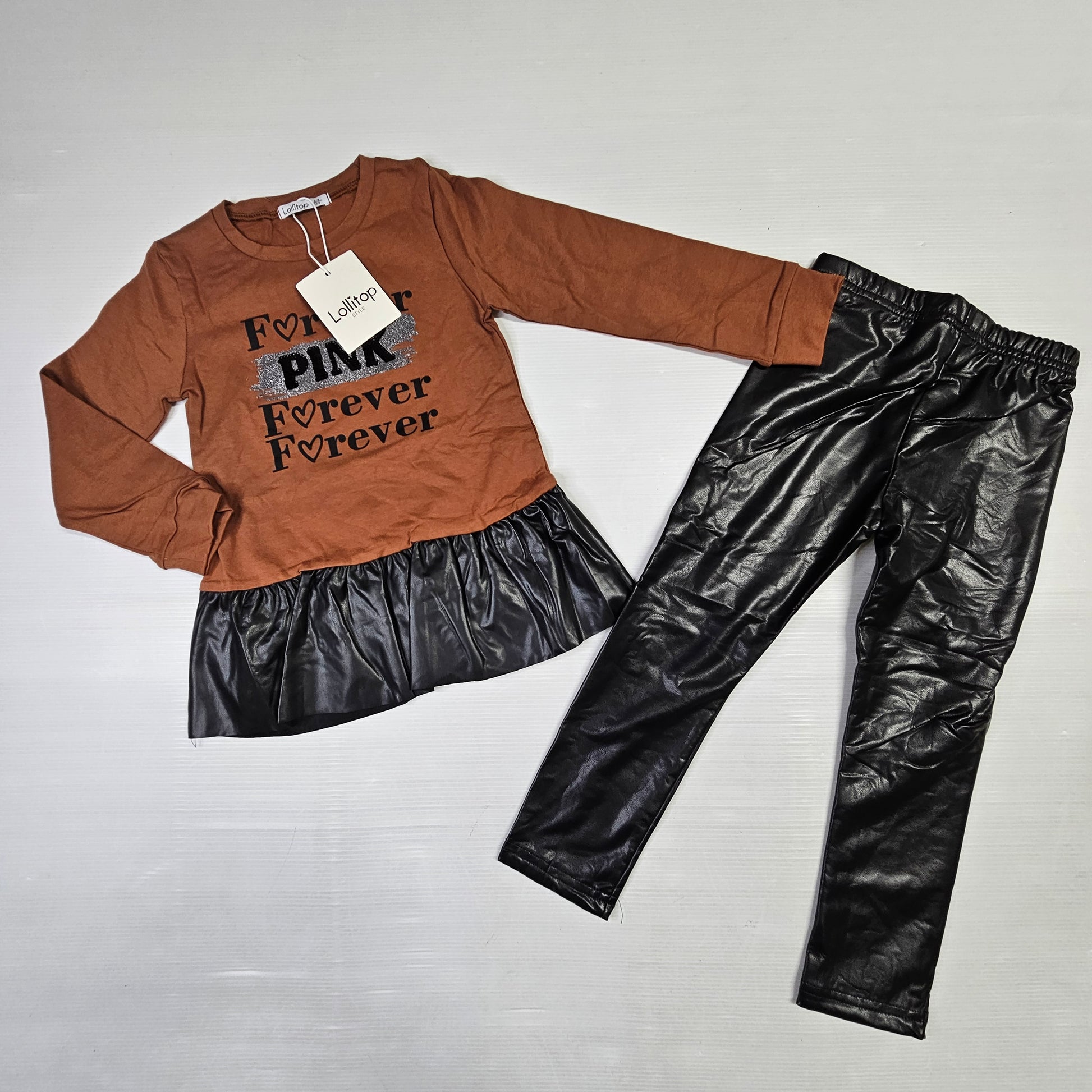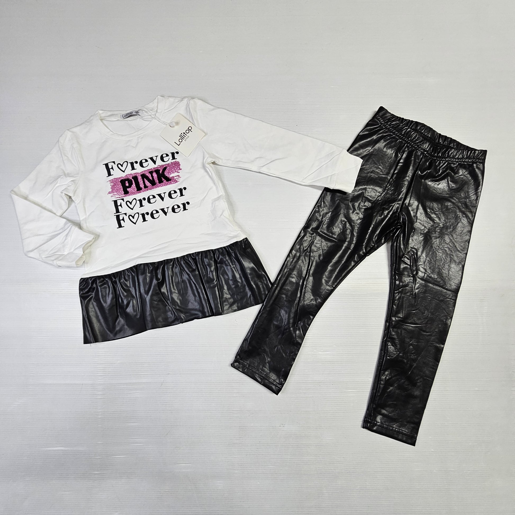 completo bambina ragazza FOREVER PELLE LOLLY composto da maglia manica lunga in caldo cotone con volants di pelle e leggins sempre di pelle