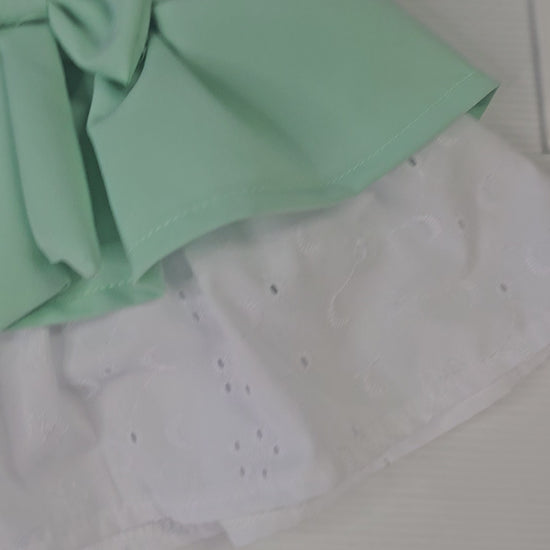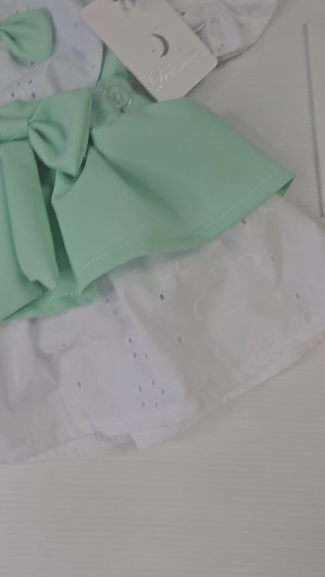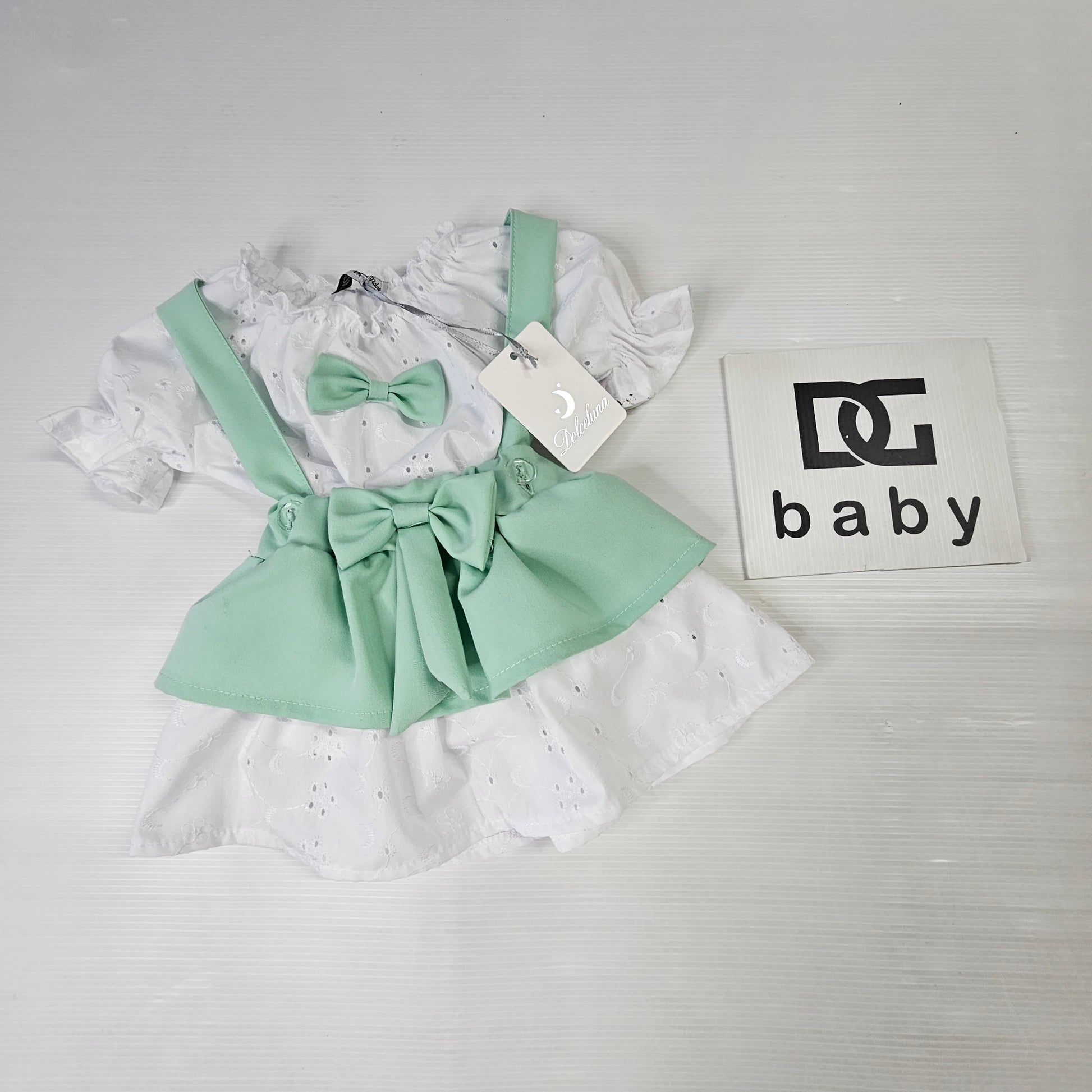 vestitino salopette neonata GREEN DOLCELUNA composto da camicia mezza manica e salopette a gonnellina con fiocchi applicati