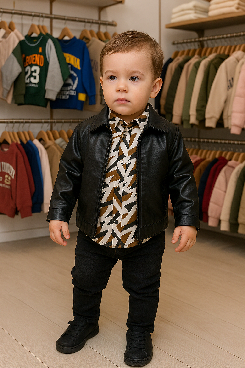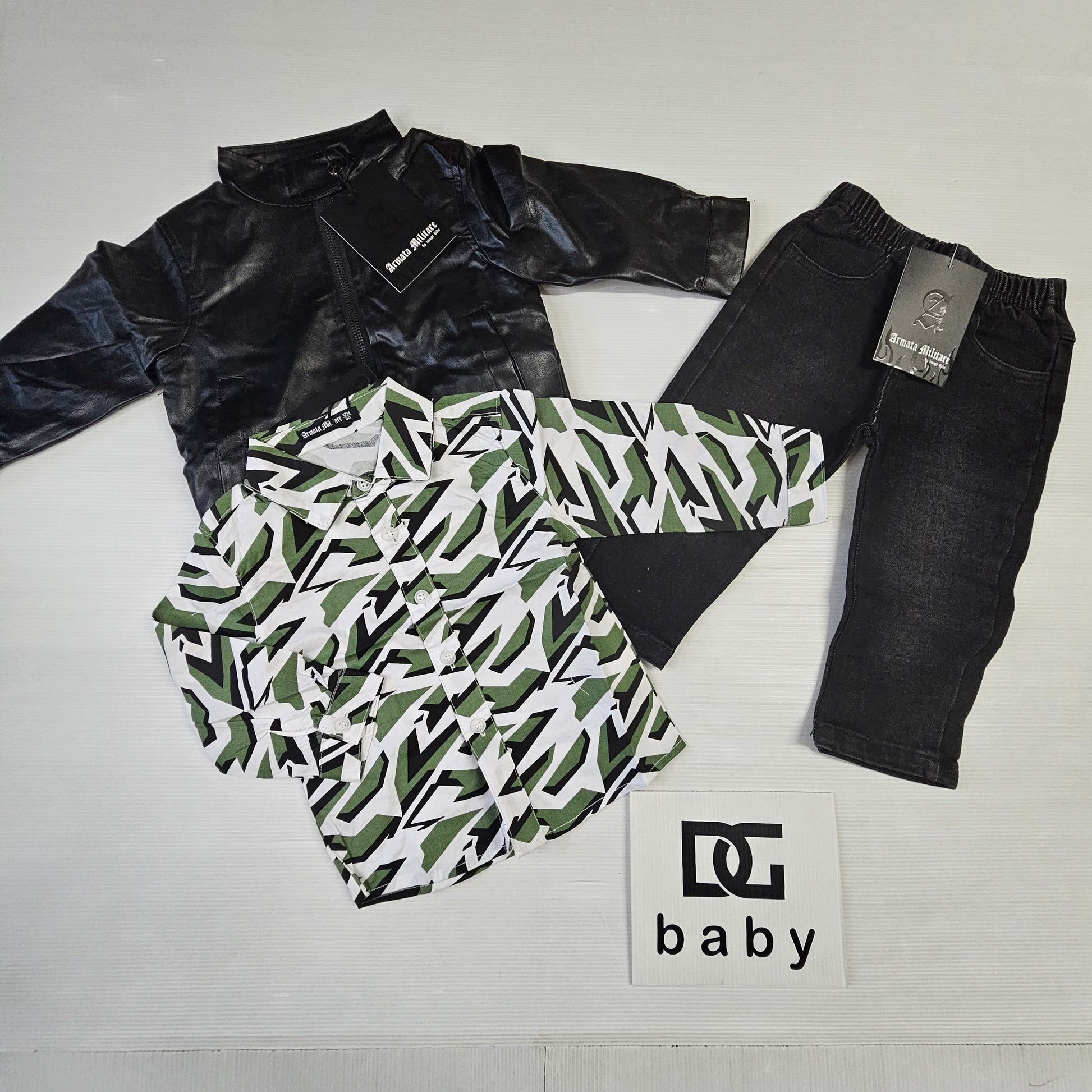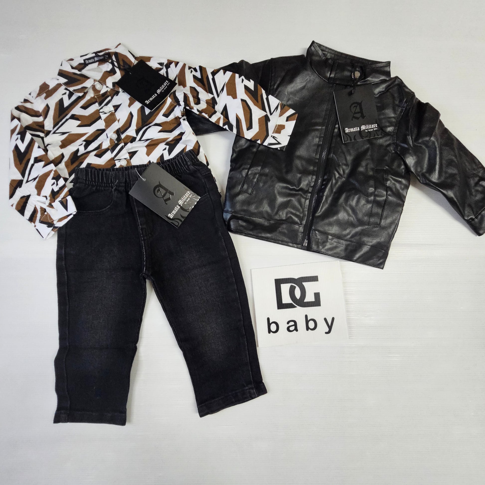completo neonato ARMATA composto da giubbino di pelle camicia in cotone fantasia e pantalone con elastico in vita