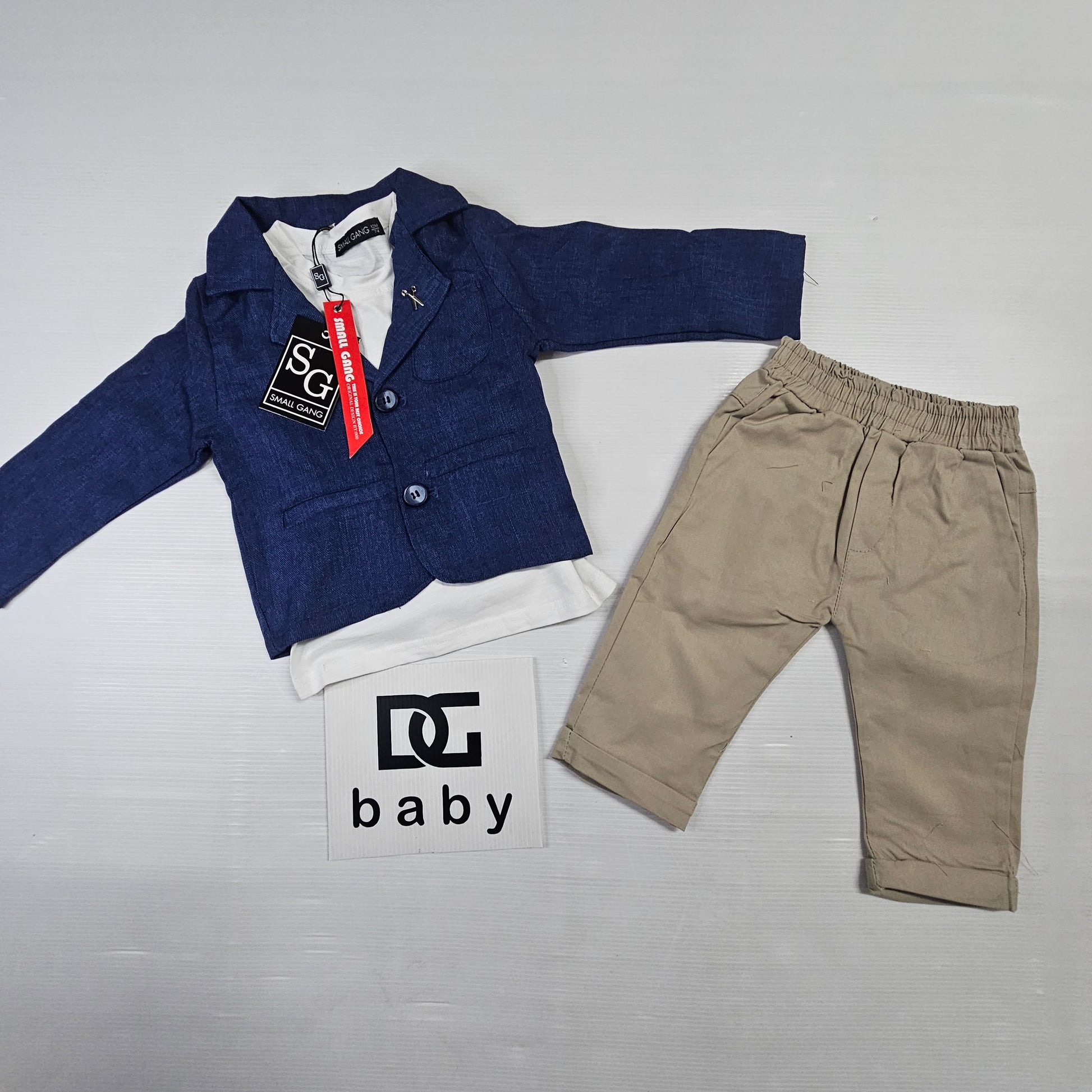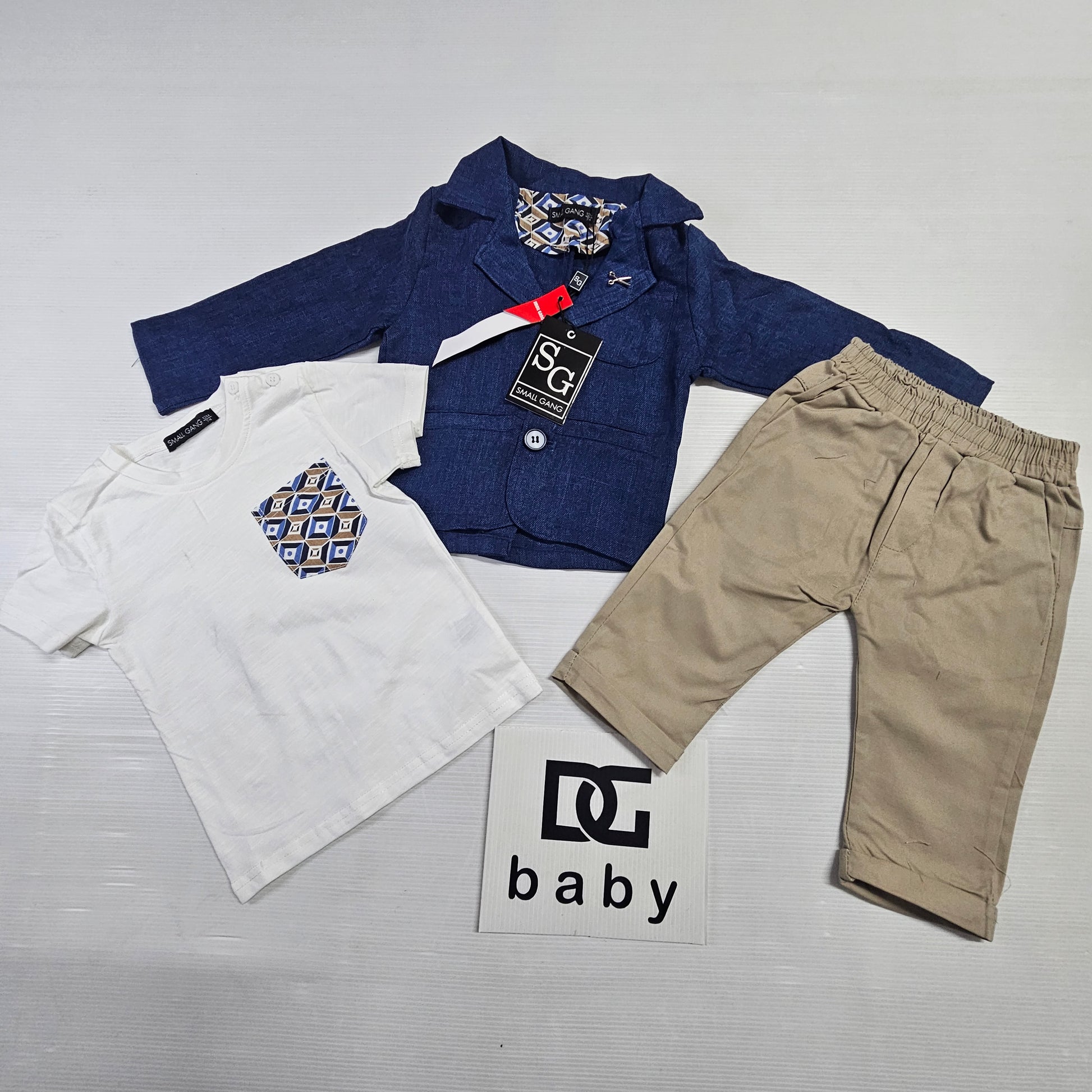 completo neonato F-GIACCA SMALL GANG composto giacca con bottoni, maglietta mezza manica con taschino e pantalone tutto in cotone LINEA cerimonia