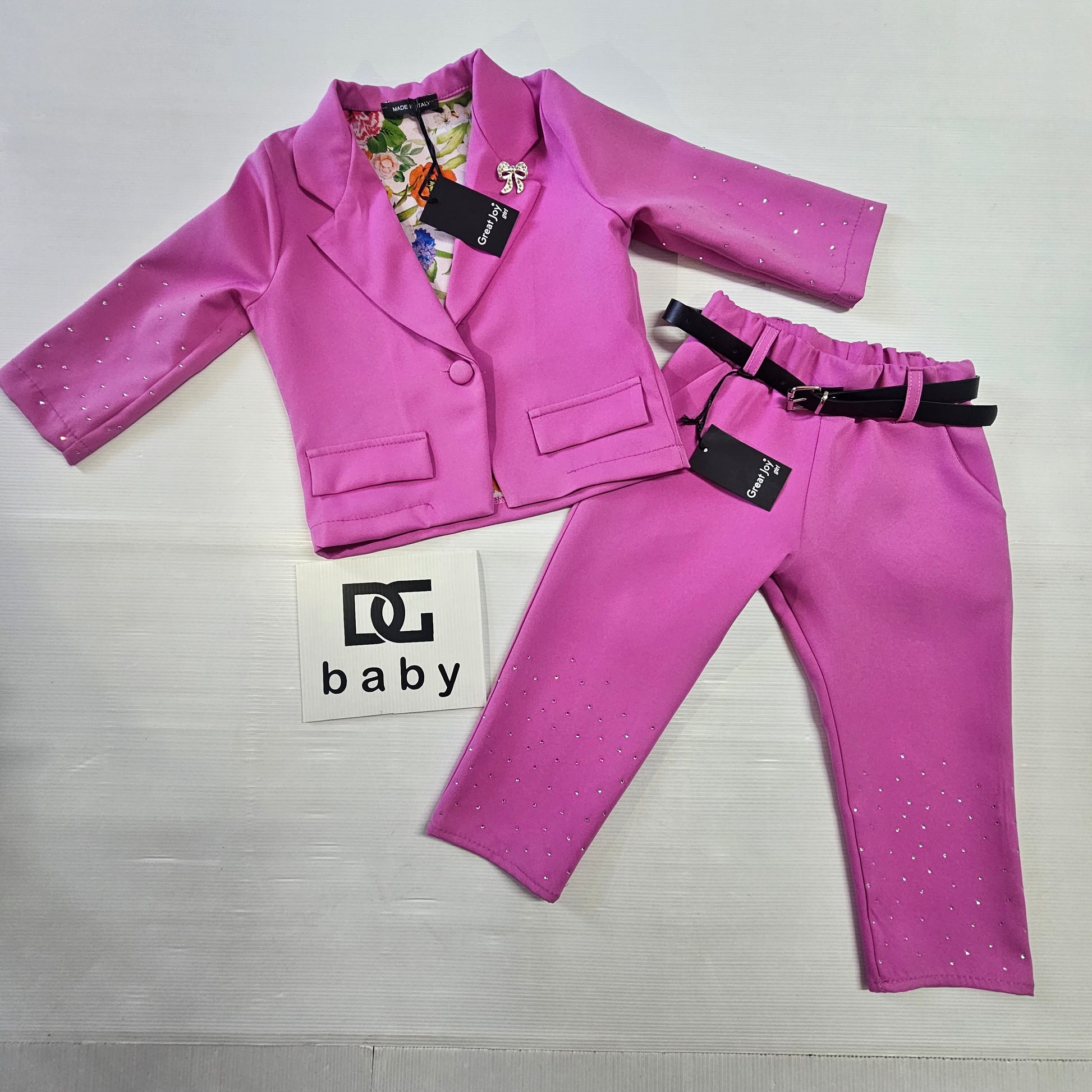 completo bambina ragazza GREAT JOY GIRL composto giacca e pantalone con cintura impreziositi entrambi da strass