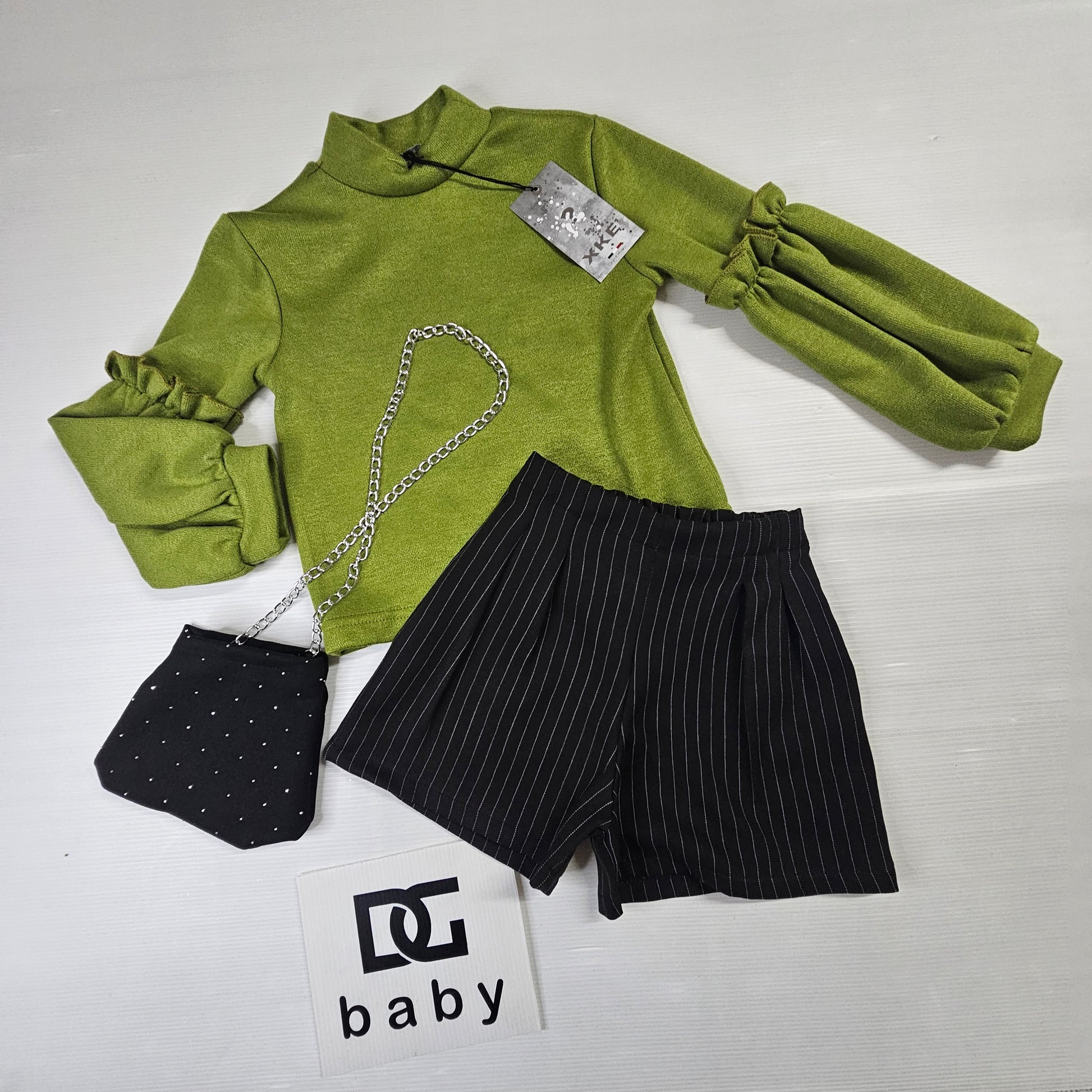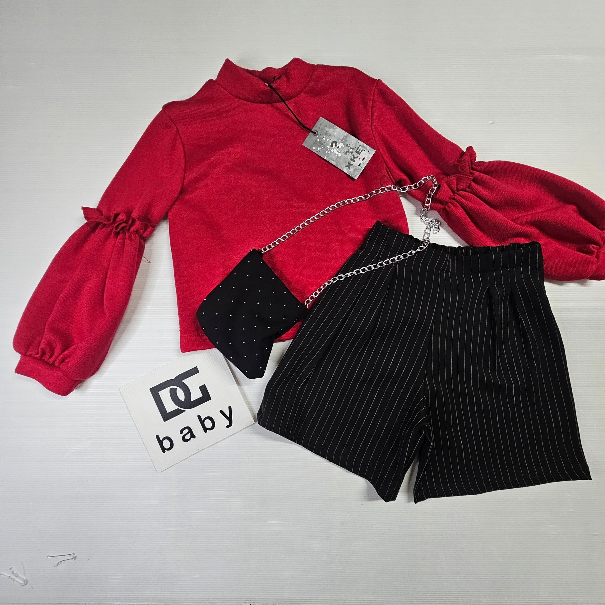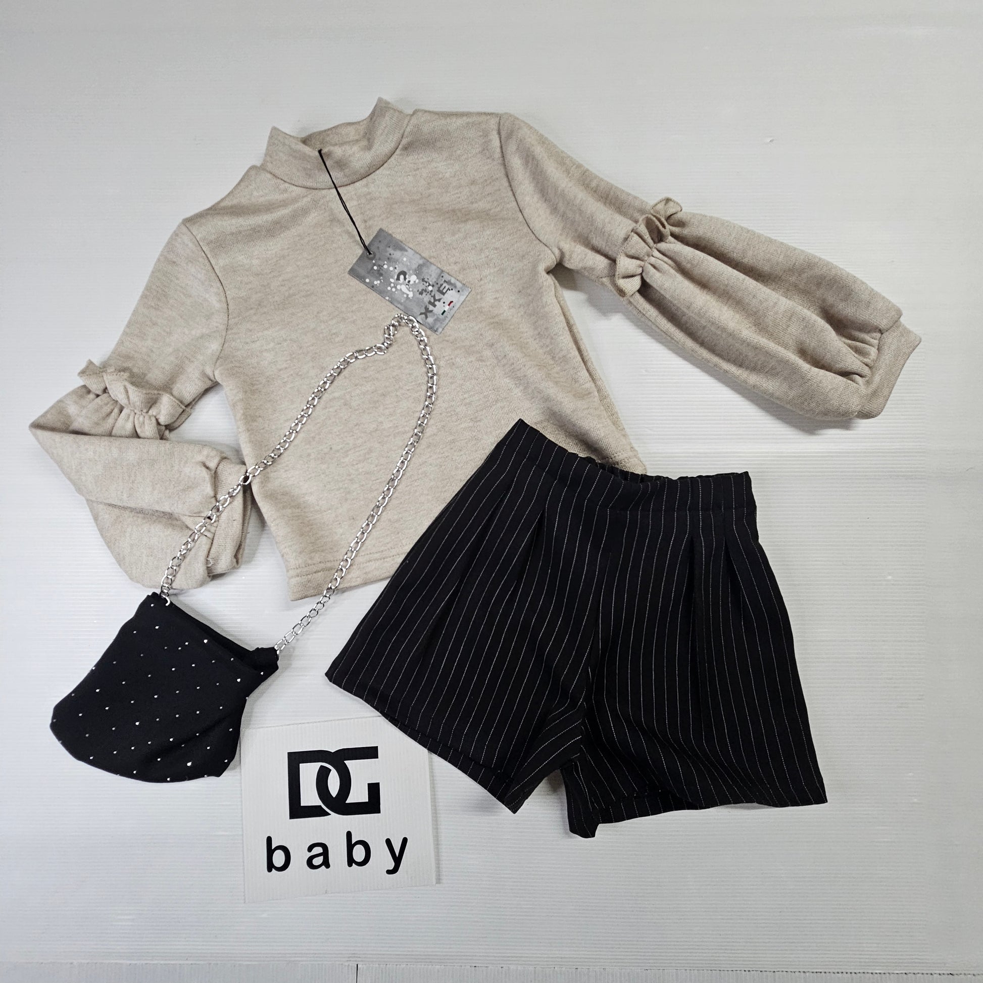 completo bambina ragazza XKE GIRL composto da maglia in lana rasata con maniche a sbuffo shorts gessato e borsetta stessa fantasia