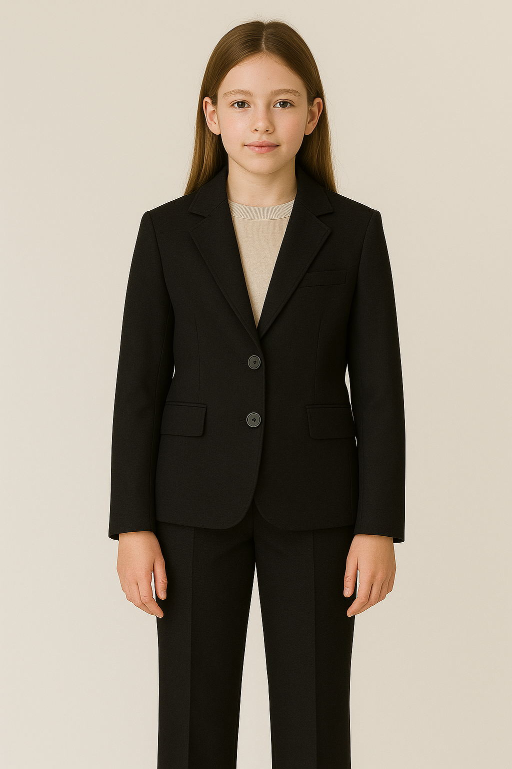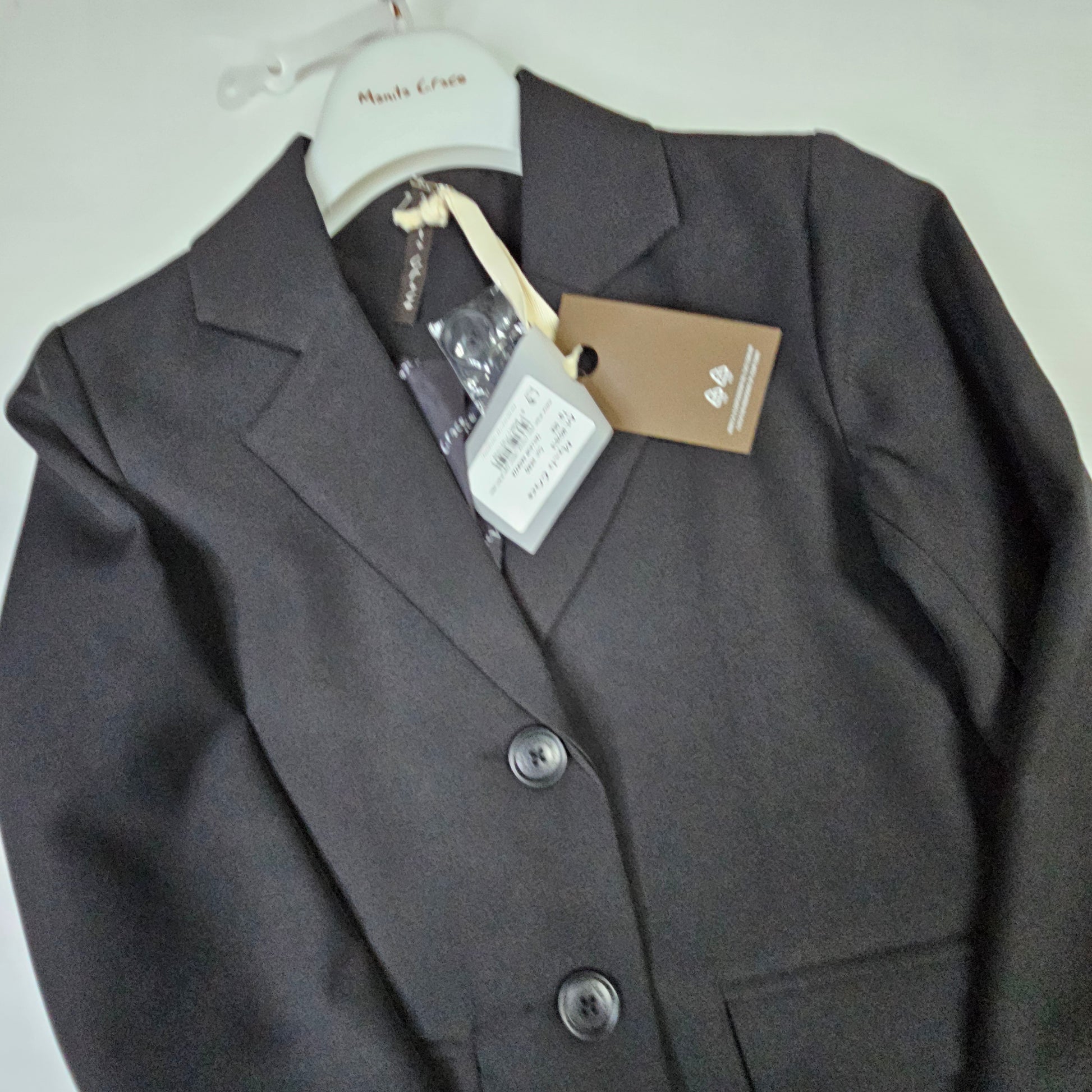 Elegante completo nero composto da blazer monopetto con tasche frontali e pantalone classico con elastico in vita. Perfetto per cerimonie o occasioni speciali.