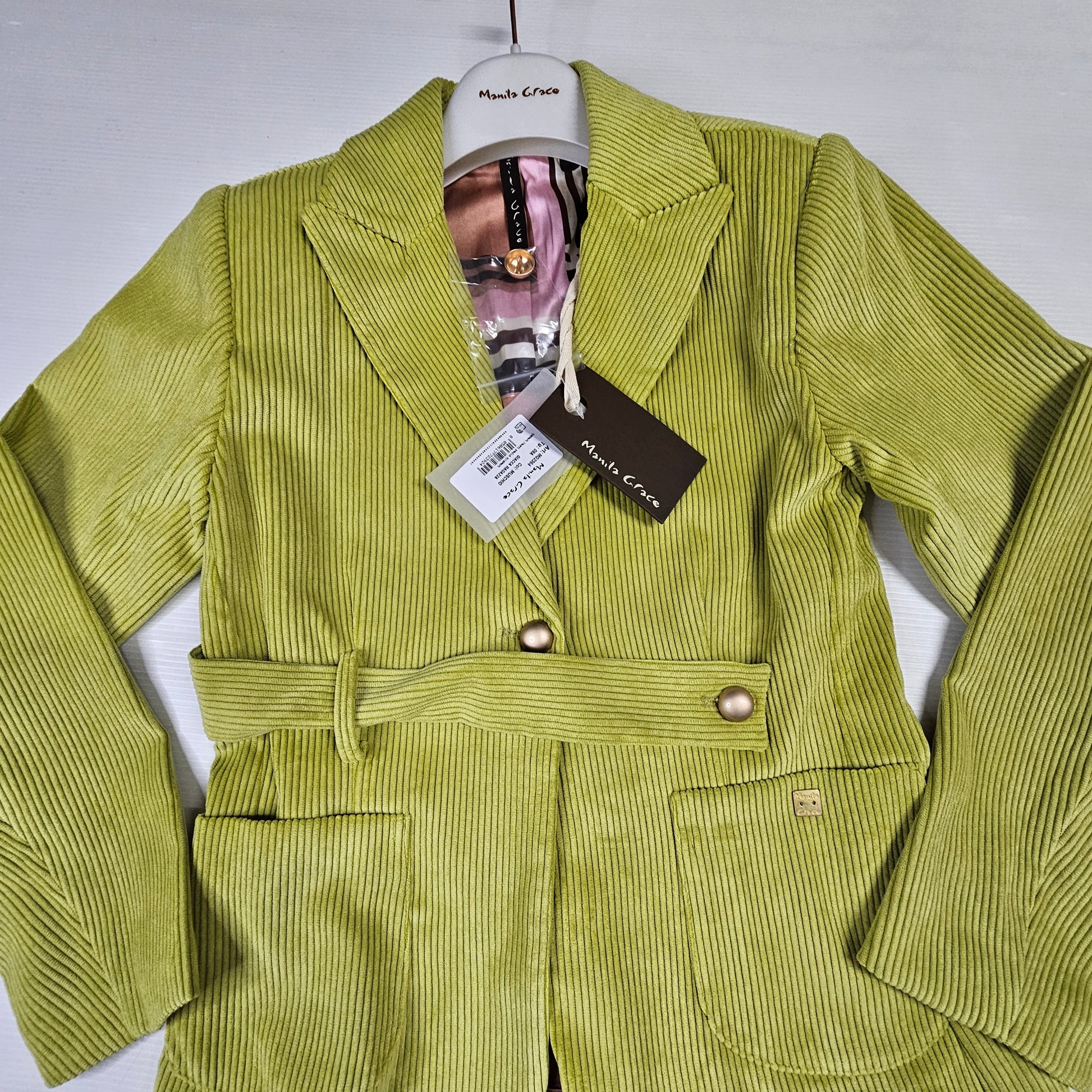Elegante blazer in velluto a coste color verde lime con cintura in vita e fodera interna stampata. Dotato di tasche frontali e chiusura con bottoni, è perfetto per look raffinati e di tendenza.