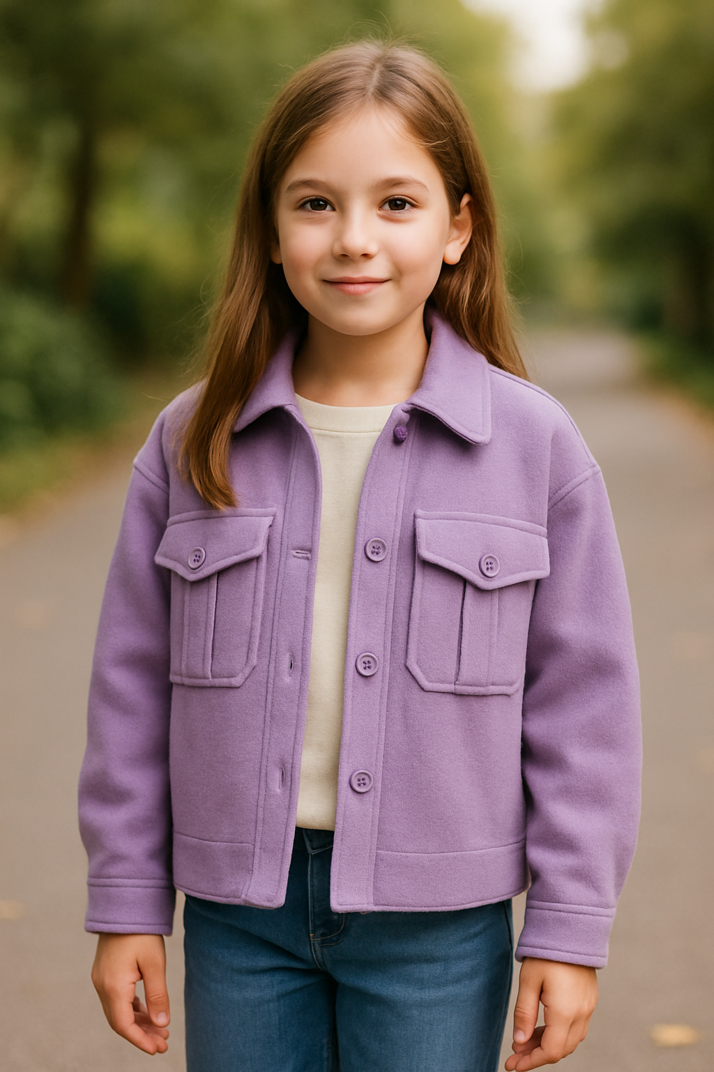 Camicia giacca in panno color lilla, dal taglio corto e moderno. Presenta due ampie tasche frontali con patta, chiusura con bottoni e piccolo logo metallico sul petto. Morbida, calda e perfetta per look casual chic.