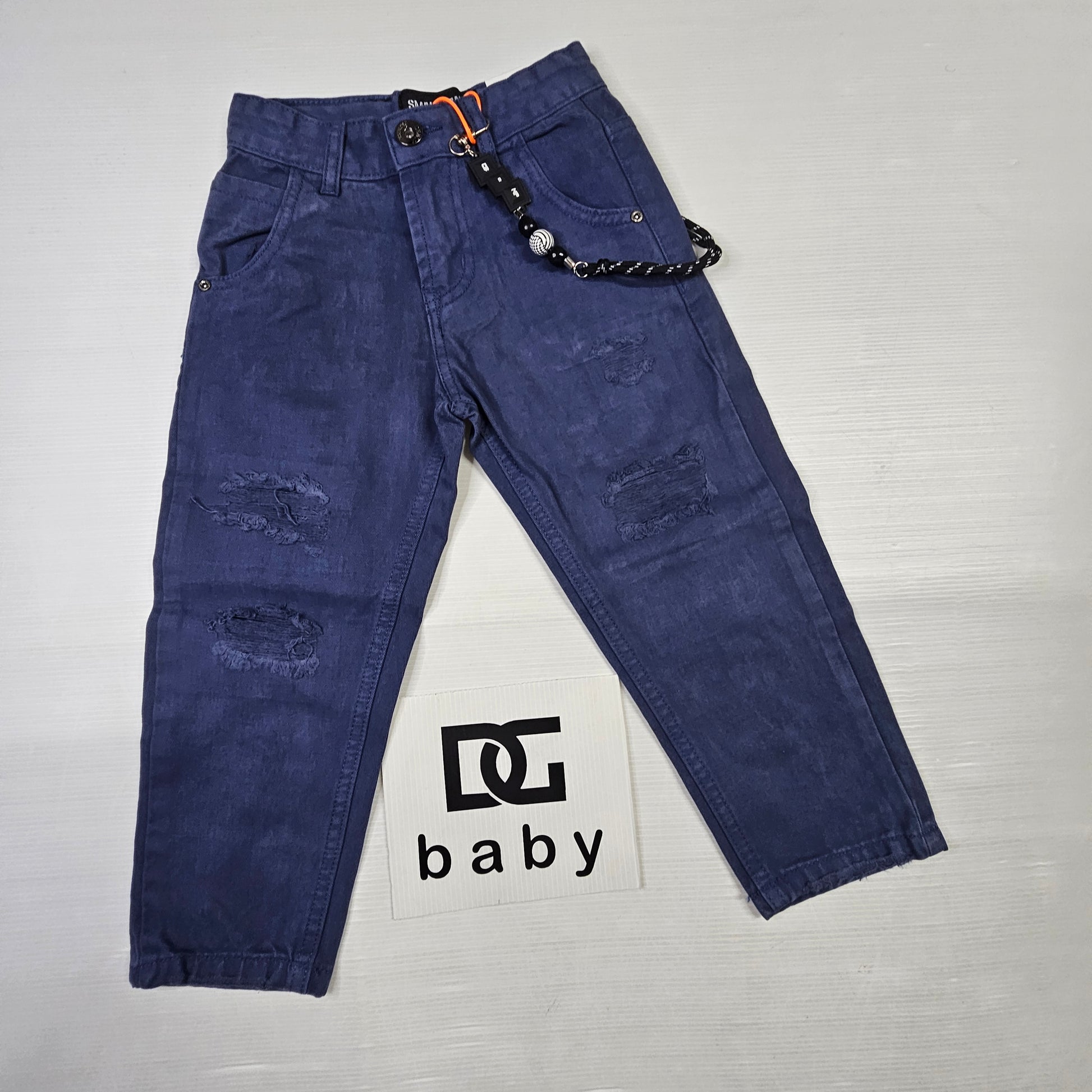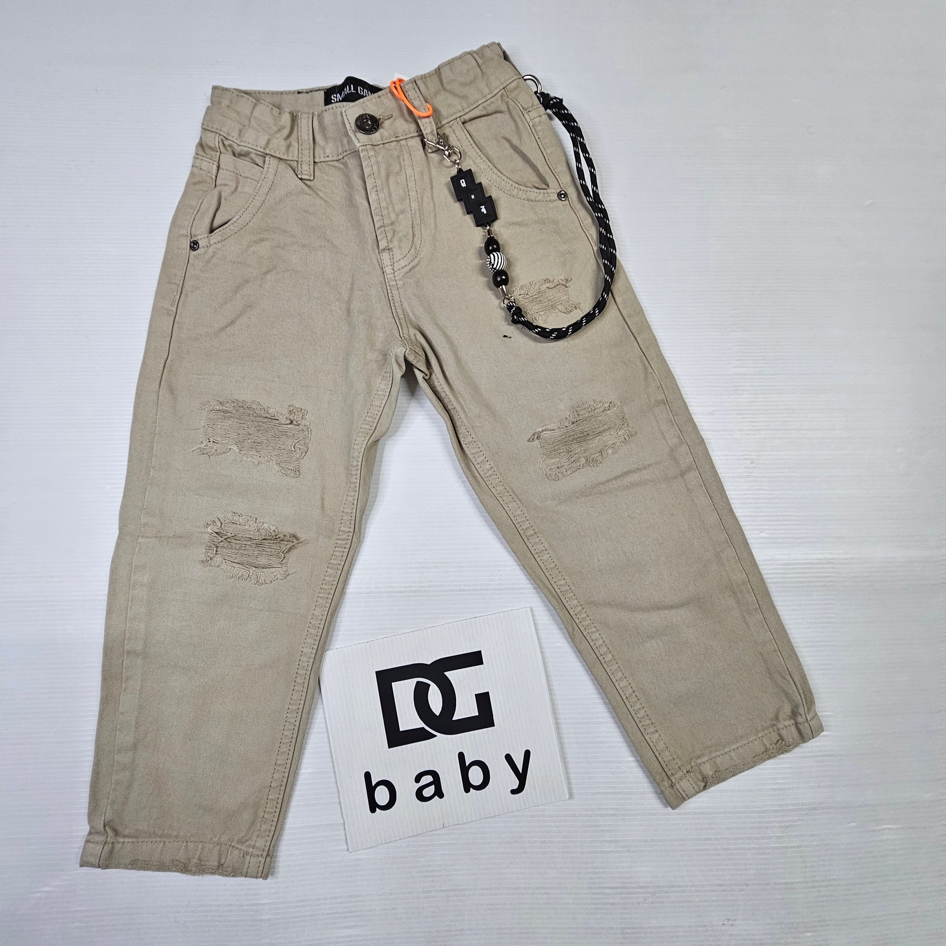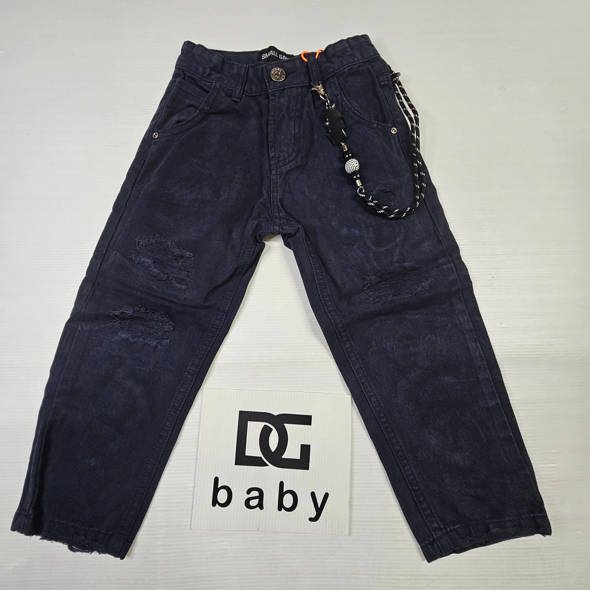Comodi e moderni pantaloni in cotone effetto denim, con dettagli strappati e catena decorativa removibile.