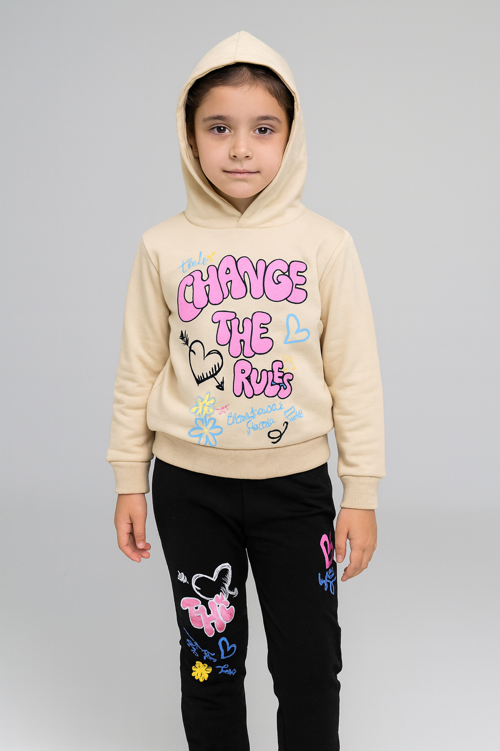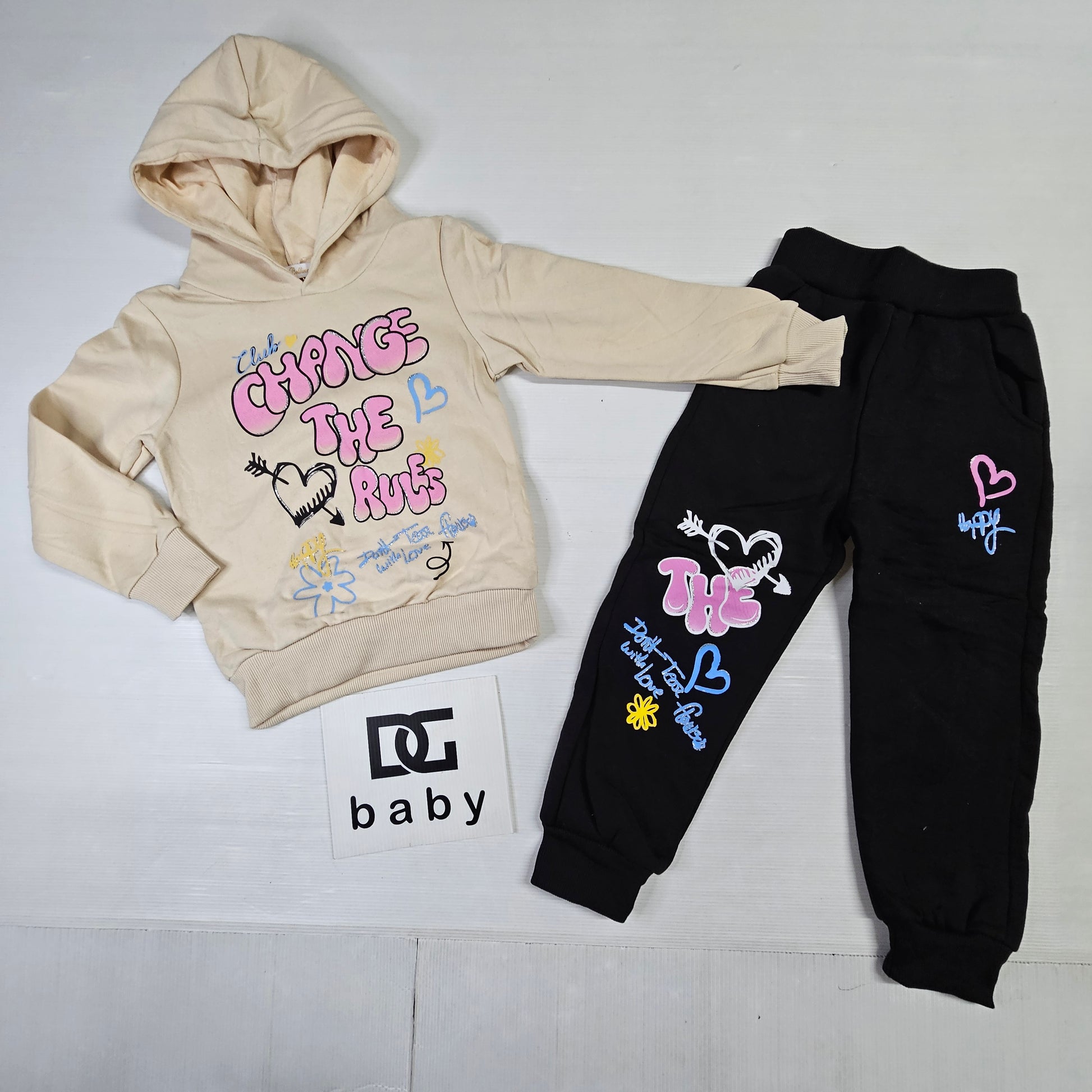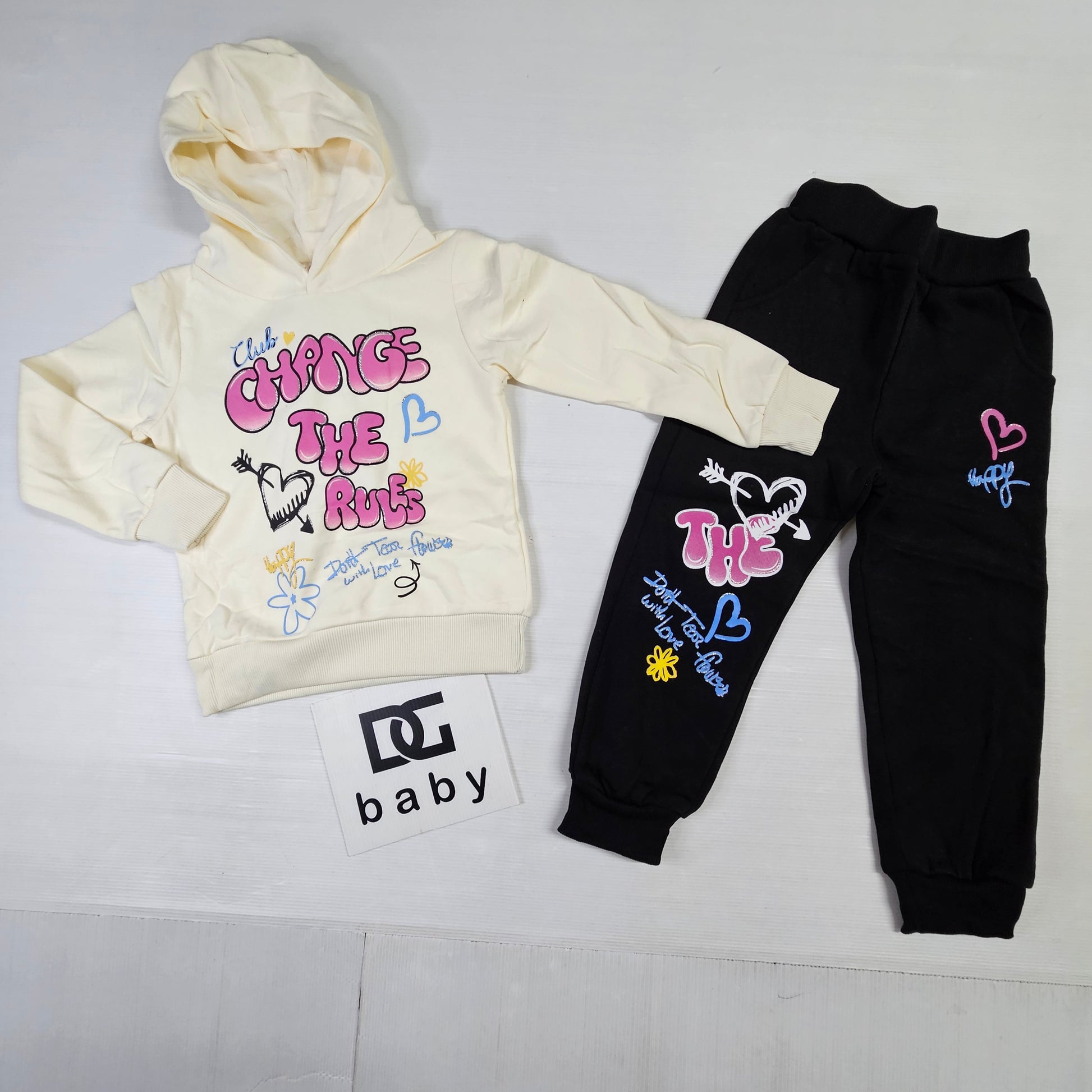 tuta bambina ragazza CHANGE  composta da maglia con cappuccio e pantatuta con scritte tutto felpato