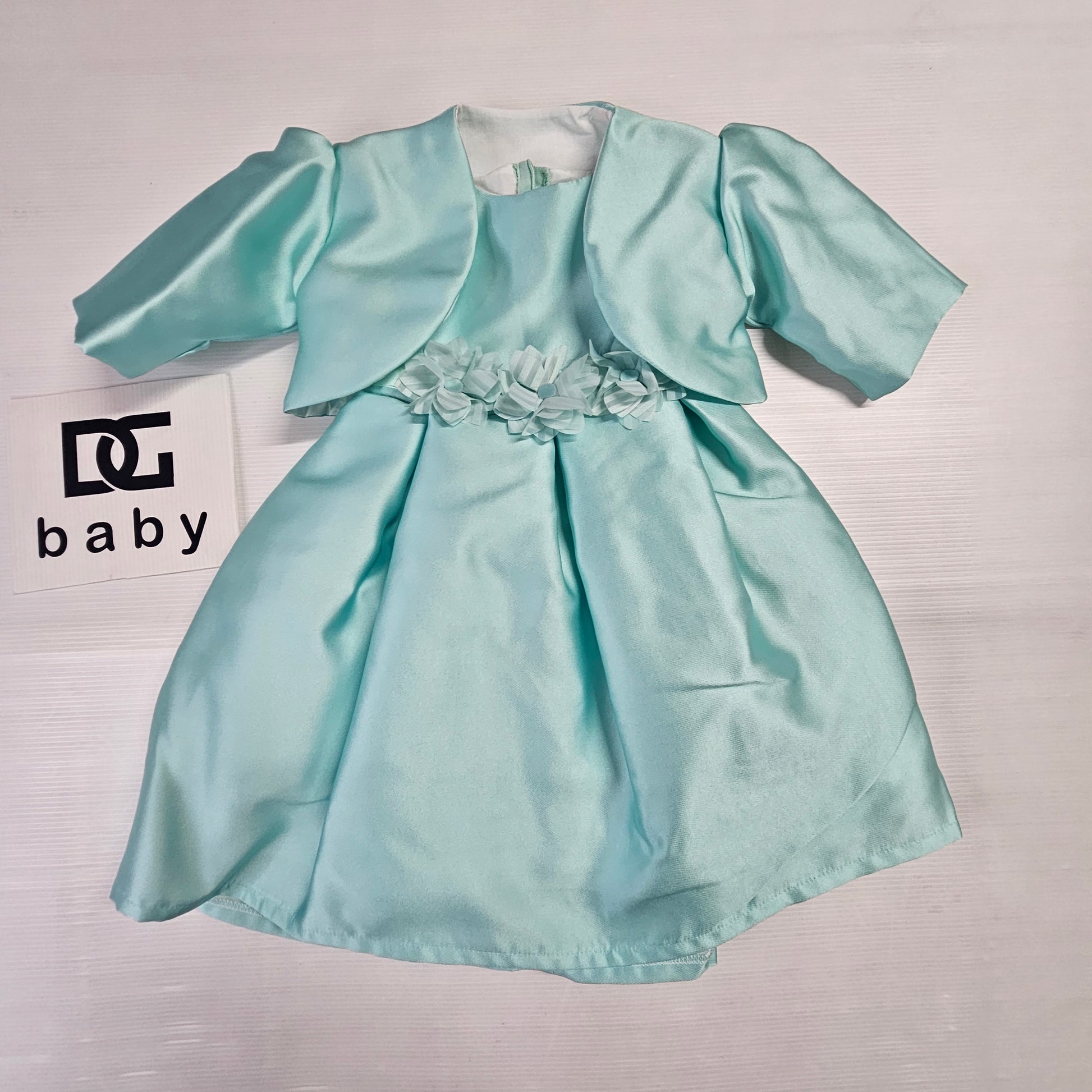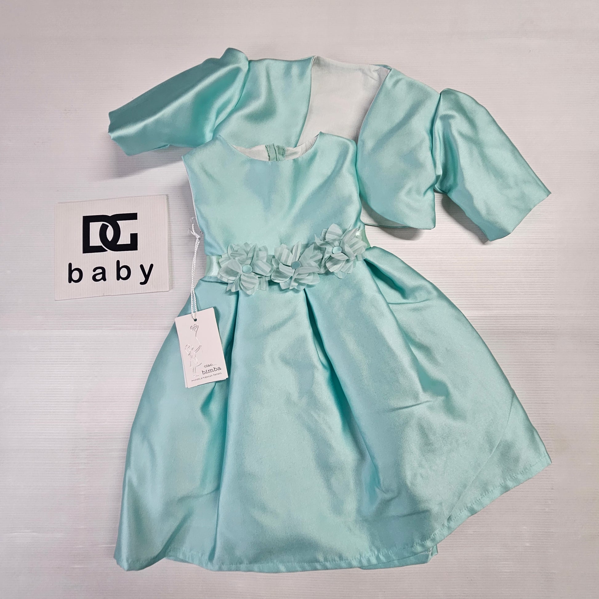 vestitino bambina CIAO BIMBA 2025 con fiori applicati sulla cintura e con coprispalle abbinato