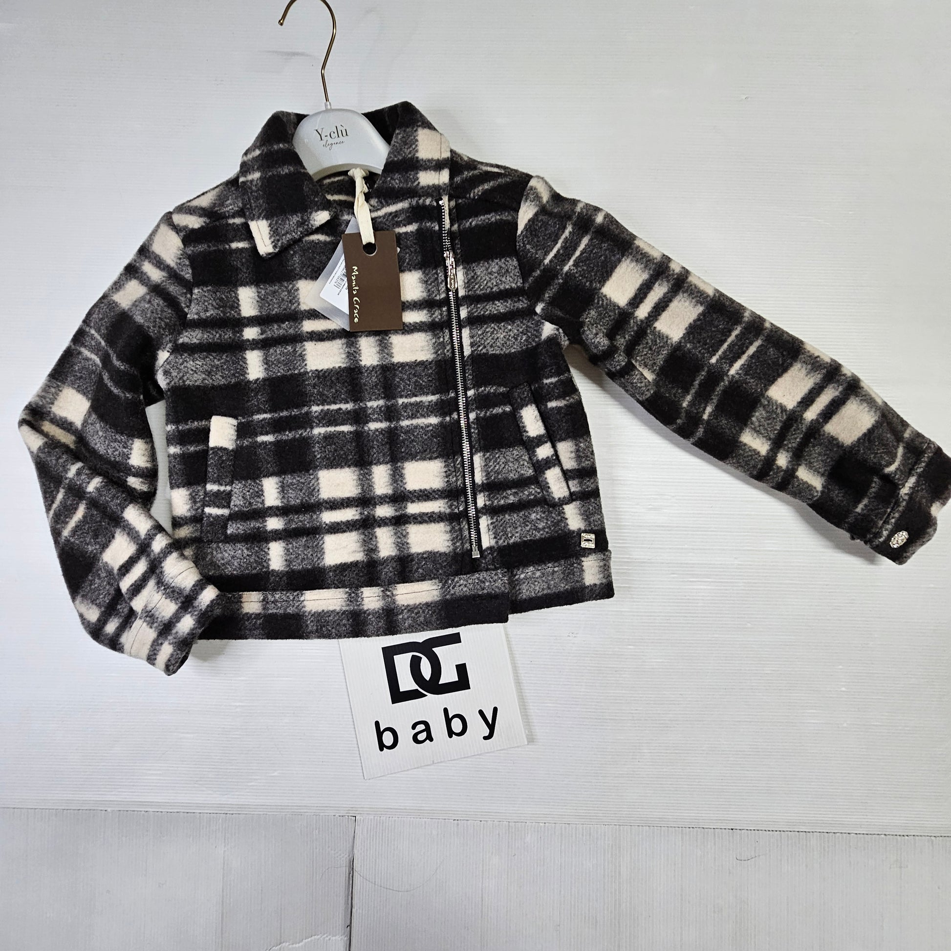 Giacca bambina QUADRI MGD2440 in morbido tessuto a quadri nei toni del nero e panna, con chiusura zip asimmetrica e tasche laterali. Calda, trendy e perfetta per la stagione autunnale.