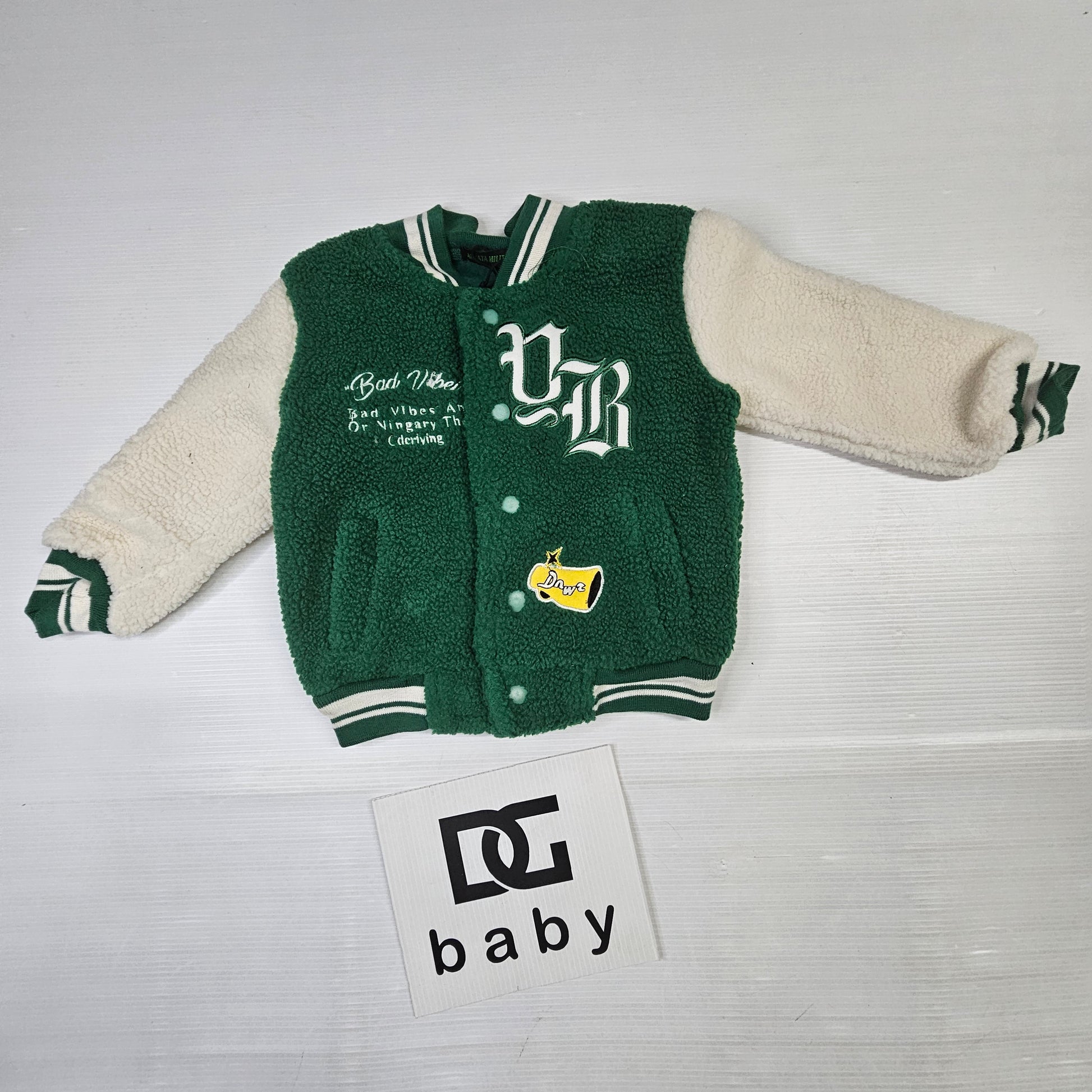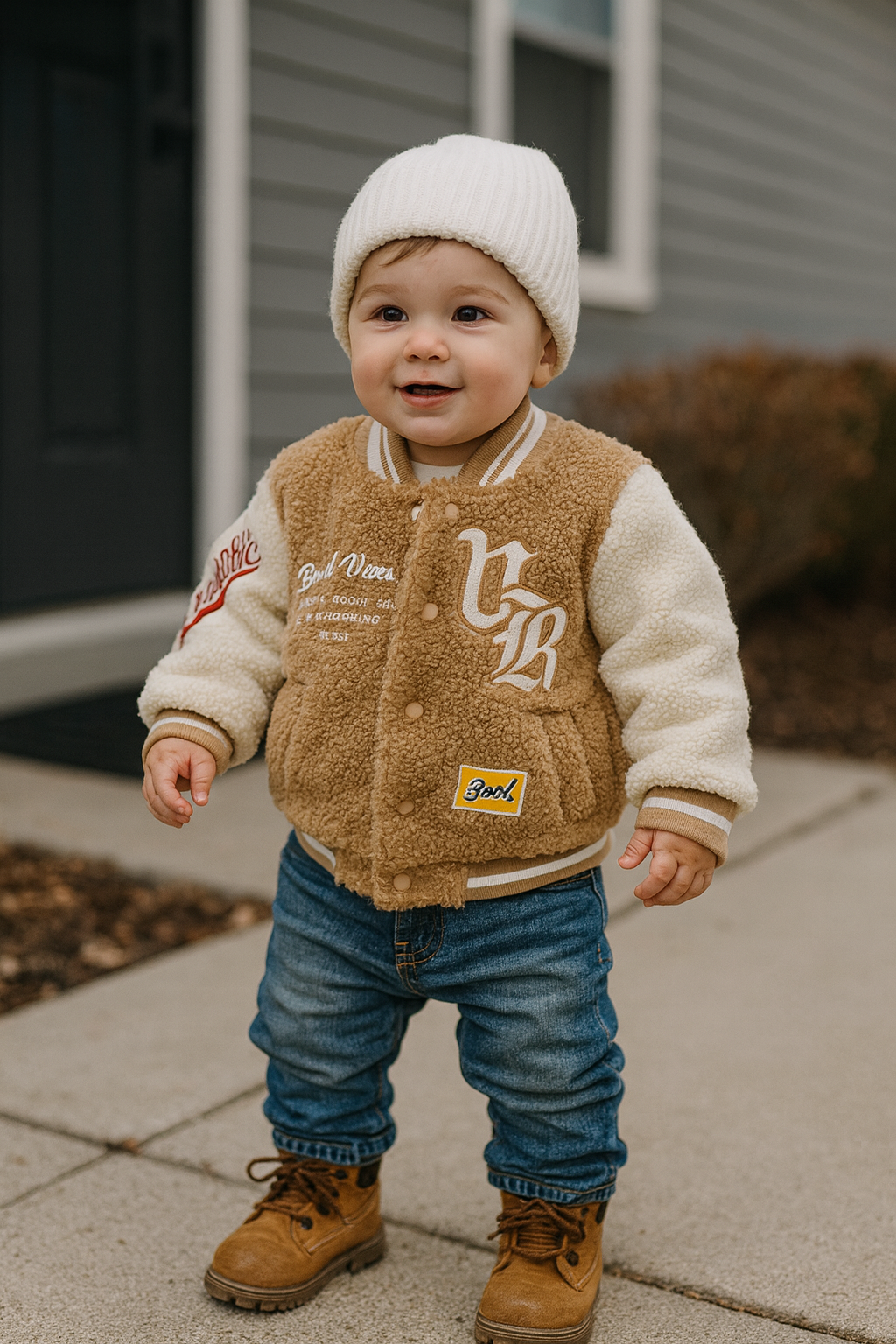 Giubbotto NEONATO COLLEGE TEDDY NEO stile college in morbido effetto peluche con maniche a contrasto, ricami sporty e chiusura con bottoni automatici. Disponibile in beige, nero e verde. Caldo, trendy e super comodo — perfetto per un look sportivo ma dolcissimo!