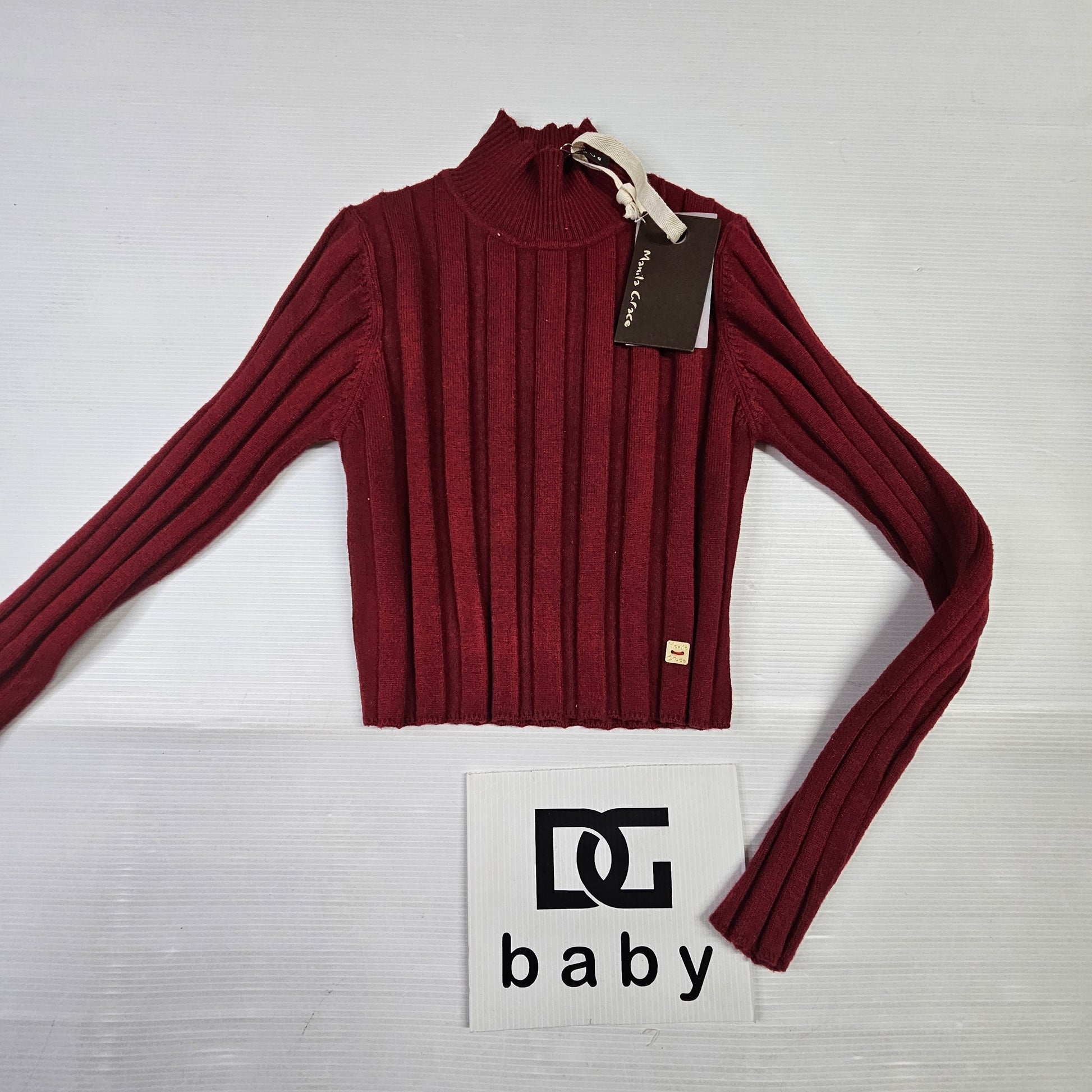 Elegante maglioncino a costine da ragazza, con collo leggermente alto e taglio corto moderno.