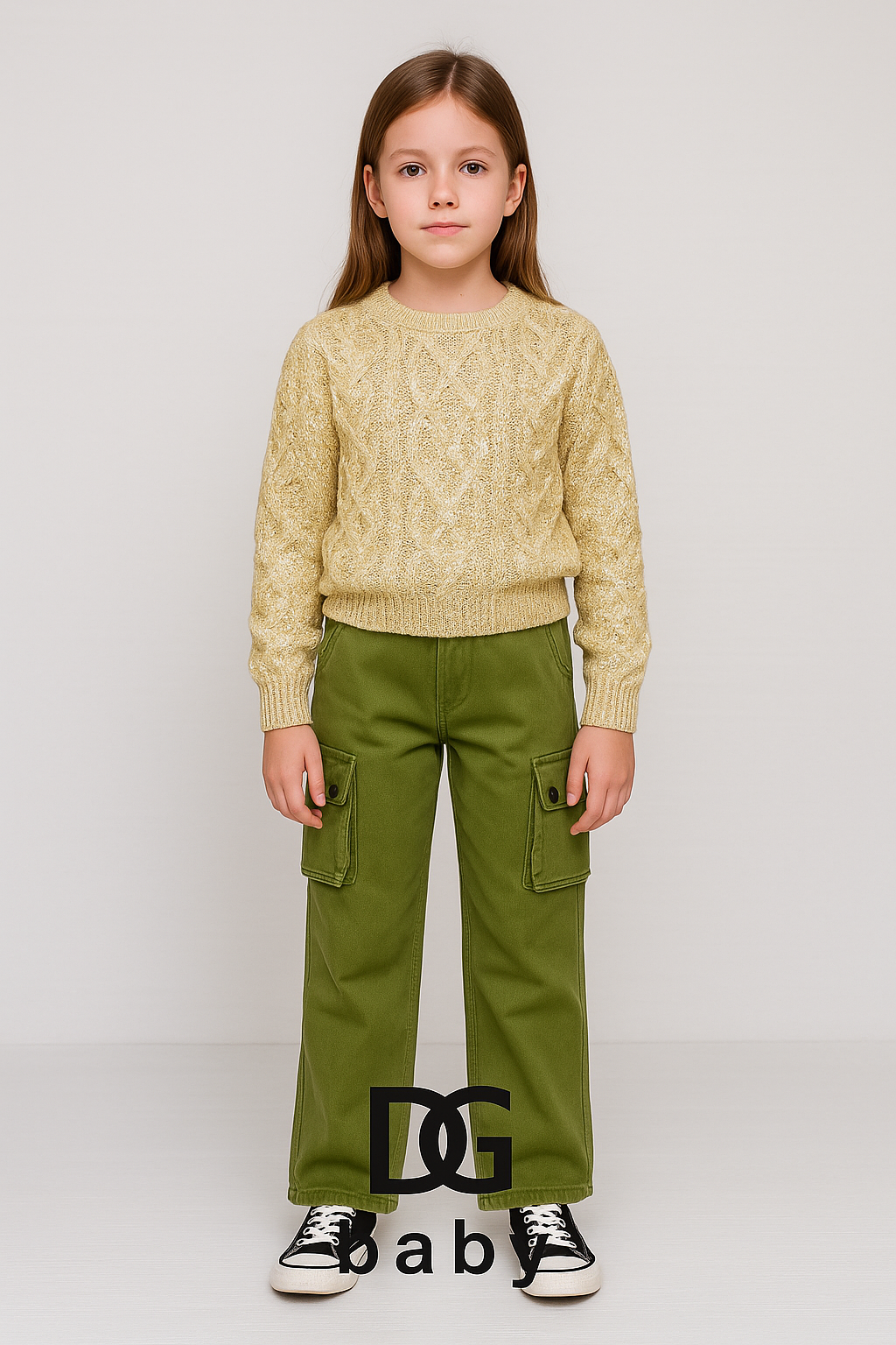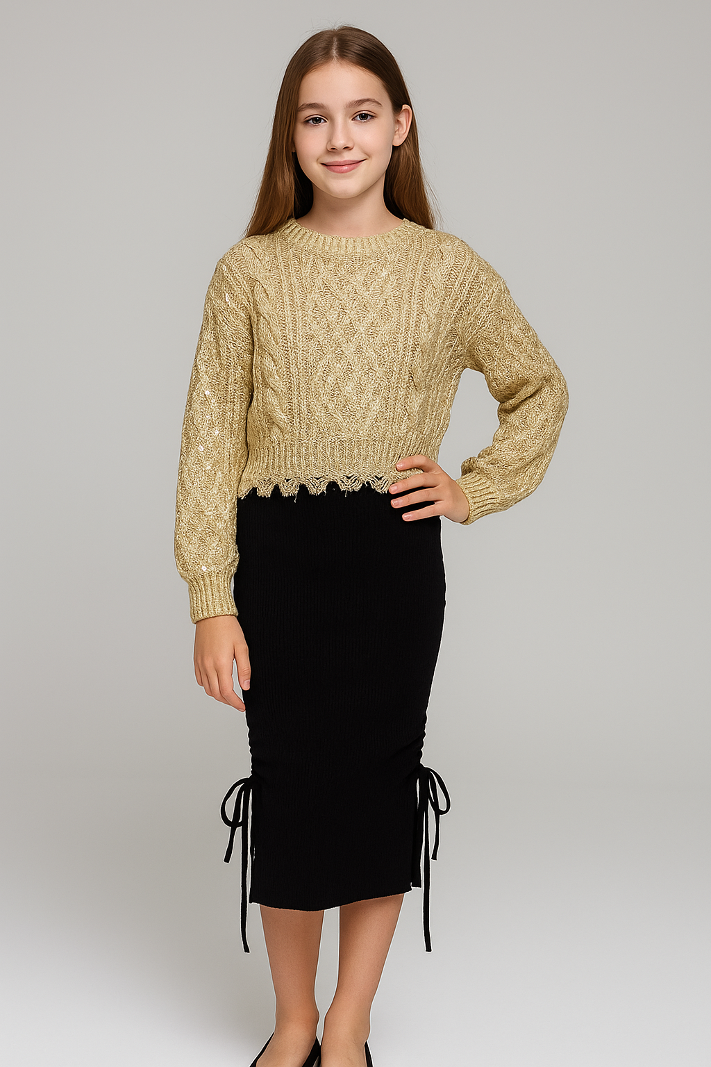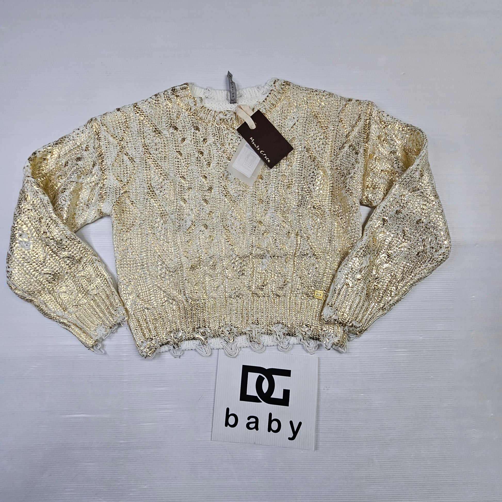 Raffinato maglioncino MANILA GRACE dorato con lavorazione a trecce luminose e finiture a bordo sfrangiato.