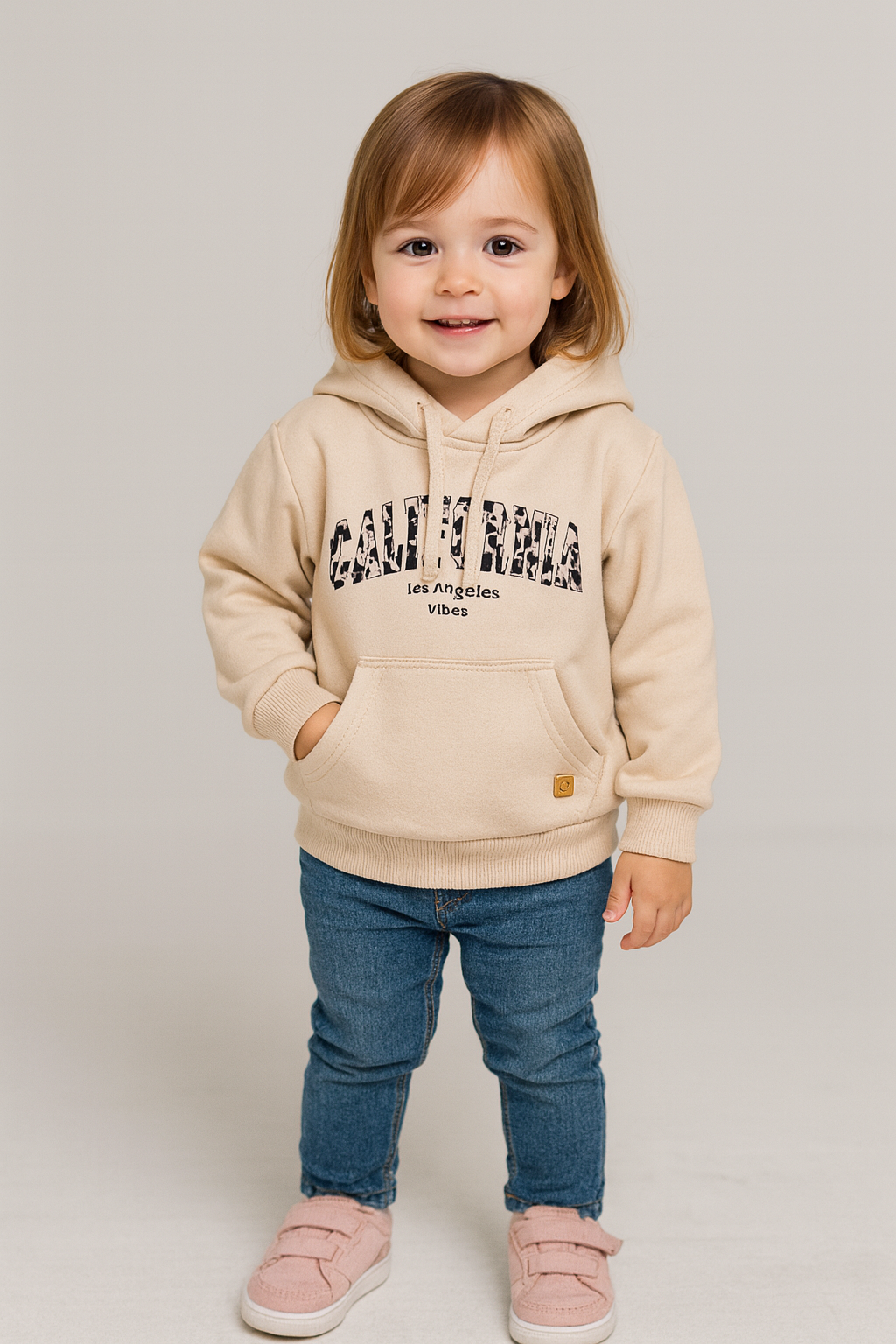 Felpa bimba in morbido cotone con cappuccio, logo California effetto animalier e tasca a marsupio. Polsini e fondo in costina per una vestibilità comoda e calda. Un capo casual chic, ideale per tutti i giorni.