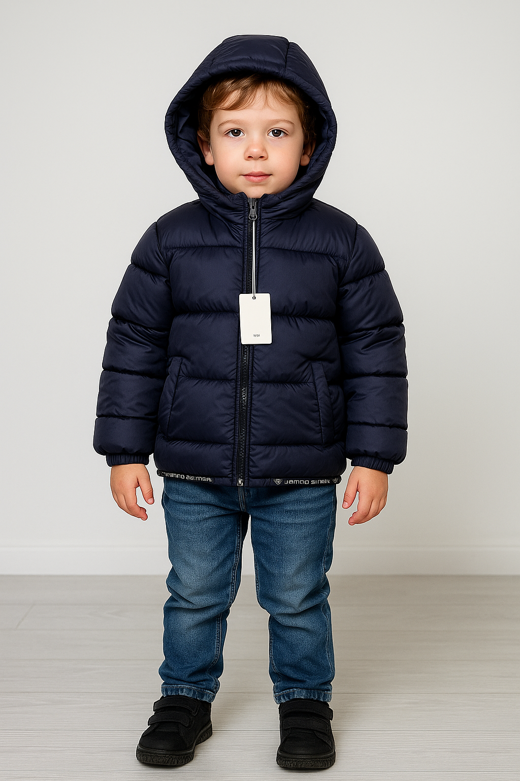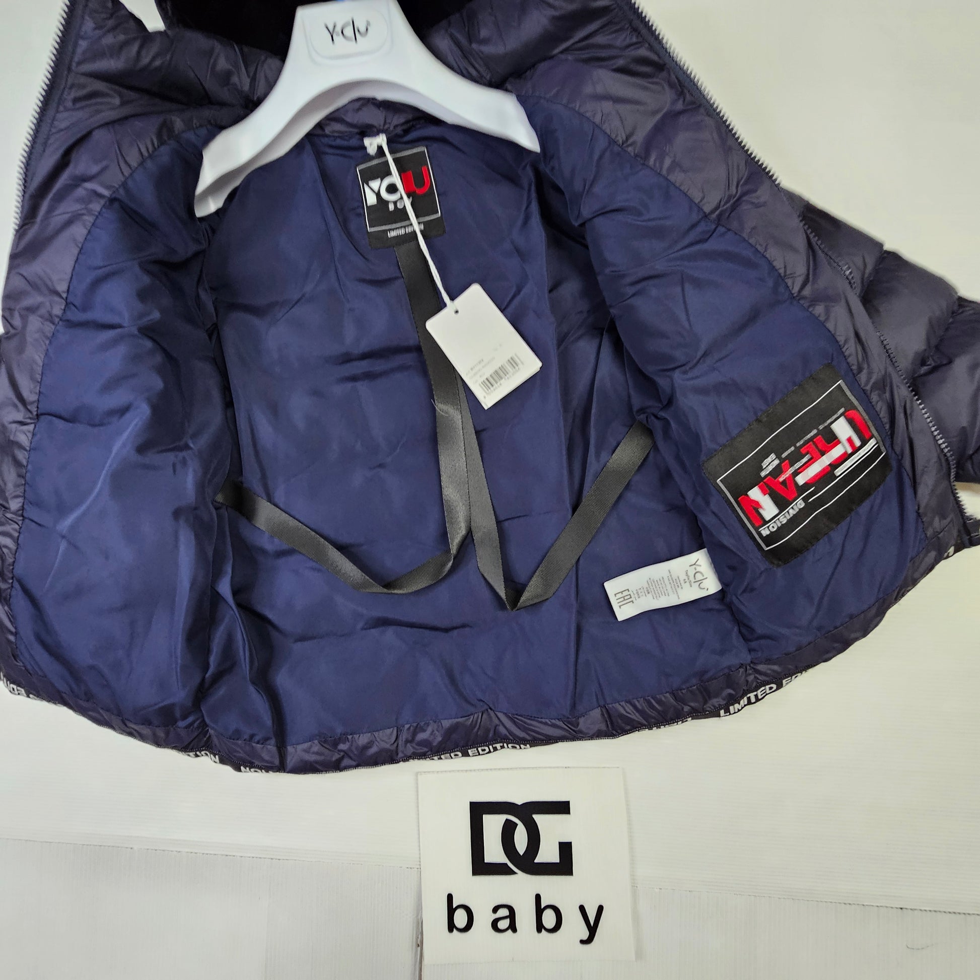 Piumino bambino ragazzo Y-CLU color blu navy con cappuccio, zip frontale e tasche laterali. Interno trapuntato con dettagli stampati “Limited Edition”. Caldo, leggero e pratico per ogni giorno.