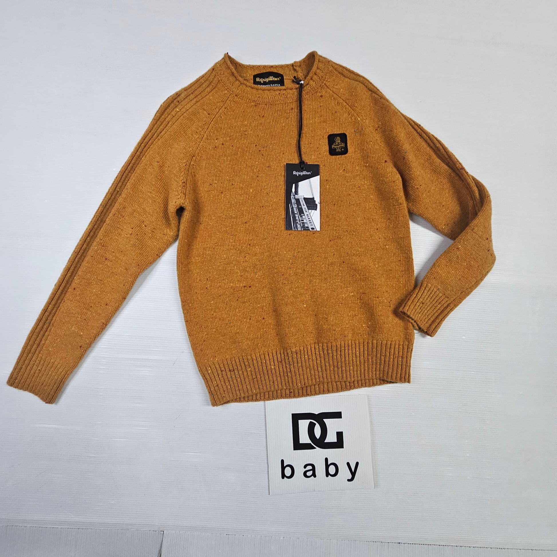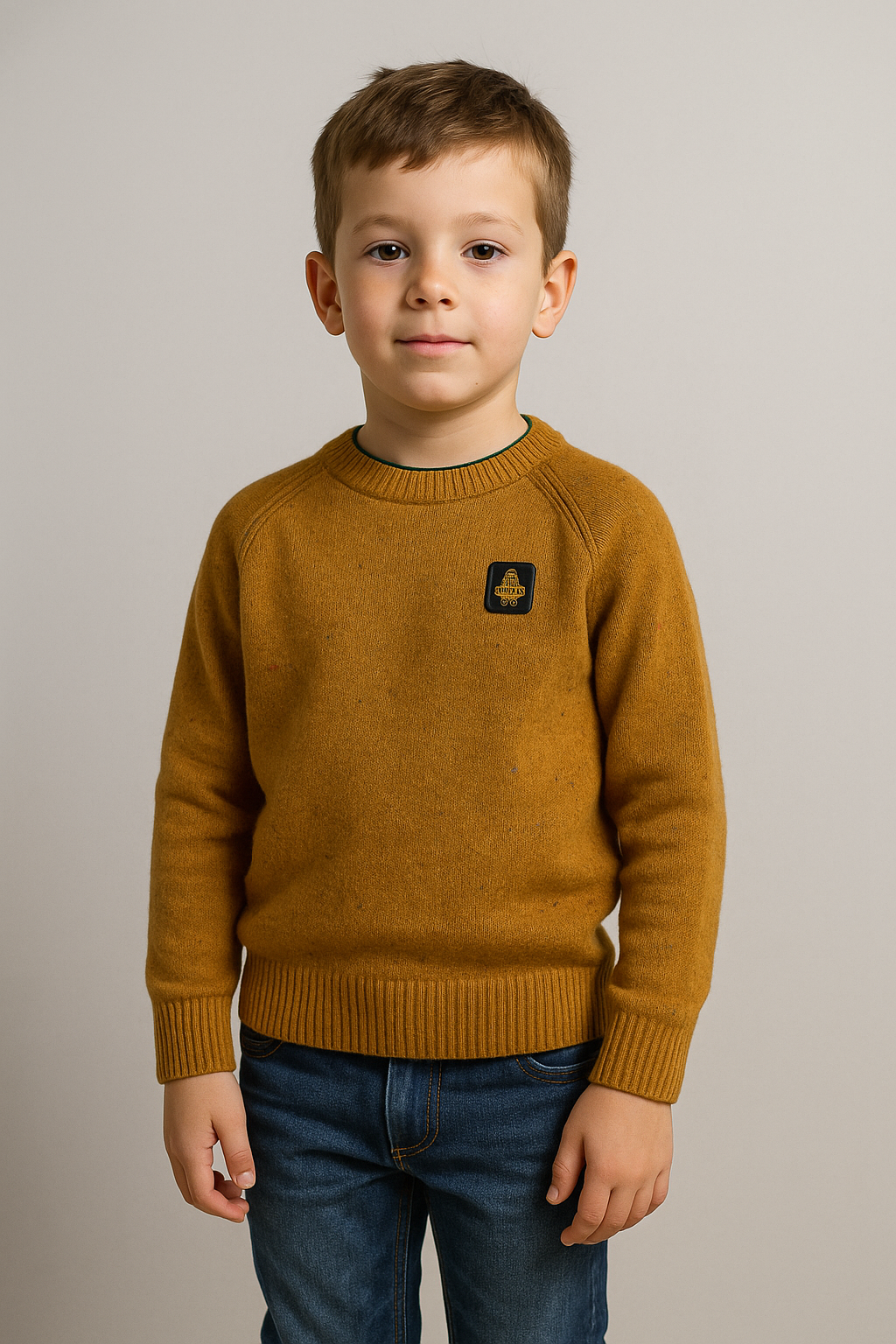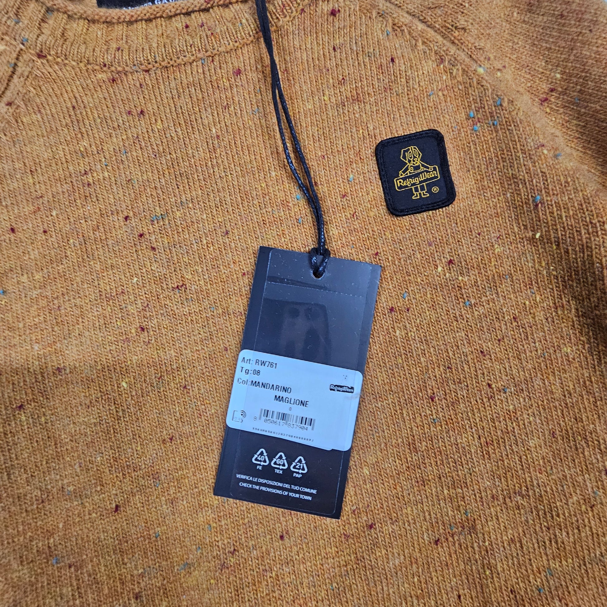 Maglione caldo e morbido in colore mandarino mélange, con piccole pagliuzze colorate per un effetto moderno e sofisticato. Logo applicato sul petto e lavorazione a maglia rasata, perfetto per look quotidiani dal tocco autunnale.