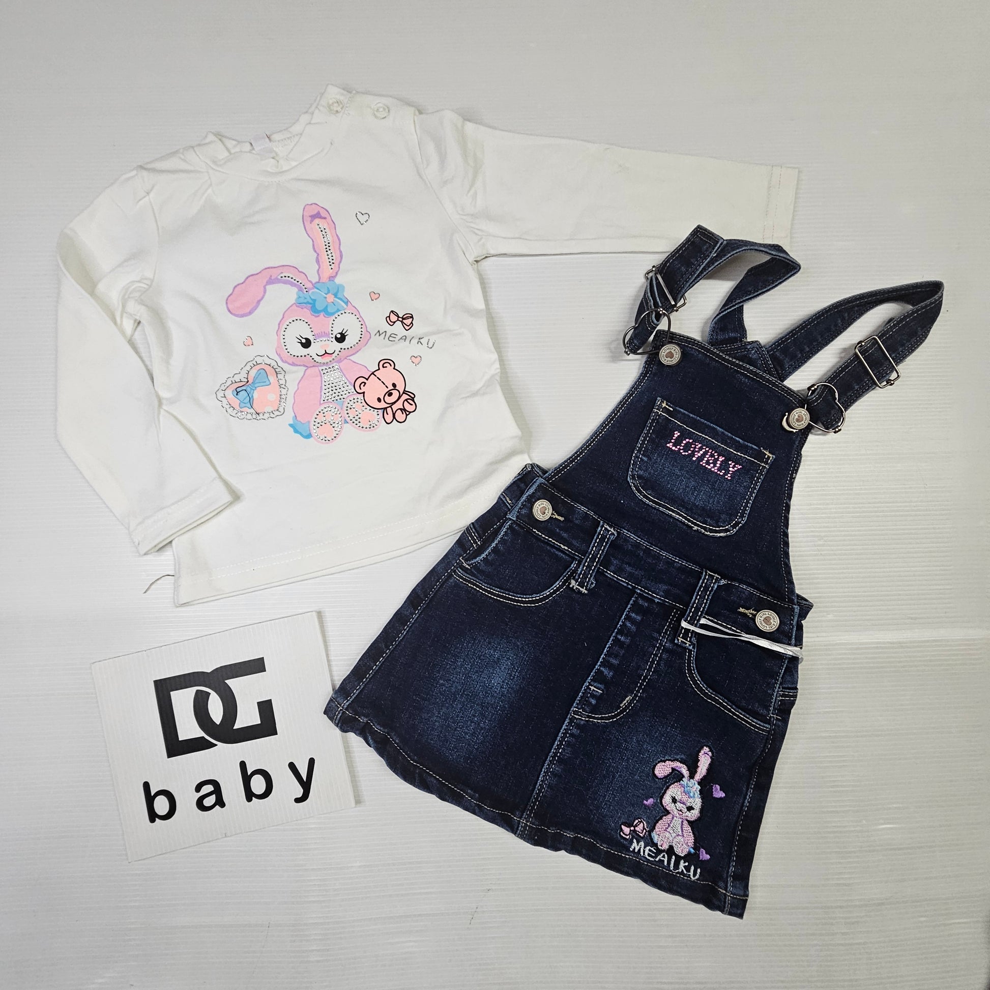 Delizioso completo neonata composto da maglia bianca a manica lunga con dolce stampa di coniglietta e orsetto e salopette in jeans con ricamo coordinato e scritta “Lovely”. Morbido, pratico e tenerissimo — perfetto per un look casual e dolce ogni giorno!