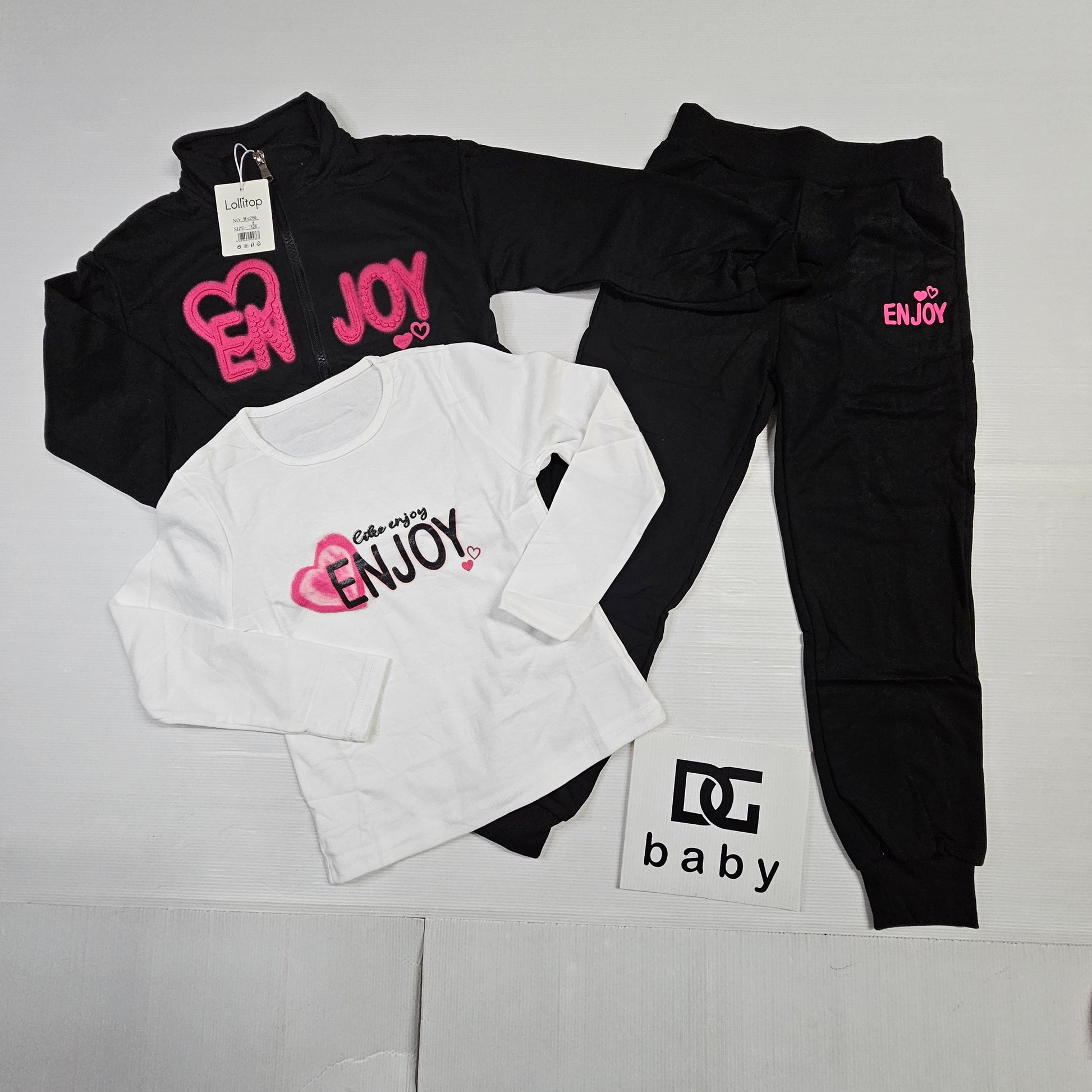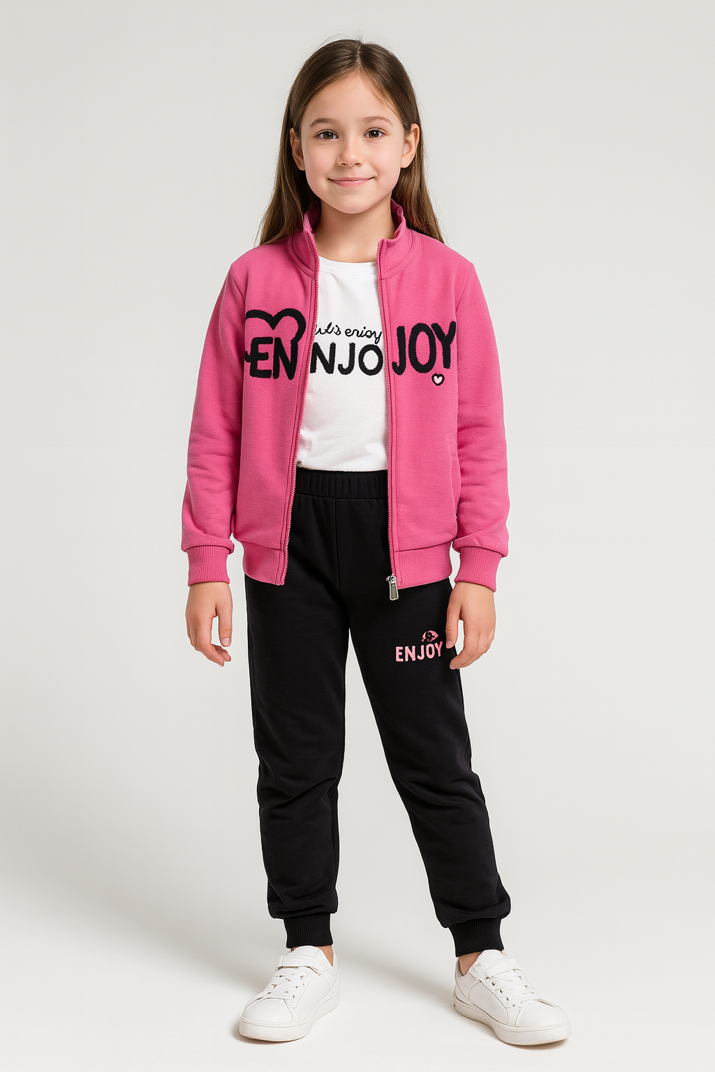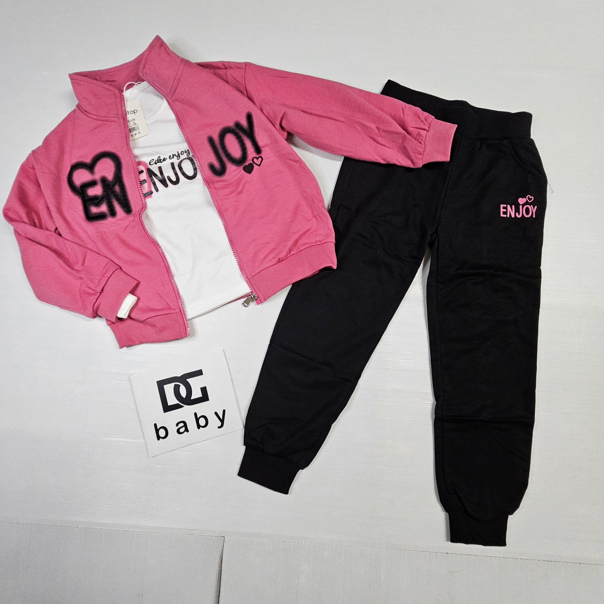Completo 3 pezzi con felpa full zip, maglia manica lunga e pantalone in caldo cotone. Stampa ENJOY con cuoricini, morbida e comoda per tutti i giorni.