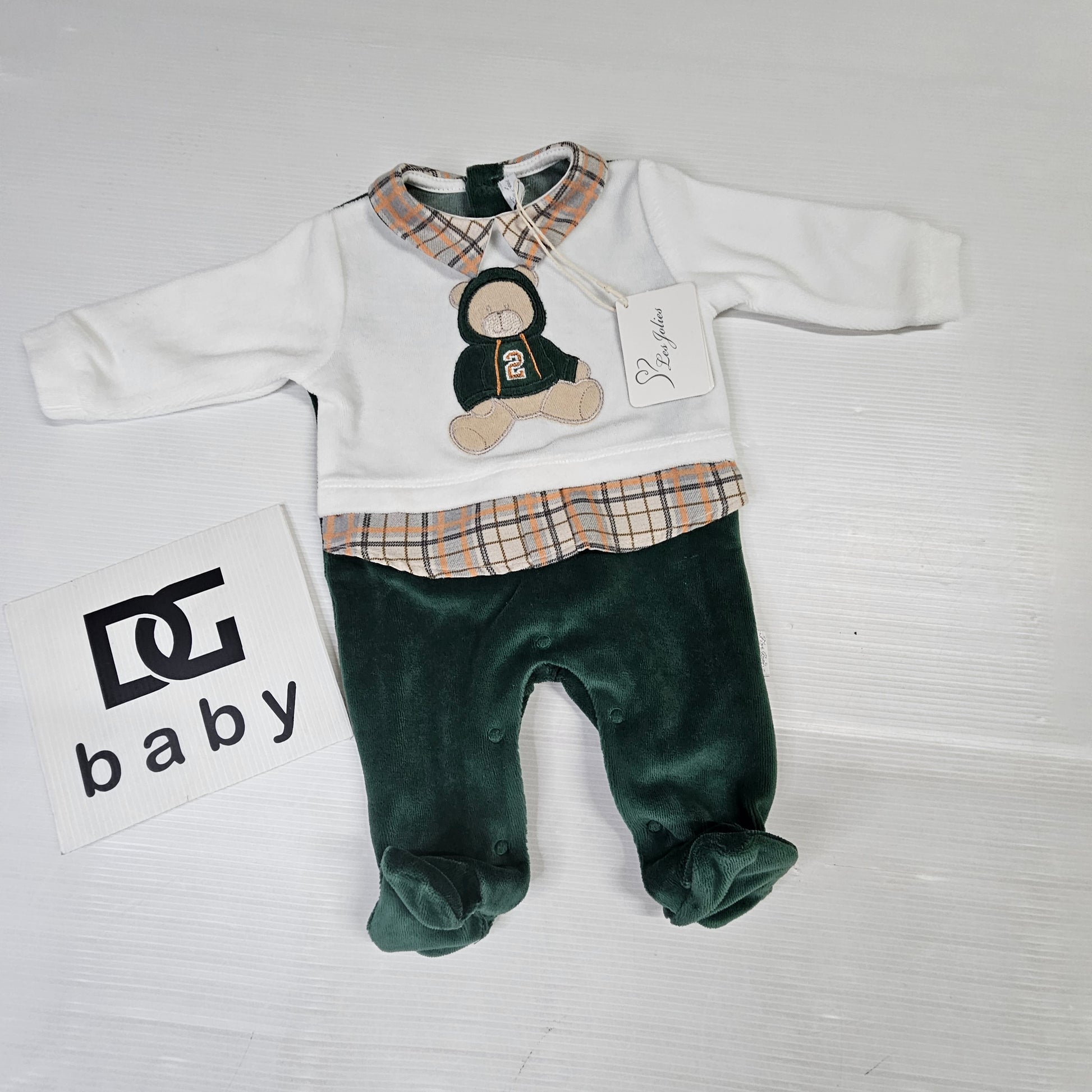 Morbida tutina maschietto firmata Les Jolies, in calda ciniglia verde e panna con dettagli in stoffa scozzese beige e verde.