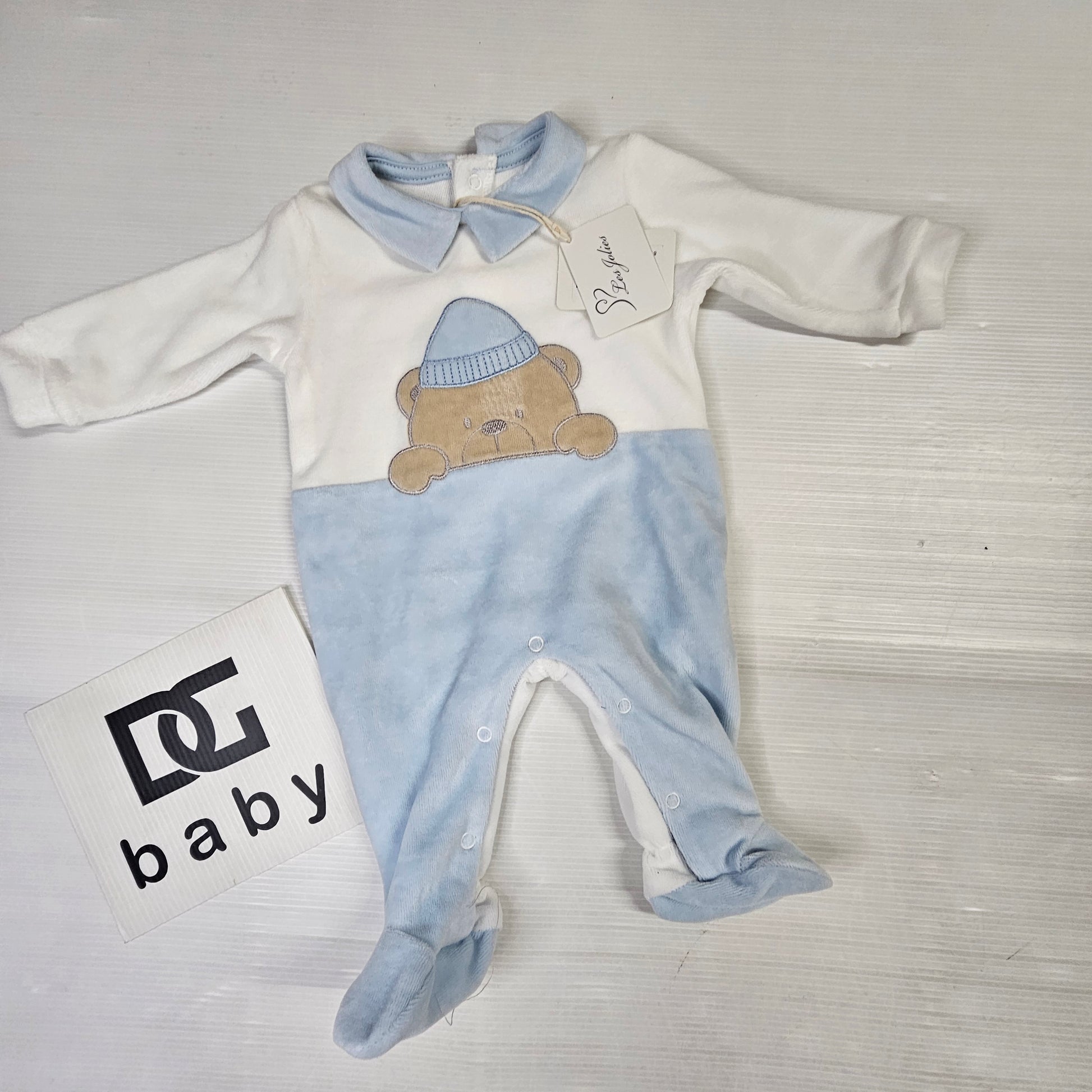 Dolcissima tutina maschietto firmata Les Jolies, realizzata in morbida ciniglia color cielo e panna.
