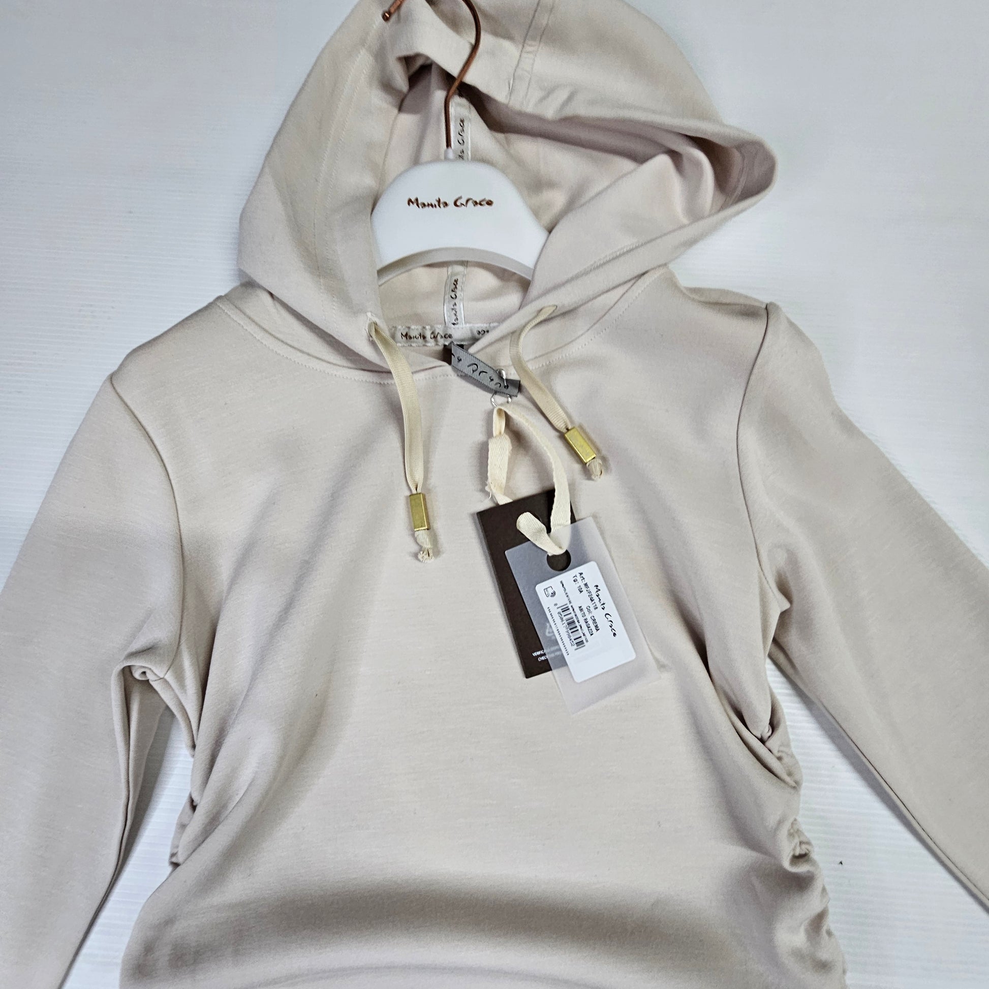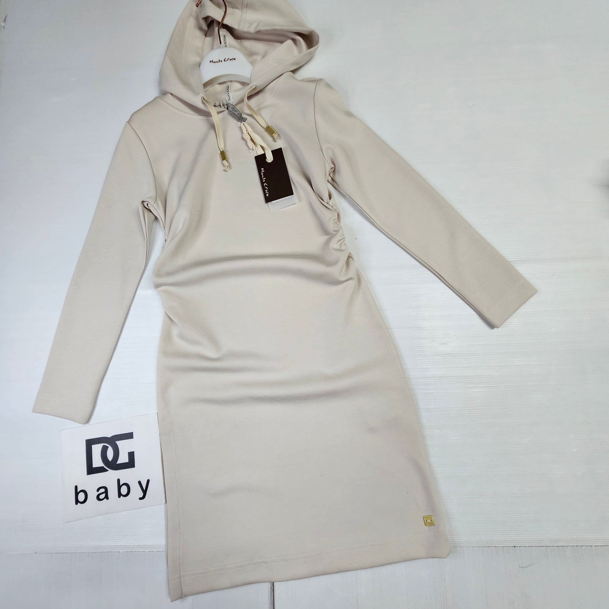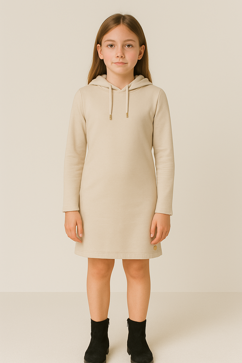 Abito beige con cappuccio, realizzato in morbido tessuto stretch. Presenta arricciatura laterale, spacchetto sul fondo e dettagli dorati. Comodo e moderno, perfetto per un look casual chic.